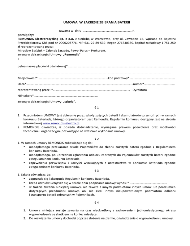 UMOWA W ZAKRESIE ZBIERANIA BATERII zawarta w dniu ………………….………………………………...r. pomiędzy: REMONDIS Electrorecycling Sp. z o.o. z siedzibą w Warszawie, przy ul. Zawodzie 16, wpisaną do Rejestru Przedsiębiorców KRS pod nr 0000208776, NIP 631-‐22-‐89-‐539, Regon 276730380, kapitał zakładowy 1 751 250 zł reprezentowaną przez: Mirosław Baściuk – Członek Zarządu, Paweł Palus – Prokurent, zwaną w dalszej części Umowy „Remondis” a pełna nazwa placówki oświatowej*…………………………………………………………………………………………………………………. ………………………………………………………………………………………………………………………………………………………………………. Miejscowość*……………………………………………………………………………kod pocztowy*……………………………………………….. Ulica*……………………………………………………………………………………………………………………numer*……………….................. reprezentowaną przez: *…………………..……………………………………………………………… -‐ Dyrektora NIP szkoły*……………………………………………………………………. zwaną w dalszej części Umowy „szkołą”. § 1 1. Przedmiotem UMOWY jest zbieranie przez szkołę zużytych baterii i akumulatorów przenośnych w ramach konkursu Bateriada, którego organizatorem jest Remondis. Regulamin konkursu dostępny jest na stronie internetowej www.remondis-‐electro.pl. 2. REMONDIS oświadcza, iż posiada doświadczenie, wymagane prawem pozwolenia oraz możliwości techniczne i organizacyjne pozwalające na właściwe wykonanie umowy. § 2 1. W ramach umowy REMONDIS zobowiązuje się do: • nieodpłatnego przekazania szkole Pojemników do zbiórki zużytych baterii zgodnie z Regulaminem konkursu Bateriada, • nieodpłatnego, po uprzednim zgłoszeniu odbioru zebranych do Pojemników zużytych baterii zgodnie z Regulaminem konkursu Bateriada, • zapewnienia przywilejów i korzyści wynikających z uczestnictwa w Konkursie Bateriada zgodnie z regulaminem konkursu Bateriada. § 3 1. Szkoła oświadcza, że: • zapoznała się i akceptuje Regulamin konkursu Bateriada, • liczba uczniów uczących się w szkole dniu podpisania umowy wynosi * ………………………………………. • w trakcie trwania niniejszej umowy, nie zawrze z innymi podmiotami innych umów lub porozumień dotyczących przedmiotu umowy, ani nie zleci innym nieupoważnionym podmiotom odbioru i transportu baterii zebranych w Pojemnikach. § 4 1. Umowa niniejsza zostaje zawarta na czas nieokreślony z zachowaniem jednomiesięcznego okresu wypowiedzenia ze skutkiem na koniec miesiąca. 2. Do rozwiązania umowy dochodzi poprzez złożenie na piśmie, oświadczenia o wypowiedzeniu umowy. 3. Osobą upoważniona ze strony szkoły do kontaktu w celu realizacji przedmiotowej umowy jest Pan/Pani*………….………………………………………………………………………………………………………………………………… funkcja*…..……………………………………………………………………………………………………………………………………… e-‐mail:*…………………………………………………….......................... tel. *…………………………………………………… 4. W przypadku zmiany osoby upoważnionej do kontaktu szkoła niezwłocznie poinformuje Remondis o tym fakcie droga e-‐mail na adres: [email protected]. 5. Adres do korespondencji ze strony Remondis: ul. Ekologiczna 2, 05-‐870 Błonie, z dopiskiem„Bateriada”. Remondis pieczątka i podpis Dyrektora • proszę uzupełnić wykropkowane miejsca Powiadomienie o ilości zebranych baterii fax. 22 205 04 06 adres: [email protected] Miejsce odbioru: pełna nazwa placówki oświatowej……………………………………………………………………………………………………….. …………………………………………………………………………………………………………………………………………………………….. miejscowość……………………………………………………………………………kod pocztowy……………………………………… ulica……………………………………………………………………………………………..numer………………............................... Osoba kontaktowa Pan/Pani………….………………………………………………………………………………………………………………………………….. funkcja…..………………………………………………………………… e-‐mail:…………………………………….. tel. ………………… Ilość pojemników do odbioru: …………………………….. szt. Szacowna ilość kg do odbioru: ……………………………. (pojemnik kartonowy pojemność ok. 20 kg baterii) Możliwe godziny odbioru: …………………………………….. Uwagi:………………………………………………………………………………………………………………………………………………………………… …………………………………………………………………………………………………………………………………………… Data i podpis :…………………………………………………..