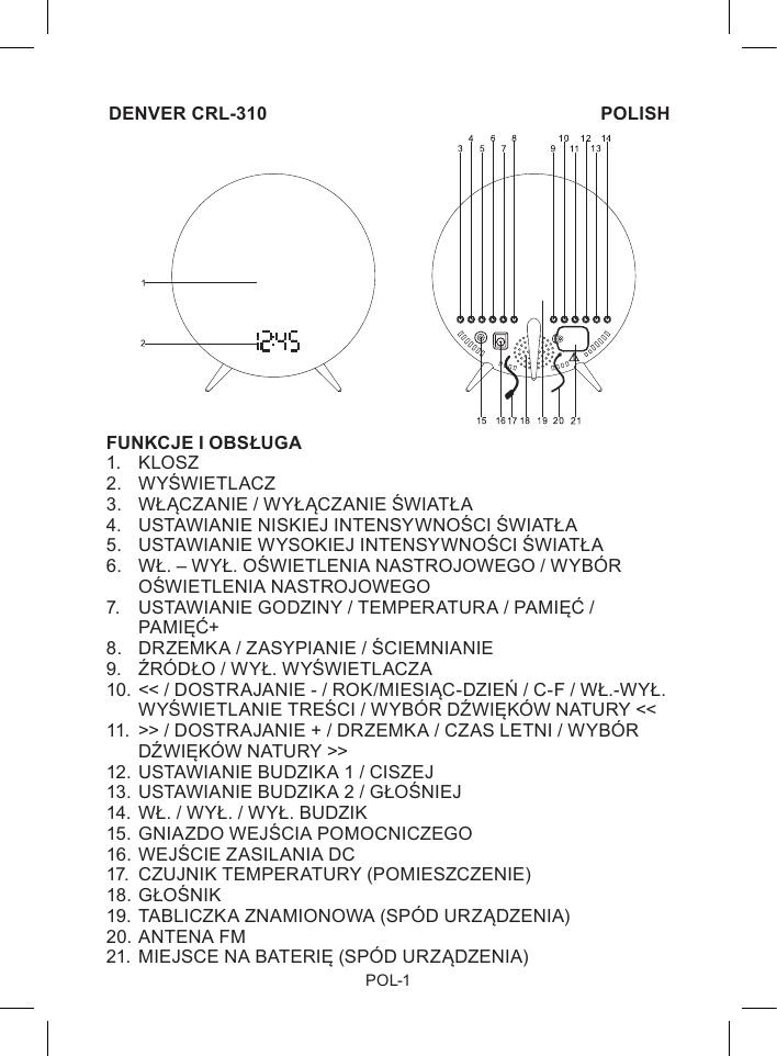 polish denver crl-310 funkcje i obsługa 1. klosz 2. wyświetlacz 3