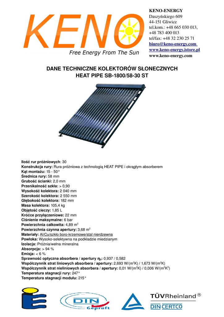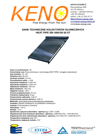 KENOENERGY Daszyńskiego 609 44151 Gliwice tel.kom.: +48 665 030 013, +48 783 400 013 tel/fax: +48 32 230 25 71 biuro@kenoenergy.com www.kenoenergy.istore.pl www.kenoenergy.com DANE TECHNICZNE KOLEKTORÓW SŁONECZNYCH HEAT PIPE SB1800/5830 ST Ilość rur próżniowych: 30 Konstrukcja rury: Rura próżniowa z technologią HEAT PIPE i okrągłym absorberem Kąt montażu: 15 50° Średnica rury: 58 mm Grubość ścianki: 2,0 mm Przenikalność szkła: > 0,90 Wysokość kolektora: 2 040 mm Szerokość kolektora: 2 550 mm Głębokość kolektora: 182 mm Masa kolektora: 105,4 kg Objętość cieczy: 1,85 L Króćce przyłączeniowe: 22 mm Ciśnienie maksymalne: 6 bar Powierzchnia całkowita: 4,89 m2 Powierzchnia czynna apertury: 3,68 m2 Materiały: Al/Cu/szkło borokrzemowe/stal nierdzewna Powłoka: Wysokoselektywna na podkładzie miedzianym Izolacja: Próżnia/wełna mineralna Absorpcja: > 94 % Emisja: < 6 % Sprawność optyczna absorbera / apertury η0: 0,937 / 0,582 Współczynnik strat liniowych absorbera / apertury: 2,693 W/(m2K) / 1,673 W/(m2K) Współczynnik strat nieliniowych absorbera / apertury: 0,01 W/(m2K) / 0,006 W/(m2K2) Temperatura stagnacji rury: 247° Temperatura stagnacji modułu: 215°