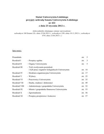 Statut Uniwersytetu Łódzkiego przyjęty uchwałą Senatu Uniwersytetu Łódzkiego nr 422 z dnia 23 stycznia 2012 r. (tekst jednolity obejmujący zmiany wprowadzone: uchwałą nr 160 Senatu UŁ z dnia 22.04.2013 r.; uchwałą nr 230 z dnia 18.11.2013 r.; uchwałą nr 470 z dnia 13.04.2015 r. ) Spis treści: Preambuła str. 2 Rozdział I – Przepisy ogólne str. 3 Rozdział II – Organy Uniwersytetu str. 5 Rozdział III – Tryb zwoływania posiedzeń i tryb pracy organów kolegialnych Uniwersytetu str. 14 Rozdział IV – Struktura organizacyjna Uniwersytetu str. 17 Rozdział V – Wybory str. 25 Rozdział VI – Pracownicy Uniwersytetu str. 35 Rozdział VII – Studia, studenci i doktoranci str. 49 Rozdział VIII – Administracja i gospodarka Uniwersytetu str. 52 Rozdział IX – Mienie i gospodarka finansowa Uniwersytetu str. 53 Rozdział X – Zgromadzenia str. 56 Rozdział XI – Przepisy przejściowe i końcowe str. 57 Senat Uniwersytetu Łódzkiego, stwierdzając że: - Uniwersytet Łódzki stanowi autonomiczną, akademicką wspólnotę pracowników, doktorantów i studentów, - najważniejszymi zadaniami Uniwersytetu Łódzkiego są: prowadzenie badań naukowych i kształcenie doktorantów i studentów, a podstawową zasadą jego funkcjonowania jest jedność nauki, dydaktyki i wychowania, - podstawowym obowiązkiem wszystkich członków wspólnoty akademickiej Uniwersytetu Łódzkiego jest odkrywanie i przekazywanie prawdy, przestrzeganie uniwersalnych zasad moralnych oraz działanie dla dobra Uniwersytetu, - Uniwersytet Łódzki zapewnia respektowanie wolności nauczania, wolności badań naukowych i swobody głoszenia poglądów, - Uniwersytet Łódzki nawiązuje w swej działalności do wielowiekowych polskich i europejskich tradycji akademickich, - Uniwersytet Łódzki prowadzi działalność dla dobra powszechnego oraz wszechstronnego rozwoju Kraju, Miasta i regionu, korzystając z dziedzictwa wielonarodowej i wielokulturowej Łodzi, uchwala niniejszy 2 Statut Uniwersytetu Łódzkiego Rozdział I Przepisy ogólne § 1. 1. Uniwersytet Łódzki, zwany dalej „Uniwersytetem”, jest publiczną uczelnią akademicką. 2. Uniwersytet jest państwową osobą prawną. 3. Uniwersytet działa na podstawie ustaw oraz Statutu Uniwersytetu, zwanego dalej „statutem”. § 2. 1. Siedzibą Uniwersytetu jest miasto Łódź. 2. Uniwersytet może prowadzić działalność także poza swoją siedzibą, w szczególności tworząc jednostki organizacyjne, o których mowa w § 59 ust. 2. 3. Dla realizacji swoich zadań Uniwersytet współpracuje z uczelniami, placówkami naukowymi i innymi podmiotami krajowymi i zagranicznymi. § 3. 1. Uniwersytet posiada godło, w postaci stylizowanej litery „U” w kolorze czerwonym, z wpisaną w nią stylizowaną literą „Ł” w kolorze żółtym, otoczonych napisem „VERITAS ET LIBERTAS · UNIVERSITAS LODZIENSIS”. Godło Uniwersytetu może być również przedstawiane w kolorach czarnym i białym. Wzór godła stanowi załącznik nr 1 do statutu. 2. Uniwersytet posiada sztandar. Wzór sztandaru stanowi załącznik nr 2 do statutu. 3. Zasady używania godła i sztandaru Uniwersytetu określa senat. 4. Podstawowe jednostki organizacyjne Uniwersytetu mogą posiadać własne oznaczenia i barwy. Wzór oznaczenia oraz zasady jego używania określa rada podstawowej jednostki organizacyjnej. Barwę podstawowej jednostki organizacyjnej określa senat, na wniosek rady podstawowej jednostki organizacyjnej. § 4. 1. Świętem Uniwersytetu jest dzień 24 maja – rocznica utworzenia Uniwersytetu. 2. Sposób obchodów święta Uniwersytetu określa senat. § 5. 1. Pracownicy, doktoranci i studenci Uniwersytetu stanowią samorządną społeczność akademicką Uniwersytetu. 2. Społeczność akademicką Uniwersytetu tworzą także pracownicy i uczniowie Publicznego Liceum Ogólnokształcącego Uniwersytetu Łódzkiego imienia Sprawiedliwych wśród Narodów Świata, zwanego dalej „Liceum Uniwersyteckim”. 3 § 6. 1. Najwyższą godnością Uniwersytetu jest tytuł doktora honoris causa. 2. Tytuł doktora honoris causa może być, z zastrzeżeniem § 7 ust. 1, nadany osobie szczególnie zasłużonej w dziedzinie nauki, kultury lub życia społecznego, o najwyższych walorach moralnych, której dokonania są znaczące dla społeczności Uniwersytetu. 3. Uchwała rady podstawowej jednostki organizacyjnej w sprawie wystąpienia do senatu o nadanie tytułu doktora honoris causa jest podejmowana na pisemny wniosek co najmniej pięciu pracowników posiadających tytuł naukowy, zatrudnionych w Uniwersytecie jako podstawowym miejscu pracy. Wniosek musi zawierać uzasadnienie. 4. W uchwale, o której mowa w ust. 3, rada podstawowej jednostki organizacyjnej proponuje promotora oraz co najmniej trzech recenzentów, w tym co najmniej dwóch spoza Uniwersytetu. Promotorem może być osoba posiadająca tytuł naukowy lub stopień naukowy doktora habilitowanego. Recenzentem może być osoba posiadająca tytuł naukowy. 5. Uchwałę, o której mowa w ust. 3, przedstawia senatowi rektor. 6. Rektor, po uzyskaniu zgody senatu, występuje do recenzentów z prośbą o sporządzenie pisemnych recenzji, zawierających oceny kandydatury do tytułu doktora honoris causa. 7. Rektor przedstawia senatowi recenzje, o których mowa w ust. 6. 8. Uchwała w sprawie nadania tytułu doktora honoris causa jest podejmowana bezwzględną większością głosów, w obecności co najmniej połowy członków senatu. 9. W przypadku pozytywnego wyniku głosowania, o którym mowa w ust. 8, senat, na wniosek rektora, powołuje promotora. 10. Tytuł doktora honoris causa jest nadawany podczas uroczystego posiedzenia senatu. 11. Szczegółowe zasady organizacji uroczystości związanych z nadaniem tytułu doktora honoris causa oraz wzór dyplomu doktora honoris causa określa senat. § 7. 1. Osobie, która uzyskała stopień doktora w Uniwersytecie, nie nadaje się tytułu doktora honoris causa. 2. Za