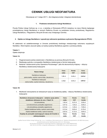 CENNIK USŁUGI NEOFAKTURA Obowiązuje od 1 lutego 2017 r. dla integracji prostej i integracji standardowej 1. Podstawa świadczenia Usługi Neofaktura Poczta Polska Usługi Cyfrowe sp. z o.o. z siedzibą w Warszawie (PPUC) świadczy na rzecz Klienta będącego przedsiębiorcą Usługi Neofaktura w ramach Platformy Envelo na podstawie Umowy produktowej, Regulaminu Usługi Neofaktura, i Regulaminu Skrzynki Envelo oraz niniejszego Cennika. 2. Opłata za Usługę Neofaktura i sposób jej naliczania (podstawa wyliczenia Wynagrodzenia PPUC) W zależności od zadeklarowanego w Umowie produktowej średniego miesięcznego wolumenu wysyłanych Neofaktur, Klient będzie uiszczał opłaty za każdą wysłaną Neofakturę zgodnie z poniższą tabelą: Tabele 1: Opłata obejmuje: Tabela 1A: 1. Wygenerowanie jednej wiadomości z Neofakturą za pomocą Skrzynki Envelo, 2. 3. Realizację wydruku w przypadku Neofaktury dostarczanej w formie tradycyjnej, Nadanie i dostarczenie przez Operatora Pocztowego** jako list ekonomiczny krajowy – dotyczy Neofaktury dostarczanej tradycyjnie: Nazwa Usługi Neofaktura tradycyjna jedna kartka, wydruk czarno-biały, dwustronny Neofaktura tradycyjna Jedna kartka, wydruk kolorowy, dwustronny Cena Kwota Cena netto VAT brutto 1,99 zł 0,46 zł 2,45 zł 2,40zł 0,55 zł 2,95 zł Tabela 1B: 1. Możliwość skorzystania ze wskazanych opcji za dodatkową opłatą – dotyczy Neofaktury dostarczanej tradycyjnie: Neofaktura doręczana tradycyjnie – odrębne opcje płatne Cena Kwota Cena dodatkowo doliczane do cen z Tabeli 1A netto VAT brutto List priorytetowy 1,63 zł 0,37 zł 2,00 zł List ekonomiczny przesyłka zagraniczna 4,47 zł 1,03 zł 5,50 zł List priorytetowy przesyłka zagraniczna 6,10 zł 1,40 zł 7,50 zł Każda dodatkowa kartka, wydruk czarno-biały 0,12 zł 0,03 zł 0,15 zł Każda dodatkowa kartka, wydruk kolorowy 0,53 zł 0,12 zł 0,65 zł Dopłaty do przesyłek zawierających więcej niż 6 kartek w Cena Kwota Cena jednej przesyłce. netto VAT brutto Spółka Poczta Polska Usługi Cyfrowe Sp. z o.o. z siedzibą w Warszawie przy ul. Rodziny Hiszpańskich 8, 02-685 Warszawa, zarejestrowana przez Sąd Rejonowy dla m.st. Warszawy, XIII Wydział Gospodarczy Krajowego Rejestru Sądowego pod nr KRS 0000425263, NIP 525-25-33-454, o kapitale zakładowym 11 000 000 zł (w całości wpłaconym) Strona 1 z 3 Dopłata do przesyłki krajowej o łącznej liczbie kartek od 7 do 14 szt. Dopłata do przesyłki krajowej o łącznej liczbie kartek od 15 do 68 szt. Dopłata do przesyłki krajowej o łącznej liczbie kartek od 69 do 98 szt. Dopłata do przesyłki zagranicznej o łącznej liczbie kartek od 7 do 14 szt. Dopłata do przesyłki zagranicznej o łącznej liczbie kartek od 15 do 68 szt. Dopłata do przesyłki zagranicznej o łącznej liczbie kartek od 69 do 98 szt. 0,74 zł 0,17 zł 0,91 zł 0,95 zł 0,22 zł 1,17 zł 1,65 zł 0,38 zł 2,03 zł 5,03 zł 1,16 zł 6,19 zł 5,14 zł 1,18 zł 6,32 zł 6,64 zł 1,53 zł 8,17 zł Tabela 1C: Opłata za Neofakturę dostarczaną tradycyjnie nadaną jako list polecony krajowy obejmuje: 1. Wygenerowanie jednej wiadomości z Neofakturą za pomocą Skrzynki Envelo, 2. Realizację wydruku na jednej kartce, druk jednostronny lub dwustronny Nadanie i dostarczenie przez Operatora Pocztowego**, jako list polecony ekonomiczny krajowy: 3. Nazwa Usługi Neofaktura dostarczana tradycyjnie wydruk czarno-biały Neofaktura dostarczana tradycyjnie wydruk kolorowy Cena Kwota Cena netto VAT brutto 4,22 zł 0,97 zł 5,19 zł 4,75 zł 1,09 zł 5,84 zł Tabela 1D: Neofaktura dostarczana tradycyjnie – odrębne opcje płatne Cena Kwota Cena dodatkowo doliczane do cen z Tabeli 1C netto VAT brutto List polecony priorytetowy krajowy 3,09 zł 0,71 zł 3,80 zł 2,07 zł 0,48 zł 2,55 zł 16,10 zł 3,70 zł 19,80 zł 3,25 zł 0,75 zł 4,00 zł 0,12 zł 0,03 zł 0,15 zł 0,53 zł 0,12 zł 0,65 zł Dopłaty do przesyłek zawierających więcej niż 6 kartek w Cena Kwota Cena jednej przesyłce. netto VAT brutto 0,74 zł 0,17 zł 0,91 zł 0,95 zł 0,22 zł 1,17 zł Usługa zwrotne potwierdzenie odbioru dla przesyłek poleconych krajowych (ZPO) List polecony priorytetowy przesyłka zagraniczna* Usługa zwrotne potwierdzenie odbioru dla przesyłek poleconych zagranicznych (ZPO) Każda dodatkowa kartka, wydruk czarno-biały, druk jednostronny lub dwustronny. Każda dodatkowa kartka, wydruk kolorowy, druk jednostronny lub dwustronny. Dopłata do przesyłki krajowej o łącznej liczbie kartek od 7 do 14 szt. Dopłata do przesyłki krajowej o łącznej liczbie kartek od 15 do 68 szt. Spółka Poczta Polska Usługi Cyfrowe Sp. z o.o. z siedzibą w Warszawie przy ul. Rodziny Hiszpańskich 8, 02-685 Warszawa, zarejestrowana przez Sąd Rejonowy dla m.st. Warszawy, XIII Wydział Gospodarczy Krajowego Rejestru Sądowego pod nr KRS 0000425263, NIP 525-25-33-454, o kapitale zakładowym 11 000 000 zł (w całości wpłaconym) Strona 2 z 3 Dopłata do przesyłki krajowej o łącznej liczbie kartek od 69 do 98 szt. Dopłata do przesyłki zagranicznej o łącznej liczbie kartek od 7 do 14 szt. Dopłata do przesyłki zagranicznej o łącznej liczbie kartek od 15 do 68 szt. Dopłata do przesyłki zagranicznej o łącznej liczbie kartek od 69 do 98 szt. 1,65 zł 0,38 zł 2,03 zł 5,03 zł 1,16 zł 6,19 zł 5,14 zł 1,18 zł 6,32 zł 6,64 zł 1,53 zł 8,17 zł Tabela 1E: 1. Dostarczenie do Skrzynek Envelo Odbiorców wiadomości elektronicznej z Neofakturą w formie pliku PDF – dotyczy Neofaktury dostarczanej w formie elektronicznej: Nazwa Usługi Cena Kwota Cena netto VAT brutto 1,00 zł 0,23 zł 1,23 zł Neofaktura Dostarczenie pojedynczej wiadomości w formie elektronicznej z Neofakturą w PDF *W przypadku przesyłek rejestrowanych zagranicznych nie występuje opcja przesyłki ekonomicznej. Jedynym dostępnym rodzajem przesyłki jest przesyłka priorytetowa. ** Operatorem Pocztowym jest Poczta Polska S.A. Do stosowania i interpretacji niniejszego Cennika (w tym wyrażeń użytyc