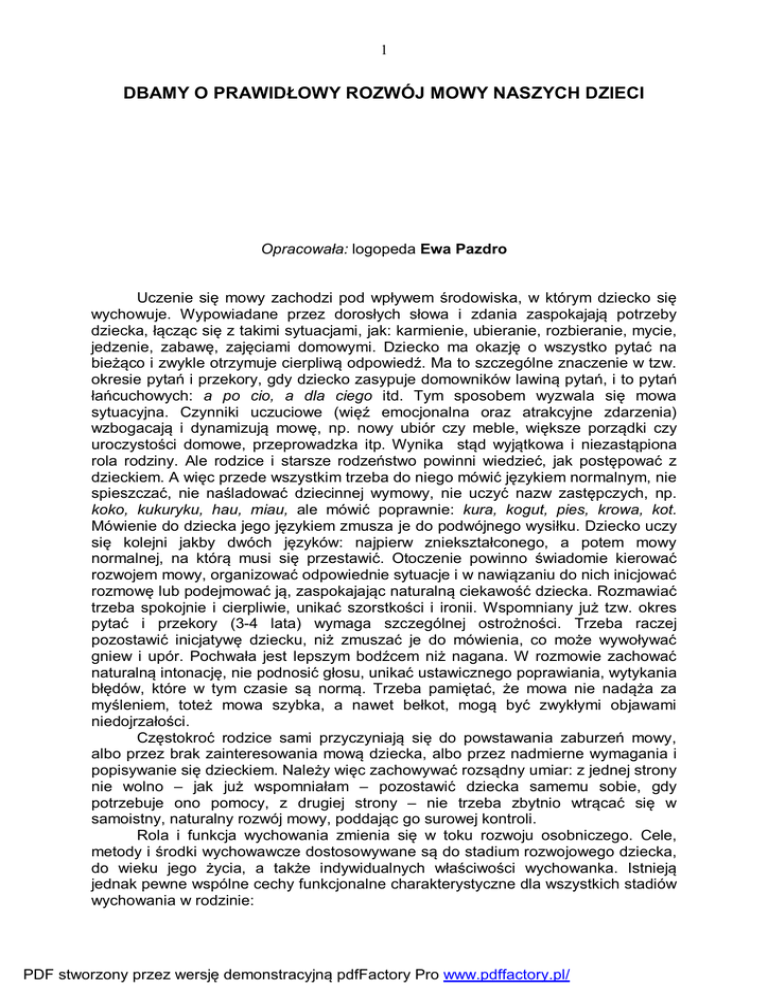 1 DBAMY O PRAWIDŁOWY ROZWÓJ MOWY NASZYCH DZIECI Opracowała: logopeda Ewa Pazdro Uczenie się mowy zachodzi pod wpływem środowiska, w którym dziecko się wychowuje. Wypowiadane przez dorosłych słowa i zdania zaspokajają potrzeby dziecka, łącząc się z takimi sytuacjami, jak: karmienie, ubieranie, rozbieranie, mycie, jedzenie, zabawę, zajęciami domowymi. Dziecko ma okazję o wszystko pytać na bieżąco i zwykle otrzymuje cierpliwą odpowiedź. Ma to szczególne znaczenie w tzw. okresie pytań i przekory, gdy dziecko zasypuje domowników lawiną pytań, i to pytań łańcuchowych: a po cio, a dla ciego itd. Tym sposobem wyzwala się mowa sytuacyjna. Czynniki uczuciowe (więź emocjonalna oraz atrakcyjne zdarzenia) wzbogacają i dynamizują mowę, np. nowy ubiór czy meble, większe porządki czy uroczystości domowe, przeprowadzka itp. Wynika stąd wyjątkowa i niezastąpiona rola rodziny. Ale rodzice i starsze rodzeństwo powinni wiedzieć, jak postępować z dzieckiem. A więc przede wszystkim trzeba do niego mówić językiem normalnym, nie spieszczać, nie naśladować dziecinnej wymowy, nie uczyć nazw zastępczych, np. koko, kukuryku, hau, miau, ale mówić poprawnie: kura, kogut, pies, krowa, kot. Mówienie do dziecka jego językiem zmusza je do podwójnego wysiłku. Dziecko uczy się kolejni jakby dwóch języków: najpierw zniekształconego, a potem mowy normalnej, na którą musi się przestawić. Otoczenie powinno świadomie kierować rozwojem mowy, organizować odpowiednie sytuacje i w nawiązaniu do nich inicjować rozmowę lub podejmować ją, zaspokajając naturalną ciekawość dziecka. Rozmawiać trzeba spokojnie i cierpliwie, unikać szorstkości i ironii. Wspomniany już tzw. okres pytać i przekory (3-4 lata) wymaga szczególnej ostrożności. Trzeba raczej pozostawić inicjatywę dziecku, niż zmuszać je do mówienia, co może wywoływać gniew i upór. Pochwała jest lepszym bodźcem niż nagana. W rozmowie zachować naturalną intonację, nie podnosić głosu, unikać ustawicznego poprawiania, wytykania błędów, które w tym czasie są normą. Trzeba pamiętać, że mowa nie nadąża za myśleniem, toteż mowa szybka, a nawet bełkot, mogą być zwykłymi objawami niedojrzałości. Częstokroć rodzice sami przyczyniają się do powstawania zaburzeń mowy, albo przez brak zainteresowania mową dziecka, albo przez nadmierne wymagania i popisywanie się dzieckiem. Należy więc zachowywać rozsądny umiar: z jednej strony nie wolno – jak już wspomniałam – pozostawić dziecka samemu sobie, gdy potrzebuje ono pomocy, z drugiej strony – nie trzeba zbytnio wtrącać się w samoistny, naturalny rozwój mowy, poddając go surowej kontroli. Rola i funkcja wychowania zmienia się w toku rozwoju osobniczego. Cele, metody i środki wychowawcze dostosowywane są do stadium rozwojowego dziecka, do wieku jego życia, a także indywidualnych właściwości wychowanka. Istnieją jednak pewne wspólne cechy funkcjonalne charakterystyczne dla wszystkich stadiów wychowania w rodzinie: PDF stworzony przez wersję demonstracyjną pdfFactory Pro www.pdffactory.pl/ 2 rodzina zaspokaja podstawowe biologiczne i psychologiczne potrzeby dziecka (potrzebę bezpieczeństwa, miłości, kształtuje potrzeby poznawcze, emocjonalne i społeczne); - rodzina przekazuje dziecku dorobek kulturowy społeczeństwa; - rodzice dostarczają dziecku wzorów zachowań w konkretnych sytuacjach życia codziennego; - rodzice przekazują dzieciom określony system wartości i norm społecznych; - rodzina jest dla dziecka polem doświadczalnym, na którym wypróbowuje ono swe siły i możliwości, znajdując swe siły i oparcie i punkt odniesienia (wzorce) w rodzicach i innych członkach rodziny. Dla większości dzieci rodzice dzieci są tymi, którzy pierwsi do nich mówią, którzy uczą je poznawać świat, komunikować się z nimi, szczególnie ważnym czynnikiem dla rozwoju mowy jest klimat emocjonalny w rodzinie. Wszelkie napięcia, nieporozumienia, sytuacje stresowe mogą zaburzyć rozwój dziecka, w tym rozwój mowy. Gdy dziecko czuje się bezpieczne, akceptowane, ma częsty kontakt z rodzicami, rozwój przebiega bez zakłóceń. Im bardziej kontakt ten jest naturalny, nie wymuszony konkretna sytuacją, tym bardziej dziecko czuje się bezpieczne, jest zmotywowane do nawiązania komunikacji słownej. Duże znaczenie odgrywa też styl wychowawczy zaprezentowany przez rodziców czy osoby zajmujące się wychowanie dziecka. Jednolity styl wychowania, stawianie dziecku takich samych wymagań, takie samo ocenianie za to samo zachowanie, jednolity układ kar i nagród – wpływają korzystnie na rozwój dziecka. Natomiast brak jednolitego stylu wychowania w rodzinie może spowodować zachwianie równowagi emocjonalnej, objawy nadpobudliwości lub zahamowania, poczucie zagrożenia i lęku. Określone postawy emocjonalne znajdują bardzo często swój wyraz w mowie dziecka. Wychowanie zbyt surowe przyczynia się do powstania lęku, buntu, często agresji. Rezultatem tej postawy emocjonalnej dziecka bywa często pojawienie się jąkania. Wychowanie zbyt troskliwe, rozpieszczające sprzyja postawie lekceważącej wobec otoczenia, u dzieci tych obserwujemy mowę niestaranną, niedbałą, bywa przedłużony tzw. okres bełkotania rozwojowego, mowy dziecinnej. Wychowanie niekonsekwentne wytwarza niepewność, zmienność nastrojów, czego rezultatem mogą być zaburzenia tempa, rytmu mowy prowadzące do jąkania. Istnieją środowiska, które ułatwiają dziecku rozwój mowy, inne go zdecydowanie utrudniają. Małe dziecko musi słyszeć w swym otoczeniu dużo dobrej mowy. Wymyślono nawet określenie „kąpiel słowna”, by opisać tę szczególną sytuację i uzmysłowić ludziom, jak ważna jest obecność matki dobrze i dużo mówiącej. Istnieją kobiety, które mówią stale do swego dziecka. Najczęściej opowiadają to, co się właśnie wokół dziecka dzieje, lub to, co one właśni