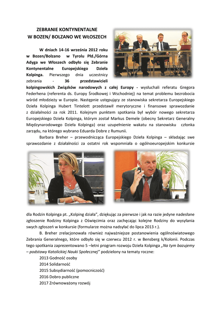 ZEBRANIE KONTYNENTALNE W BOZEN/ BOLZANO WE WŁOSZECH W dniach 14-16 września 2012 roku w Bozen/Bolzano w Tyrolu Płd./Górna Adyga we Włoszech odbyło się Zebranie Kontynentalne Europejskiego Dzieła Kolpinga. Pierwszego dnia uczestnicy zebrania 36 przedstawicieli kolpingowskich Związków narodowych z całej Europy - wysłuchali referatu Gregora Federhena (referenta ds. Europy Środkowej i Wschodniej) na temat problemu bezrobocia wśród młodzieży w Europie. Następnie ustępujący ze stanowiska sekretarza Europejskiego Dzieła Kolpinga Hubert Tintelott przedstawił merytoryczne i finansowe sprawozdanie z działalności za rok 2011. Kolejnym punktem spotkania był wybór nowego sekretarza Europejskiego Dzieła Kolpinga, którym został Markus Demele (obecny Sekretarz Generalny Międzynarodowego Dzieła Kolpinga) oraz uzupełnienie wakatu na stanowisku członka zarządu, na którego wybrano Eduarda Dobre z Rumunii. Barbara Breher – przewodnicząca Europejskiego Dzieła Kolpinga – składając swe sprawozdanie z działalności za ostatni rok wspomniała o ogólnoeuropejskim konkursie dla Rodzin Kolpinga pt. „Kolping działa”, dziękując za pierwsze i jak na razie jedyne nadesłane zgłoszenie Rodziny Kolpinga z Oświęcimia oraz zachęcając kolejne Rodziny do wysyłania swych zgłoszeń w konkursie (formularze można nadsyłać do lipca 2013 r.). B. Breher zrelacjonowała również najważniejsze postanowienia ogólnoświatowego Zebrania Generalnego, które odbyło się w czerwcu 2012 r. w Bensberg k/Kolonii. Podczas tego spotkania zaprezentowano 5 –letni program rozwoju Dzieła Kolpinga „Na tym bazujemy – podstawy Katolickiej Nauki Społecznej” podzielony na tematy roczne: 2013 Godność osoby 2014 Solidarność 2015 Subsydiarność (pomocniczość) 2016 Dobro publiczne 2017 Zrównoważony rozwój B. Breher zaprosiła również na musical „Sen Kolpinga”, którego premiera odbędzie się 4 sierpnia 2013 roku w Wuppertalu/Niemcy. Anton Salesny zrelacjonował działania Rady Europy i przedstawił treść Deklaracji z Bozen, dotyczącej wzmocnienia demokracji w Europie. Wiele miejsca poświęcono też memorandum pt.: „Aktywna starość i solidarność międzypokoleniowa”. Oba dokumenty zostały już przetłumaczone na język polski (znajdują się do pobrania w formacie PDF pod tekstem). Podczas zebrania nie zabrakło również informacji o działaniach Młodego Kolpinga na arenie europejskiej, w tym relacji z Europejskiego Tygodnia Młodych w Brixen/Bressanone oraz o planach na kolejne spotkania w roku 2013. Przedstawiciele każdego z państw mieli okazję zaprezentować swoje dokonania w zakresie pracy wolontarystycznej. Ubiegły rok 2011 ogłoszony został rokiem wolontariatu, co zmotywowało członków Dzieła Kolpinga do wzmożonej pracy w tym zakresie. Polskie Dzieło Kolpinga zaprezentowało działania wolontarystyczne Rodziny Kolpinga z Oświęcimia. Podczas Zebrania Kontynentalnego odbyły się również bardzo inspirujące warsztaty w międzynarodowych grupach dotyczące osoby Adolpha Kolpinga i jego oddziaływania na ludzi we współczesnych czasach. Na zakończenie Margrit Unternährer ze Szwajcarii zaprosiła przedstawicieli Dzieła Kolpinga z całej Europy na kolejne Zebranie Kontynentalne, które odbędzie się w terminie 20-22.09.2013 roku w Lucernie/Szwajcaria.
