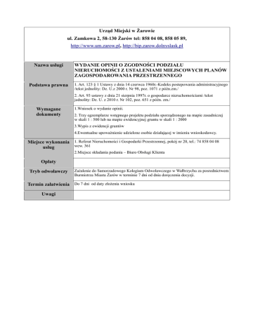 Urząd Miejski w Żarowie ul. Zamkowa 2, 58-130 Żarów tel: 858 04 08, 858 05 89, http://www.um.zarow.pl, http://bip.zarow.dolnyslask.pl Karta nr NiGP/4 Nazwa usługi WYDANIE OPINII O ZGODNOŚCI PODZIAŁU NIERUCHOMOŚCI Z USTALENIAMI MIEJSCOWYCH PLANÓW ZAGOSPODAROWANIA PRZESTRZENNEGO Podstawa prawna 1. Art. 123 § 1 Ustawy z dnia 14 czerwca 1960r.-Kodeks postepowania administracyjnego /tekst jednolity: Dz. U.z 2000 r. Nr 98, poz. 1071 z późn.zm./ 2. Art. 93 ustawy z dnia 21 sierpnia 1997r. o gospodarce nieruchomościami /tekst jednolity: Dz. U. z 2010 r. Nr 102, poz. 651 z późn. zm./ Wymagane dokumenty 1.Wniosek o wydanie opinii. 2. Trzy egzemplarze wstępnego projektu podziału sporządzonego na mapie zasadniczej w skali 1 : 500 lub na mapie ewidencyjnej gruntu w skali 1 : 2000 3.Wypis z ewidencji gruntów 4.Ewentualne upoważnienie udzielone osobie działającej w imieniu wnioskodawcy. Miejsce wykonania 1. Referat Nieruchomości i Gospodarki Przestrzennej, pokój nr 20, tel.: 74 858 04 08 wew. 361 usług 2.Miejsce składania podania – Biuro Obsługi Klienta Opłaty Tryb odwoławczy Zażalenie do Samorzadowego Kolegium Odwoławczego w Wałbrzychu za posrednictwem Burmistrza Miasta Żarów w terminie 7 dni od dnia doręczenia decyzji. Termin załatwienia Do 7 dni od daty złożenia wniosku Uwagi ................................................... miejscowość i data ........................................................ ........................................................ ........................................................ Urząd Miejski w Żarowie ul. Zamkowa 2 58-130 Żarów Zgodnie z art. 93 ustawy z dnia 21 sierpnia 1997 r. o zagospodarowaniu przestrzennym (t. j. z 2004 r. Nr 261, poz. 2603 z późn. zm.), proszę o wydanie opinii o zgodności podziału nieruchomości (Działka Nr .............., Obręb ..........., AM ............) z Miejscowym Planem Zagospodarowania Przestrzennego. OPIS NIERUCHOMOŚCI 1. Właściciel (imię i nazwisko lub nazwa instytucji) ................................................................................................................................................................................ ................................................................................................................................................................................ 2. Położenie obszaru objętego podziałem (adres, sąsiedztwo) ................................................................................................................................................................................ ................................................................................................................................................................................ 3. Zasady obsługi komunikacyjnej (dostęp do drogi publicznej, ewent. konieczne służebności komunikacyjne) ................................................................................................................................................................................ ................................................................................................................................................................................ ................................................................................................................................................................................ 4. Ewentualne zasady obsługi w zakresie infrastruktury technicznej – wymagane służebności dostępu ................................................................................................................................................................................ ................................................................................................................................................................................ ............................................................................................................................................................................... 5. Cel podziału, przeznaczenie działek po podziale ................................................................................................................................................................................ ................................................................................................................................................................................ ................................................................................................................................................................................ ...................................................................... podpis wnioskodawcy lub osoby przez niego upoważnionej Załączniki: 1. wstępny projekt podziału – mapa zasadnicza w skali 1:500 lub na mapie ewidencji gruntu w skali 2. 3. 4. 1: 2000 - trzy egzemplarze Mapa ewidencji gruntów w skali 1:1000 Wypis z ewidencji gruntów Upoważnienie osobie działającej w imieniu wnioskodawcy