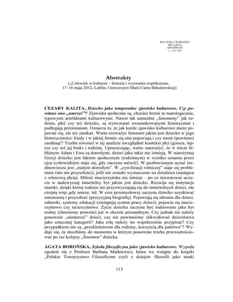 KULTURA I WARTOŚCI NR 2 (2012) ARCHIWUM s. 113–129 Abstrakty („Człowiek w kulturze – historia i wyzwania współczesne, 17–18 maja 2012, Lublin, Uniwersytet Marii Curie-Skłodowskiej) CEZARY KALITA, Dziecko jako temporalne zjawisko kulturowe. Czy powinno ono „umrzeć”? Zjawiska społeczne są, chociaż brzmi to tautologicznie, typowymi artefaktami kulturowymi. Nawet tak naturalne „fenomeny” jak rodzina, płeć czy też dziecko, są wytworami uwarunkowanymi historycznie i podlegają przemianom. Oznacza to, że jak każde zjawisko kulturowe może pojawiać się, ale też zanikać. Warto rozważyć fenomen jakim jest dziecko w jego historyczności: kiedy i w jakiej formie się ono pojawiają i czy może (powinno) zaniknąć? Trzeba również w tej analizie uwzględnić kontekst płci (gorsza, lepsza czy też jej brak) i rodzinę. Upraszczając, warto zauważyć, że w micie biblijnym Adam i Ewa są dorosłymi, dzieci jako takie nie istnieją. W starożytnej Grecji dziecko jest faktem społecznym (rodzinnym) w wyniku uznania przez ojca (człowiekiem staje się, gdy zaczyna mówić). W pozbawionym uczuć średniowieczu jest „małym dorosłym”. W „cywilizacji rolniczej” staje się problemem (nie ma przyszłości), jeśli nie zostało wyznaczone na dziedzica (następca z właściwą płcią). Miłość macierzyńska nie istnieje – po co inwestować uczucie w nadzwyczaj śmiertelny byt jakim jest dziecko. Rozwija się instytucja mamki, dzięki której rodzice nie przyzwyczajają się do śmiertelnych dzieci, nie cierpią więc gdy umrze, itd. W erze przemysłowej zaczyna dziecko uzyskiwać autonomię i przyszłość (precyzyjną biografię). Pojawiają się ubrania dla dzieci, zabawki, systemy edukacji (zastępują system pracy dzieci), pojawia się macierzyństwo czy tacierzyństwo. Życie dziecka zaczyna być traktowane jako byt realny (chroniony prawnie) już w okresie prenatalnym. Czy jednak nie należy ponownie „uśmiercić” dzieci, czy nie powinniśmy zlikwidować dzieciństwa jako sztucznej kategorii? Jaka rolę należy im współcześnie przypisać? Czy przypadkiem nie są „przekleństwem dla rodziny, korzyścią dla państwa”? Wydaje się, że doszliśmy do momentu w którym ponownie trzeba przewartościować po raz kolejny „fenomen” dziecka. AGATA BOROŃSKA, Szkoła filozoficzna jako zjawisko kulturowe. Wypada zgodzić się z Profesor Barbarą Markiewicz, która we wstępie do książki „Polskie Towarzystwo Filozoficzne czyli z dziejów filozofii jako nauki 113 ABSTRAKTY: CZŁOWIEK W KULTURZE... instytucjonalnej” zauważyła, że „Filozofia nie kojarzy się na ogół z nauką, a już tym bardziej z instytucjonalną”. Nie jest w tym momencie istotne, jakie są tego przyczyny, tym bardziej, że pani Profesor miała na myśli filozofię instytucjonalną sensu stricte. Niemniej, podobne skojarzenia budzi szkoła filozoficzna rozumiana nie wprost jako instytucja, lecz jako struktura o charakterze mniej formalnym, a bardziej interpersonalnym (społecznym). W przebiegu 2500 lat historii filozofii europejskiej specyfika, a w ostatnim czasie nawet struktura szkół filozoficznych, ulegała powolnej, lecz zauważalnej reorganizacji. Proces ten postępował równolegle do procesu odrywania od filozofii szczegółowych dziedzin, tworzących samodzielne nauki. Istnieją jednak przesłanki by sądzić, że o ile w nauce instytucjonalizm narzuca formę społecznej kooperacji, o tyle w filozofii najnowszej obserwuje się tendencję do skrajnego indywidualizmu w stylu filozofowania. Czy szkoła filozoficzna jako specyficzny sposób funkcjonowania grupy filozofów ma przed sobą jakąś przyszłość? Czy też współczesna filozofia i filozofia najbliższej przyszłości nie jest już ani szkolna, ani epigońska (rozróżniając te formy), lecz na przykład skrajnie indywidualistyczna? Próbę odpowiedzi na te pytania proponuję rozpocząć od przypomnienia niektórych szkół filozoficznych pod względem ich struktury i specyfiki warunków, w jakich funkcjonowały, oraz formalnego opisu szkoły filozoficznej różnych autorów (Jana Woleńskiego, Antoniego Stępnia, Miroslava Petruska). ANNA MUSIOŁ: Wilhelma Diltheya próba ujęcia człowieka w kulturze. Zarys z estetyki i antropologii filozoficznej. Kryzys kultury przełomu XIX i XX wieku wyrażony niemożnością określenia prawdy w jej absolucie uzależnia jej postrzeganie i rozumienie od postawy zaangażowanego poznawczo podmiotu: człowieka, którego wszelkie działanie podlega wpływowi historii i kształtującym się w niej światopoglądom. Remedium na kulturową zapaść wyrażającą się w hegemoni naturalizmu oraz zarzut braku pełnej obiektywności i metodologicznej samowiedzy w naukach humanistycznych jest autentyczność, którą najdobitniej odzwierciedla spontaniczna praca jednostki postrzeganej zgodnie z założeniami humanistycznej psychologii deskryptywnej. Jednostka, choć uwarunkowana społecznymi determinantami, poznając sięga w głąb własnego ducha i konfirmuje twórczą aktywnością swoją niepowtarzalność poprzez ciągłe rozbudowywanie perspektyw aksjologicznych oraz przeżyciowo-rozumiejące postrzeganie rzeczywistości. Poświadczają to słowa Pism estetycznych Diltheya, w których czytamy: „również w kryzysach społecznych natura ludzka ma w sobie tajemne zwycięskie siły i że człowiek może strząsnąć wszystkie te błazeństwa, które nas dzisiaj niepokoją”. Umiejętna, zorientowana estetycznie, angażująca tezy z pogranicza teorii literatury, poezji i sztuki oraz determinowana trój-kategorią: Ausdruck – Erleben – Bedeutung, analiza wytworu kultury dookreśla nie tylko definicję całokształtu materialnego i duchowego dorobku ludzkości wytworzonego w toku procesu dziejowego, ale ustanawia także sposób postrzegania pojedynczego człowieka. Istoty świadomej historycznie i realizującej się w ciągłości życia stanowiącego – jak sugeruje
