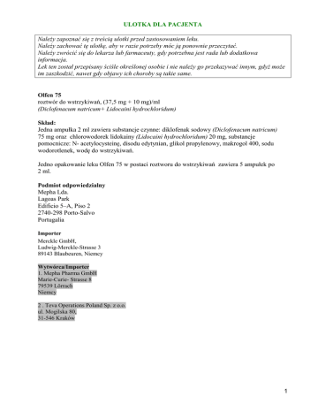 ULOTKA DLA PACJENTA Należy zapoznać się z treścią ulotki przed zastosowaniem leku. Należy zachować tę ulotkę, aby w razie potrzeby móc ją ponownie przeczytać. Należy zwrócić się do lekarza lub farmaceuty, gdy potrzebna jest rada lub dodatkowa informacja. Lek ten został przepisany ściśle określonej osobie i nie należy go przekazywać innym, gdyż może im zaszkodzić, nawet gdy objawy ich choroby są takie same. Olfen 75 roztwór do wstrzykiwań, (37,5 mg + 10 mg)/ml (Diclofenacum natricum+ Lidocaini hydrochloridum) Skład: Jedna ampułka 2 ml zawiera substancje czynne: diklofenak sodowy (Diclofenacum natricum) 75 mg oraz chlorowodorek lidokainy (Lidocaini hydrochloridum) 20 mg, substancje pomocnicze: N- acetylocysteinę, disodu edytynian, glikol propylenowy, makrogol 400, sodu wodorotlenek, wodę do wstrzykiwań. Jedno opakowanie leku Olfen 75 w postaci roztworu do wstrzykiwań zawiera 5 ampułek po 2 ml. Podmiot odpowiedzialny Mepha Lda. Lagoas Park Edificio 5–A, Piso 2 2740-298 Porto-Salvo Portugalia Importer Merckle GmbH, Ludwig-Merckle-Strasse 3 89143 Blaubeuren, Niemcy Wytwórca/Importer 1. Mepha Pharma GmbH Marie-Curie- Strasse 8 79539 Lörrach Niemcy 2 . Teva Operations Poland Sp. z o.o. ul. Mogilska 80, 31-546 Kraków 1 Spis treści ulotki: 1. Co to jest lek Olfen 75 i w jakim celu się go stosuje 2. Zanim zastosuje się lek Olfen 75 3. Jak stosować lek Olfen 75 4. Możliwe działania niepożądane 5. Przechowywanie leku Olfen 75 6. Inne konieczne informacje dotyczące leku Olfen 75 1. Co to jest lek Olfen 75 i w jakim celu się go stosuje Olfen 75 ampułki zawiera diklofenak sodowy, należący do grupy tzw. niesteroidowych leków przeciwzapalnych (NLPZ), działający przeciwreumatycznie, przeciwzapalnie, przeciwbólowo i przeciwgorączkowo oraz chlorowodorek lidokainy stosowany jako miejscowy środek znieczulający. W mechanizmie działania leku Olfen 75 istotne znaczenie ma hamowanie biosyntezy prostaglandyn, które odgrywają zasadniczą rolę w patogenezie procesu zapalnego, bólu i gorączki. Olfen 75 stosuje się w leczeniu: • zaostrzeń zapalnych lub zwyrodnieniowych postaci choroby reumatycznej: reumatoidalnego zapalenia stawów, zesztywniającego zapalenia stawów kręgosłupa, zapalenia kości i stawów, zapalenia stawów kręgosłupa, zespołów bólowych związanych ze zmianami w kręgosłupie, reumatyzmu pozastawowego • ostrych napadów dny • kolki nerkowej i wątrobowej • bólów spowodowanych pourazowymi i pooperacyjnymi stanami zapalnymi i obrzękami 2. Zanim zastosuje się lek Olfen 75 Nie należy stosować leku Olfen 75 w następujących przypadkach: • znana nadwrażliwość na substancję czynną lub którykolwiek inny składnik leku • czynna lub przebyta choroba wrzodowa żołądka i (lub) dwunastnicy, krwawienie lub perforacja • ostatni trymestr ciąży (patrz punkt 4.6) • ciężka niewydolność wątroby, nerek i serca (patrz punkt 4.4 ) • podobnie jak inne niesteroidowe leki przeciwzapalne (NLPZ), nie należy stosować leku Olfen 75 u osób, u których podanie kwasu acetylosalicylowego lub innych leków hamujących syntezę prostaglandyn może być przyczyną wystąpienia napadu astmatycznego, pokrzywki lub ostrego nieżytu nosa • krwawienie lub pęknięcie wrzodów żołądka i (lub) dwunastnicy po zastosowaniu NLPZ w przeszłości • jeśli u pacjenta stwierdzono chorobę serca i (lub) chorobę naczyń mózgowych np. po przebyciu zawału serca, udaru, mini-udaru (przejściowego niedokrwienia mózgu) lub zatoru naczyń krwionośnych serca, lub mózgu, albo zabiegu udrożnienia, lub pomostowania zamkniętych naczyń, • jeśli u pacjenta występują lub występowały zaburzenia krążenia (choroba naczyń obwodowych). 2 Przed przyjęciem diklofenaku należy poinformować lekarza • jeśli pacjent pali tytoń • jeśli pacjent choruje na cukrzycę • jeśli u pacjenta występuje dusznica bolesna, zakrzepy, nadciśnienie tętnicze, zwiększone stężenie cholesterolu lub zwiększone stężenie triglicerydów. Występowanie działań niepożądanych można ograniczyć stosując lek w najmniejszej skutecznej dawce i nie dłużej niż to konieczne. Należy poinformować lekarza o występowaniu wymienionych chorób. Należy zachować szczególną ostrożność stosując Olfen 75, gdyż: • stosowanie diklofenaku może spowodować krwawienie z przewodu pokarmowego, owrzodzenie lub perforację. Działanie takie może być szczególnie groźne w przypadku stosowania dużych dawek diklofenaku, a także dla osób z przebytym owrzodzeniem przewodu pokarmowego lub w podeszłym wieku. Jeśli w trakcie stosowania leku Olfen 75 wystąpią jakiekolwiek nietypowe dolegliwości w obrębie jamy brzusznej (zwłaszcza krwawienie z przewodu pokarmowego), lek należy niezwłocznie odstawić i skontaktować się z lekarzem. • u pacjentów z wrzodziejącym zapaleniem okrężnicy lub chorobą Leśniowskiego- Crohna diklofenak może zaostrzyć przebieg choroby. • stosowanie diklofenaku może w bardzo rzadkich przypadkach (zwłaszcza na początku leczenia) wywołać groźne dla życia reakcje skórne (jak np. złuszczające zapalenie skóry, zespół Stevensa- Johnsona z rozległą wysypką, wysoką gorączką i bólem stawów oraz toksyczne martwicze oddzielanie się naskórka ze zmianami w obrębie skóry i błon śluzowych, wysoką gorączką i ciężkim stanem ogólnym. Podczas wystąpienia pierwszych oznak wysypki, zmian na błonach śluzowych lub innych objawów reakcji alergicznej lek należy odstawić i skontaktować się z lekarzem. • lek może maskować objawy zakażenia (np. ból głowy, zwiększoną temperaturę ciała) i utrudniać prawidłową diagnozę. Podczas badań lekarskich należy poinformować lekarza o stosowaniu leku. • pacjenci z astmą, alergicznym zapaleniem błony śluzowej nosa, obrzękiem błony śluzowej nosa (np. z powodu polipów nosa), przewlekłą obturacyjną chorobą płuc lub przewlekłymi z