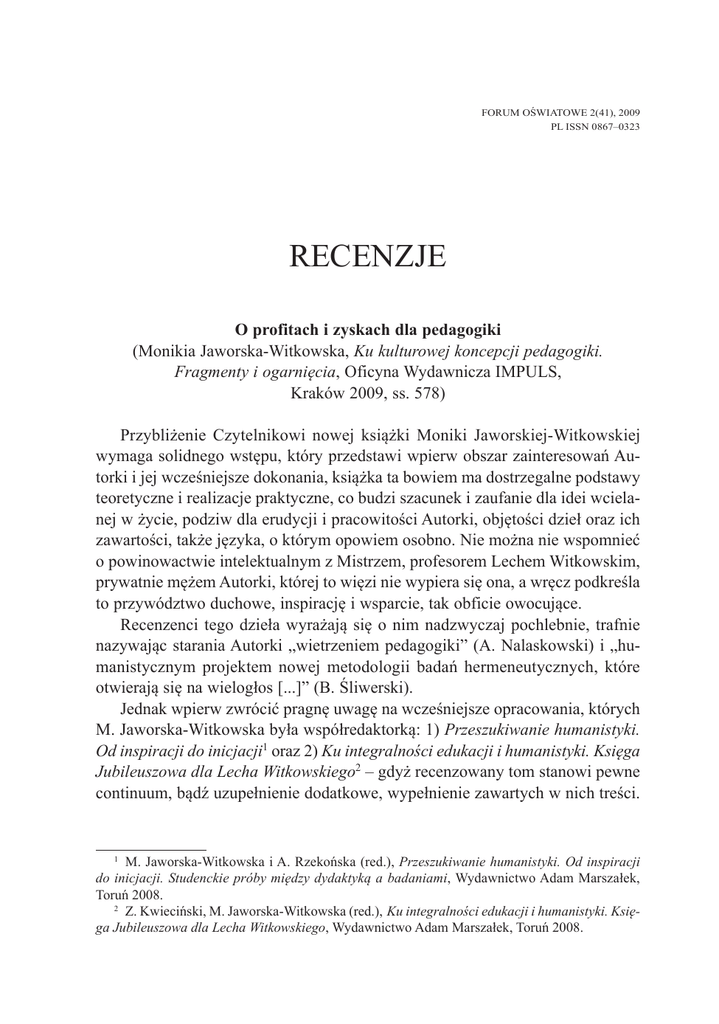 FORUM OŚWIATOWE 2(41), 2009 PL ISSN 0867–0323 RECENZJE O profitach i zyskach dla pedagogiki (Monikia Jaworska-Witkowska, Ku kulturowej koncepcji pedagogiki. Fragmenty i ogarnięcia, Oficyna Wydawnicza IMPULS, Kraków 2009, ss. 578) Przybliżenie Czytelnikowi nowej książki Moniki Jaworskiej-Witkowskiej wymaga solidnego wstępu, który przedstawi wpierw obszar zainteresowań Autorki i jej wcześniejsze dokonania, książka ta bowiem ma dostrzegalne podstawy teoretyczne i realizacje praktyczne, co budzi szacunek i zaufanie dla idei wcielanej w życie, podziw dla erudycji i pracowitości Autorki, objętości dzieł oraz ich zawartości, także języka, o którym opowiem osobno. Nie można nie wspomnieć o powinowactwie intelektualnym z Mistrzem, profesorem Lechem Witkowskim, prywatnie mężem Autorki, której to więzi nie wypiera się ona, a wręcz podkreśla to przywództwo duchowe, inspirację i wsparcie, tak obficie owocujące. Recenzenci tego dzieła wyrażają się o nim nadzwyczaj pochlebnie, trafnie nazywając starania Autorki „wietrzeniem pedagogiki” (A. Nalaskowski) i „humanistycznym projektem nowej metodologii badań hermeneutycznych, które otwierają się na wielogłos [...]” (B. Śliwerski). Jednak wpierw zwrócić pragnę uwagę na wcześniejsze opracowania, których M. Jaworska-Witkowska była współredaktorką: 1) Przeszukiwanie humanistyki. Od inspiracji do inicjacji1 oraz 2) Ku integralności edukacji i humanistyki. Księga Jubileuszowa dla Lecha Witkowskiego2 – gdyż recenzowany tom stanowi pewne continuum, bądź uzupełnienie dodatkowe, wypełnienie zawartych w nich treści. 1 M. Jaworska-Witkowska i A. Rzekońska (red.), Przeszukiwanie humanistyki. Od inspiracji do inicjacji. Studenckie próby między dydaktyką a badaniami, Wydawnictwo Adam Marszałek, Toruń 2008. 2 Z. Kwieciński, M. Jaworska-Witkowska (red.), Ku integralności edukacji i humanistyki. Księga Jubileuszowa dla Lecha Witkowskiego, Wydawnictwo Adam Marszałek, Toruń 2008. 132 Recenzje Pierwsze z tych opracowań redagowane było wespół ze studentką, uczestniczką nietypowych zajęć. Jak pisze Jaworska-Witkowska: Książka ta jest eksperymentem i opisem eksperymentu. Po pierwsze chciałam sprawdzić, czy w obliczu niebezpieczeństwa w zakresie prób redukcyjnego uzawodowienia uniwersytetów można jeszcze młodych ludzi przyciągać od samego początku studiów do poszukiwania dla siebie samych wątków innych niż przydatne pragmatycznie i czy da się to zrobić wręcz pod prąd ich wąskich specjalizacji zawodowych. Po drugie intrygowało mnie, czy da się to zrobić nie poprzez wskazanie gotowego zakresu tematów i zadań czy testów od-do, ale w trybie namowy do samodzielnego już przeszukiwania humanistyki [...]. Po trzecie chodziło o zobaczenie, czy przy krążącym głoszeniu upadku poziomu i motywacji do studiowania wśród młodzieży da się znaleźć grupę zmuszającą się do wysiłku, z którego gratyfikacje nie będą inne, niż własna satysfakcja z duchowego rozwoju, z zaskakujących spotkań i z okazji do zaskoczenia siebie samych. Zainteresowanych zapraszam do lektury. Księga jubileuszowa jest natomiast imponującym objętością i starannością edytorską tomem o różnogatunkowej treści tekstach autorstwa wybitnych przyjaciół Jubilata, zebranych w dziesięciu interdyscyplinarnych rozdziałach, które łączy powinowactwo myśli i troska o los humanistyki, znajdujemy tam też omówienia dzieł Witkowskiego, artykuły inspirowane jego myślą, treści biograficzne oraz wspomnieniowe ujęte w teksty o często niezwykle osobistym tonie autonarracji, co rzadko się we współczesnej pedagogice spotyka. Tom ten jest świadectwem przenikania myśli Witkowskiego do obszarów pedagogiki i zaprzecza tezie o jakoby zaniku w dyskursie akademickim relacji mistrz-uczeń. Recenzowana książka jest kolejnym opracowaniem z tej konsekwentnej serii integrującej pedagogikę z humanistyką szeroko pojętą. Składa się ona z dwóch części. W pierwszej Autorka buduje metodologiczne relacje pedagogiki wobec kultury, które dokonują się w złożonych sytuacjach poznawczych, czyli „między drogami kultury”. Druga część książki jest natomiast prezentacją możliwych zysków symbolicznych dla pedagogiki ...pod warunkiem podjęcia przez nią wysiłku osadzenia problematyki także w kontekstach narracji zmarginalizowanych, zapomnianych czy zakazanych, a – jak się okazuje – budzących jej wrażliwość kulturową i zrozumienie niezbędnego zakresu osadzenia w kulturze dla każdego typu myślenia i działania edukacyjnego (s. 17). Recenzje 133 Zarówno pierwsza jak i druga część we fragmentach lub w całości stanowi niezwykle interesującą propozycję dla dydaktyki także akademickiej, choć Autorka częściej nawiązuje do dydaktyki szkolnej. Dla recenzentki szczególnie wartościowe są fragmenty odczytań współczesnych lektur pedagogicznych (np. A. Nalaskowskiego), rozdział IX Dyskurs(y) kultury a pedagogika czytania oraz bliski osobistym zainteresowaniom rozdział VII Eseistyczność jako tryb próbowania poznawczego w pedagogice. Bogactwo treści sprawia, iż zapewne każdy pedagog znajdzie fragmenty budzące struny jego wrażliwości, dopełniające odpowiedzi na różne zawodowe pytania, wywołujące impulsy sprzeciwu lub zachwytu, w każdym razie twórczo poruszające. Język omawianego opracowania jest charakterystyczny, miejscami trudny, niezwykle zindywidualizowany. Przybliżmy jego specyfikę dla potrzeb trafniejszego poznania języka wszystkich wspomnianych tu opracowań M. JaworskiejWitkowskiej przy pomocy cytatów z książki A. Chojeckiego, filologa, charakteryzującego język współczesnej humanistyki. Bowiem cechy języka Autorki są podobne do tych, charakterystycznych dla współczesnej humanistyki, spod znaku postmodernizmu, jak pisze przywołany autor3 – także pod względem zapisu. To co oszałamia czytelnika przy pierwszym kontakcie
