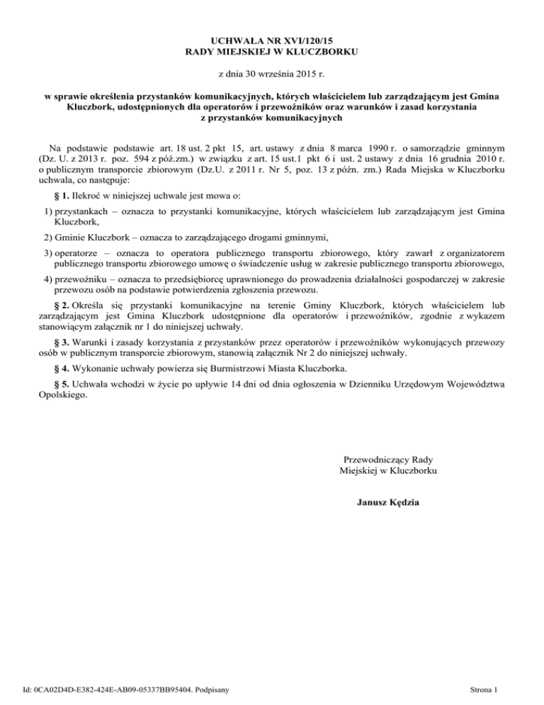 UCHWAŁA NR XVI/120/15 RADY MIEJSKIEJ W KLUCZBORKU z dnia 30 września 2015 r. w sprawie określenia przystanków komunikacyjnych, których właścicielem lub zarządzającym jest Gmina Kluczbork, udostępnionych dla operatorów i przewoźników oraz warunków i zasad korzystania z przystanków komunikacyjnych Na podstawie podstawie art. 18 ust. 2 pkt 15, art. ustawy z dnia 8 marca 1990 r. o samorządzie gminnym (Dz. U. z 2013 r. poz. 594 z póź.zm.) w związku z art. 15 ust.1 pkt 6 i ust. 2 ustawy z dnia 16 grudnia 2010 r. o publicznym transporcie zbiorowym (Dz.U. z 2011 r. Nr 5, poz. 13 z późn. zm.) Rada Miejska w Kluczborku uchwala, co następuje: § 1. Ilekroć w niniejszej uchwale jest mowa o: 1) przystankach – oznacza to przystanki komunikacyjne, których właścicielem lub zarządzającym jest Gmina Kluczbork, 2) Gminie Kluczbork – oznacza to zarządzającego drogami gminnymi, 3) operatorze – oznacza to operatora publicznego transportu zbiorowego, który zawarł z organizatorem publicznego transportu zbiorowego umowę o świadczenie usług w zakresie publicznego transportu zbiorowego, 4) przewoźniku – oznacza to przedsiębiorcę uprawnionego do prowadzenia działalności gospodarczej w zakresie przewozu osób na podstawie potwierdzenia zgłoszenia przewozu. § 2. Określa się przystanki komunikacyjne na terenie Gminy Kluczbork, których właścicielem lub zarządzającym jest Gmina Kluczbork udostępnione dla operatorów i przewoźników, zgodnie z wykazem stanowiącym załącznik nr 1 do niniejszej uchwały. § 3. Warunki i zasady korzystania z przystanków przez operatorów i przewoźników wykonujących przewozy osób w publicznym transporcie zbiorowym, stanowią załącznik Nr 2 do niniejszej uchwały. § 4. Wykonanie uchwały powierza się Burmistrzowi Miasta Kluczborka. § 5. Uchwała wchodzi w życie po upływie 14 dni od dnia ogłoszenia w Dzienniku Urzędowym Województwa Opolskiego. Przewodniczący Rady Miejskiej w Kluczborku Janusz Kędzia Id: 0CA02D4D-E382-424E-AB09-05337BB95404. Podpisany Strona 1 Załącznik Nr 1 do Uchwały Nr XVI/120/15 Rady Miejskiej w Kluczborku z dnia 30 września 2015 r. Lp. Kategoria drogi/Numer drogi Miejscowość Lokalizacja 1. Droga Gminna Bogacica ul. Szkolna 2104 O / Droga Gminna Kluczbork 2104 O / Droga Gminna Kluczbork 4 2103 O / Droga Gminna Kluczbork 5 Droga Gminna Kluczbork 6 7 Droga Gminna Droga Gminna Ligota Górna Maciejów 2. 3. Id: 0CA02D4D-E382-424E-AB09-05337BB95404. Podpisany ul. Konopnickiej PSP nr 5 ul. Konopnickiej PSP nr 5 ul. Kołłątaja ul. MickiewiczaHala OSiR ul. Gliwicka Pasieka Infrastruktura Zatoka autobusowa Brak infrastruktury Znak D-15 Wiata, zatoka autobusowa Brak infrastruktury Wiata Znak D-15 Strona 1 Załącznik Nr 2 do Uchwały Nr XVI/120/15 Rady Miejskiej w Kluczborku z dnia 30 września 2015 r. Warunki i zasady korzystania z przystanków komunikacyjnych przez operatorów i przewoźników wykonujących regularne przewozy osób w publicznym transporcie zbiorowym 1. Z przystanków komunikacyjnych zlokalizowanych na terenie Gminy Kluczbork , które stanowią własność Gminy Kluczbork lub są przez nią zarządzane mogą korzystać operatorzy publicznego transportu zbiorowego oraz przewoźnicy w ramach wykonywania publicznego transportu zbiorowego. 2. Warunkiem korzystania z przystanków jest uzyskanie pisemnej zgody na korzystanie z przystanków na terenie Gminy Kluczbork. 3. Zgoda o której mowa w pkt 2 wydawana jest na wniosek operatora lub przewoźnika składany do Urzędu Miejskiego w Kluczborku wraz z załącznikami: a) projekt proponowanego rozkładu jazdy, b) określenie przystanków w oparciu o załącznik nr 1 do uchwały, na których operator lub przewoźnik planuje wykonać przewozy, c) schemat połączeń komunikacyjnych z zaznaczoną linią komunikacyjną oraz przystankami określonymi w projekcie rozkładu jazdy, d) kserokopii zezwolenia na wykonywanie regularnych przewozów osób w krajowym transporcie drogowym, 4. Gmina Kluczbork może cofnąć zgodę, o której mowa w pkt. 2 w następujących przypadkach: a) wygaśnięcie lub cofnięcie uprawnień do prowadzenia działalności w zakresie przewozu osób, b) nie przestrzeganie przez operatora lub przewoźnika rozkładu jazdy, co powoduje występowanie utrudnień w korzystaniu utrudnień przystanków przez innych operatorów lub przewoźników, c) stworzenie zagrożenia bezpieczeństwa ruchu drogowego np. przez blokowanie korzystania z przystanku innemu operatorowi lub przewoźnikowi, d) nie powiadomienie Gminy Kluczbork o zmianie rozkładu jazdy lub przystanków, z których korzysta operator lub przewoźnik, e) naruszenie zasad korzystania z przystanków, o których mowa w pkt. 5 – 9, f) nie uiszczenie opłaty za korzystanie z przystanków, udostępnionych operatorom lub przewoźnikom. 5. Operatorzy i przewoźnicy korzystający z przystanków komunikacyjnych mają prawo zatrzymywać na nich swoje pojazdy wyłącznie w celu umożliwienia pasażerom wsiadania i wysiadania w ramach obowiązującego rozkładu jazdy. 6. Zabrania się postoju na przystankach ponad czas niezbędny do obsługi pasażerów i korzystania z przystanku i jako miejsca odpoczynku kierowcy. 7. Operator i przewoźnik posiadający zgodę na korzystanie z przystanków komunikacyjnych mają obowiązek podać do publicznej wiadomości rozkład jazdy poprzez zamieszczenie stosownej informacji na przystankach komunikacyjnych zgodnie z art. 2 ust. 2-3 stawy z dnia 15 listopada 1984 r. Prawo przewozowe (Dz. U. z 2015 r. poz. 915.) 8. Utrzymanie tablicy z rozkładem jazdy w należytym stanie technicznym należy do operatorów i przewoźników. 9. Zabrania się umieszczania na przystankach komunikacyjnych innych informacji niż te, które dotyczą rozkładu jazdy, oraz reklam w rozumieniu art. 4 ust. 23 ustawy z dnia 21 marca 1985 r. o drogach publicznych ( Dz. U. z 2015 r. poz. 460 z późn. zm.). Id: 0CA02D4D-E382-424E-AB09-05337BB95404. Podpisany Strona 1 10. W przy