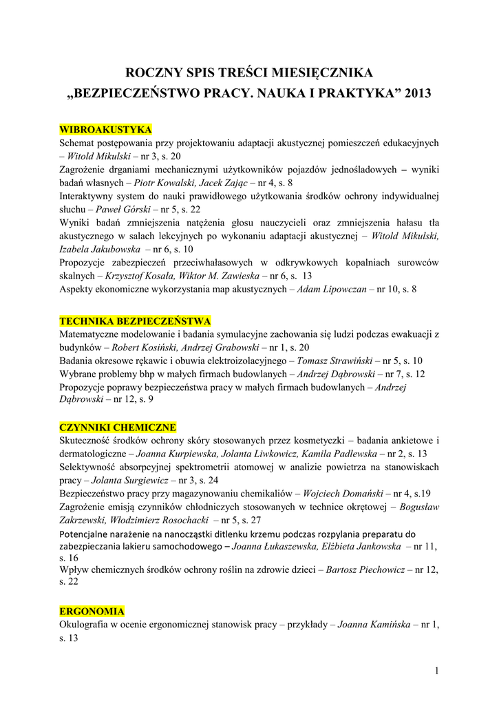 ROCZNY SPIS TREŚCI MIESIĘCZNIKA „BEZPIECZEŃSTWO PRACY. NAUKA I PRAKTYKA” 2013 WIBROAKUSTYKA Schemat postępowania przy projektowaniu adaptacji akustycznej pomieszczeń edukacyjnych – Witold Mikulski – nr 3, s. 20 Zagrożenie drganiami mechanicznymi użytkowników pojazdów jednośladowych – wyniki badań własnych – Piotr Kowalski, Jacek Zając – nr 4, s. 8 Interaktywny system do nauki prawidłowego użytkowania środków ochrony indywidualnej słuchu – Paweł Górski – nr 5, s. 22 Wyniki badań zmniejszenia natężenia głosu nauczycieli oraz zmniejszenia hałasu tła akustycznego w salach lekcyjnych po wykonaniu adaptacji akustycznej – Witold Mikulski, Izabela Jakubowska – nr 6, s. 10 Propozycje zabezpieczeń przeciwhałasowych w odkrywkowych kopalniach surowców skalnych – Krzysztof Kosała, Wiktor M. Zawieska – nr 6, s. 13 Aspekty ekonomiczne wykorzystania map akustycznych – Adam Lipowczan – nr 10, s. 8 TECHNIKA BEZPIECZEŃSTWA Matematyczne modelowanie i badania symulacyjne zachowania się ludzi podczas ewakuacji z budynków – Robert Kosiński, Andrzej Grabowski – nr 1, s. 20 Badania okresowe rękawic i obuwia elektroizolacyjnego – Tomasz Strawiński – nr 5, s. 10 Wybrane problemy bhp w małych firmach budowlanych – Andrzej Dąbrowski – nr 7, s. 12 Propozycje poprawy bezpieczeństwa pracy w małych firmach budowlanych – Andrzej Dąbrowski – nr 12, s. 9 CZYNNIKI CHEMICZNE Skuteczność środków ochrony skóry stosowanych przez kosmetyczki – badania ankietowe i dermatologiczne – Joanna Kurpiewska, Jolanta Liwkowicz, Kamila Padlewska – nr 2, s. 13 Selektywność absorpcyjnej spektrometrii atomowej w analizie powietrza na stanowiskach pracy – Jolanta Surgiewicz – nr 3, s. 24 Bezpieczeństwo pracy przy magazynowaniu chemikaliów – Wojciech Domański – nr 4, s.19 Zagrożenie emisją czynników chłodniczych stosowanych w technice okrętowej – Bogusław Zakrzewski, Włodzimierz Rosochacki – nr 5, s. 27 Potencjalne narażenie na nanocząstki ditlenku krzemu podczas rozpylania preparatu do zabezpieczania lakieru samochodowego – Joanna Łukaszewska, Elżbieta Jankowska – nr 11, s. 16 Wpływ chemicznych środków ochrony roślin na zdrowie dzieci – Bartosz Piechowicz – nr 12, s. 22 ERGONOMIA Okulografia w ocenie ergonomicznej stanowisk pracy – przykłady – Joanna Kamińska – nr 1, s. 13 1 Ocena wdrożenia postanowień dyrektywy unijnej dotyczącej bhp na stanowiskach pracy wyposażonych w monitory ekranowe – Agnieszka Wolska, Andrzej Najmiec – nr 1, s. 16 Karty charakterystyki zagrożeń zawodowych jako użyteczne narzędzie pracy dla służby bhp – Elżbieta Łastowiecka-Moras, Joanna Bugajska – nr 1, s. 28 Podstawy higieny narządu głosu w pracy nauczycieli i wykładowców – Magdalena Gębska, Alina Wojciechowska, Katarzyna Weber-Nowakowska, Ewelina Żyżniewska-Banaszak – nr 2, s. 18 Subiektywna ocena ergonomiczności stanowiska pracy kierowcy zawodowego – Edward Kowal, Marek Rybakowski, Grzegorz Dudarski – nr 5, s. 15 Temperatura jako istotny składnik środowiska pracy – wybrane aspekty – Bartosz Piechowicz, Kinga Stawarczyk, Michał Stawarczyk, Iwona Piechowicz – nr 7, s. 8 Problemy funkcjonariusza Policji związane z codzienną służbą – badania ankietowe – Andrzej Dziedzic – nr 7, s. 16 Nocna praca zmianowa jako czynnik ryzyka kancerogenezy – Agata Kawalec, Krystyna Pawlas – nr 8, s. 13 Wypalenie zawodowe – przyczyny, objawy, skutki, zapobieganie – Martyna Ostrowska, Aneta Michcik – 22 Dobór odzieży ochronnej do przebywania i pracy w środowisku zimnym (1) – Andrzej Sobolewski – nr 8, s. 26 Zasady merytoryczne obliczania wymaganej izolacyjności cieplnej odzieży IREQ (2) – Andrzej Sobolewski – nr 10, s. 16 Autentyczne przywództwo – nowa koncepcja kierowania zespołem – Zofia Mockałło – nr 10, s. 24 Praca na zmianie nocnej a ryzyko raka piersi u kobiet – na podstawie przeglądu literatury i danych IARC – Agata Kawalec – nr 11, s.13 BIOELEKTROMAGNETYZM *Rozszerzone wersje artykułów są dostępne na stronie internetowej www.ciop.pl Ocena wpływu wilgotności powietrza na utrzymywanie stanu naelektryzowania przez tkaniny przeznaczone na odzież ochronną – Jan Maria Kowalski, Anna Mazik, Małgorzata Wróblewska, Grzegorz Brodowski – nr 6, s. 25 Znaczenie pozapasmowej czułości aparatury pomiarowej przy ocenie narażenia na radiofalowe pola elektromagnetyczne w sąsiedztwie linii energetycznych wysokiego napięcia* – Krzysztof Gryz, Jolanta Karpowicz – nr 9, s. 5 Profilaktyka i ochrona zdrowia personelu wojskowego zatrudnionego w zasięgu promieniowania elektromagnetycznego w świetle najnowszych uregulowań prawnych resortu obrony narodowej* – Elżbieta Sobiczewska, Wanda Stankiewicz, Jarosław Kieliszek – nr 9, s. 10 Pole elektromagnetyczne wytwarzane przez systemy radiokomunikacyjne pracujące w Paśmie E (60-90 GHz)* – Paweł Bieńkowski, Paweł Cała, Bartłomiej Zubrzak – nr 9, s. 13 Ocena prądu dłoni u pracowników i pól elektromagnetycznych przy fizykoterapeutycznych diatermiach krótkofalowych* – Krzysztof Gryz, Jolanta Karpowicz – nr 9, s. 16 2 Ocena poziomu pola elektrycznego od urządzeń pracujących w zakresie częstotliwości radiowych i ich wpływ na środowisko pracy – Halina Aniołczyk, Magda Mariańska – nr 9, s. 19 Ekspozycja zawodowa na impulsowe pola elektromagnetyczne wytwarzane przez urządzenia techniki wojskowej* – Jarosław Kieliszek, Jaromir Sobiech, Wanda Stankiewicz – nr 9, s. 22 Propozycja metody oceny ekspozycji pracowników na pole elektrostatyczne* – Zygmunt J. Grabarczyk – nr 9, s. 25 Profilaktyka elektromagnetycznych zagrożeń wypadkowych w placówkach diagnostyki medycznej stosujących technikę rezonansu magnetycznego* – Jolanta Karpowicz, Krzysztof Gryz – nr 9, s. 28 Ekspozycja na pola elektromagnetyczne a funkcjonowanie ukladu krążenia – badania własne* – A