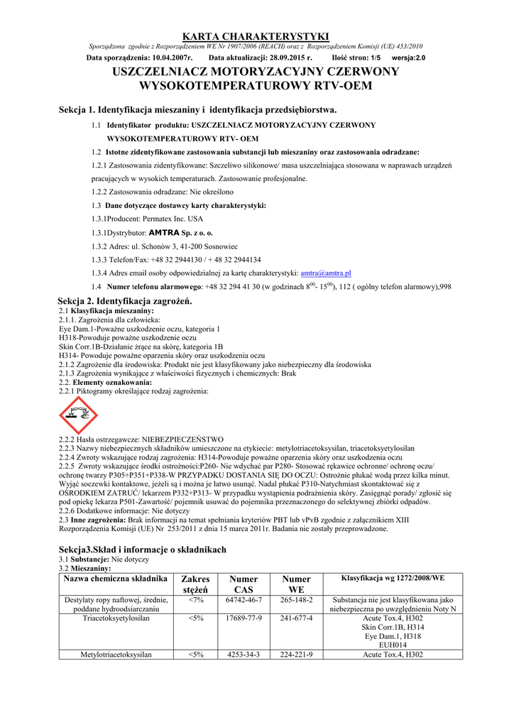 KARTA CHARAKTERYSTYKI Sporządzona zgodnie z Rozporządzeniem WE Nr 1907/2006 (REACH) oraz z Rozporządzeniem Komisji (UE) 453/2010 Data sporządzenia: 10.04.2007r. Data aktualizacji: 28.09.2015 r. Ilość stron: 1/5 wersja:2.0 USZCZELNIACZ MOTORYZACYJNY CZERWONY WYSOKOTEMPERATUROWY RTV-OEM Sekcja 1. Identyfikacja mieszaniny i identyfikacja przedsiębiorstwa. 1.1 Identyfikator produktu: USZCZELNIACZ MOTORYZACYJNY CZERWONY WYSOKOTEMPERATUROWY RTV- OEM 1.2 Istotne zidentyfikowane zastosowania substancji lub mieszaniny oraz zastosowania odradzane: 1.2.1 Zastosowania zidentyfikowane: Szczeliwo silikonowe/ masa uszczelniająca stosowana w naprawach urządzeń pracujących w wysokich temperaturach. Zastosowanie profesjonalne. 1.2.2 Zastosowania odradzane: Nie określono 1.3 Dane dotyczące dostawcy karty charakterystyki: 1.3.1Producent: Permatex Inc. USA 1.3.1Dystrybutor: AMTRA Sp. z o. o. 1.3.2 Adres: ul. Schonów 3, 41-200 Sosnowiec 1.3.3 Telefon/Fax: +48 32 2944130 / + 48 32 2944134 1.3.4 Adres email osoby odpowiedzialnej za kartę charakterystyki: [email protected] 1.4 Numer telefonu alarmowego: +48 32 294 41 30 (w godzinach 800- 1500), 112 ( ogólny telefon alarmowy),998 Sekcja 2. Identyfikacja zagrożeń. 2.1 Klasyfikacja mieszaniny: 2.1.1. Zagrożenia dla człowieka: Eye Dam.1-Poważne uszkodzenie oczu, kategoria 1 H318-Powoduje poważne uszkodzenie oczu Skin Corr.1B-Działanie żrące na skórę, kategoria 1B H314- Powoduje poważne oparzenia skóry oraz uszkodzenia oczu 2.1.2 Zagrożenie dla środowiska: Produkt nie jest klasyfikowany jako niebezpieczny dla środowiska 2.1.3 Zagrożenia wynikające z właściwości fizycznych i chemicznych: Brak 2.2. Elementy oznakowania: 2.2.1 Piktogramy określające rodzaj zagrożenia: 2.2.2 Hasła ostrzegawcze: NIEBEZPIECZEŃSTWO 2.2.3 Nazwy niebezpiecznych składników umieszczone na etykiecie: metylotriacetoksysilan, triacetoksyetylosilan 2.2.4 Zwroty wskazujące rodzaj zagrożenia: H314-Powoduje poważne oparzenia skóry oraz uszkodzenia oczu 2.2.5 Zwroty wskazujące środki ostrożności:P260- Nie wdychać par P280- Stosować rękawice ochronne/ ochronę oczu/ ochronę twarzy P305+P351+P338-W PRZYPADKU DOSTANIA SIĘ DO OCZU: Ostrożnie płukać wodą przez kilka minut. Wyjąć soczewki kontaktowe, jeżeli są i można je łatwo usunąć. Nadal płukać P310-Natychmiast skontaktować się z OŚRODKIEM ZATRUĆ/ lekarzem P332+P313- W przypadku wystąpienia podrażnienia skóry. Zasięgnąć porady/ zgłosić się pod opiekę lekarza P501-Zawartość/ pojemnik usuwać do pojemnika przeznaczonego do selektywnej zbiórki odpadów. 2.2.6 Dodatkowe informacje: Nie dotyczy 2.3 Inne zagrożenia: Brak informacji na temat spełniania kryteriów PBT lub vPvB zgodnie z załącznikiem XIII Rozporządzenia Komisji (UE) Nr 253/2011 z dnia 15 marca 2011r. Badania nie zostały przeprowadzone. Sekcja3.Skład i informacje o składnikach 3.1 Substancje: Nie dotyczy 3.2 Mieszaniny: Nazwa chemiczna składnika Zakres stężeń Numer CAS Numer WE Klasyfikacja wg 1272/2008/WE Destylaty ropy naftowej, średnie, poddane hydroodsiarczaniu Triacetoksyetylosilan <7% 64742-46-7 265-148-2 <5% 17689-77-9 241-677-4 Metylotriacetoksysilan <5% 4253-34-3 224-221-9 Substancja nie jest klasyfikowana jako niebezpieczna po uwzględnieniu Noty N Acute Tox.4, H302 Skin Corr.1B, H314 Eye Dam.1, H318 EUH014 Acute Tox.4, H302 KARTA CHARAKTERYSTYKI Sporządzona zgodnie z Rozporządzeniem WE Nr 1907/2006 (REACH) oraz z Rozporządzeniem Komisji (UE) 453/2010 Data sporządzenia: 10.04.2007r. Data aktualizacji: 28.09.2015 r. Ilość stron: 2/5 wersja:2.0 USZCZELNIACZ MOTORYZACYJNY CZERWONY WYSOKOTEMPERATUROWY RTV-OEM Kwas octowy 0,5%-2% 64-19-7 200-580-7 Skin Corr.1B, H314 Eye Dam.1, H318 EUH014 Flam. Liq.3, H226 Skin Corr.1A, H314 SEKCJA 4. ŚRODKI PIERWSZEJ POMOCY 4.1 Opis środków pierwszej pomocy: 4.1.1 Połknięcie: W razie połknięcia przepłukać jamę ustną, wyjąć protezy dentystyczne jeśli są. Przetransportować do najbliższej placówki medycznej celem podjęcia leczenia. Pokazać opakowanie lub etykietę. Jeśli wystąpią spontanicznie wymioty, trzymać głowę poniżej bioder. 4.1.2. Zatrucie inhalacyjne: Wynieść poszkodowanego z miejsca narażenia i zapewnić dostęp świeżego powietrza oraz spokój i odpoczynek. W przypadku dolegliwości (kaszel, wymioty, zawroty głowy, świszczący oddech) zapewnić pomoc lekarską. Nieprzytomnego ułożyć w pozycji bocznej. 4.1.3. Skażenie skóry: Zdjąć skażoną odzież. Skórę zmyć ciepłą wodą z mydłem. W razie wystąpienia podrażnienia skóry skontaktować się z lekarzem. 4.1.4.Skażenie oczu: Jeżeli poszkodowany nosi szkła kontaktowe niezwłocznie je wyjąć. Dokładnie przemyć oczy dużą ilością wody, wywijając powieki. Zapewnić pomoc okulisty. Uwaga: osoby narażone na skażenie oczu powinny być pouczone o konieczności i sposobie natychmiastowego płukania oczu 4.2 Najważniejsze ostre i opóźnione objawy oraz skutki narażenia: 4.2.1 Skażenie oczu: Może wystąpić podrażnienie, zaczerwienienie oraz łzawienie 4.2.2 Połknięcie: Mogą pojawić się mdłości, wymioty oraz ból brzucha 4.2.3 Kontakt ze skórą: Może wystąpić podrażnienie skóry. 4.3 Wskazania dotyczące wszelkiej natychmiastowej pomocy lekarskiej i szczególnego postępowania z poszkodowanym: Leczenie objawowe. SEKCJA 5. POSTĘPOWANIE W PRZYPADKU POŻARU 5.1 Środki gaśnicze: 5.1.1 Odpowiednie środki gaśnicze: Stosować pianę gaśniczą odporną na alkohol, CO2, proszek gaśniczy, mgła wodna. 5.1.2 Niewłaściwe środki gaśnicze: Nie stosować wody w zwartym strumieniu. 5.2 Szczególne zagrożenia związane z mieszaniną: W wyniku podgrzewania produktu wytwarzają się mieszaniny wybuchowe. Do zbierania rozlanej cieczy używać materiały absorbujące. W wyniku spalania powstają czarne dymy zawierające niebezpieczne produkty spalania, w tym tlenki węgla i tlenki metali. 5.3 Informacje dla straży pożarnej: Środki ochrony 