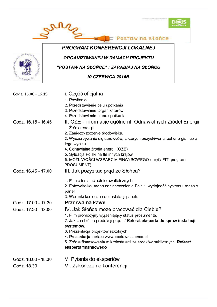 PROGRAM KONFERENCJI LOKALNEJ ORGANIZOWANEJ W RAMACH PROJEKTU "POSTAW NA SŁOŃCE" : ZARABIAJ NA SŁOŃCU 10 CZERWCA 2016R. Godz. 16.00 - 16.15 I. Część oficjalna 1. Powitanie 2. Przedstawienie celu spotkania 3. Przedstawienie Organizatorów. 4. Przedstawienie planu spotkania. Godz. 16.15 - 16.45 II. OZE - informacje ogólne nt. Odnawialnych Źródeł Energii 1. Źródła energii. 2. Zanieczyszczenie środowiska. 3. Wyczerpywanie się surowców, z których pozyskiwana jest energia i co z tego wynika. 4. Odnawialne źródła energii (OZE). 5. Sytuacja Polski na tle innych krajów. 6. MOŻLIWOŚCI WSPARCIA FINANSOWEGO (taryfy FIT, program PROSUMENT) Godz. 16.45 - 17.00 III. Jak pozyskać prąd ze Słońca? 1. Film o instalacjach fotowoltaicznych 2. Fotowoltaika, mapa nasłonecznienia Polski, wydajność systemu, rodzaje paneli 3. Warunki konieczne do instalacji paneli. Godz. 17.00 - 17.20 Godz. 17.20 - 18.00 Przerwa na kawę IV. Jak Słońce może pracować dla Ciebie? 1. Film promocyjny wyjaśniający status prosumenta. 2. Jak zarobić na produkcji prądu? Referat eksperta do spraw instalacji systemów. 3. Prezentacja projektów szkolnych 4. Prezentacja portalu www.postawnaslonce.pl 5. Źródła finansowania mikroinstalacji ze środków publicznych. Referat eksperta finansowego Godz. 18.00 - 18.30 Godz. 18.30 V. Pytania do ekspertów VI. Zakończenie konferencji