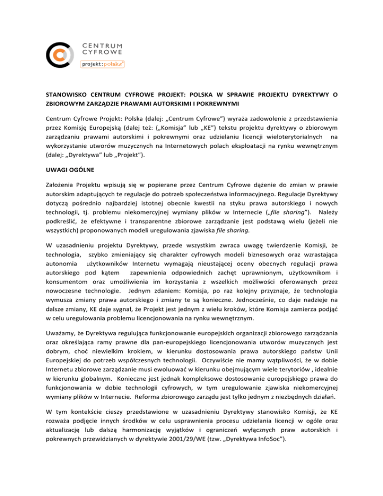 STANOWISKO CENTRUM CYFROWE PROJEKT: POLSKA W SPRAWIE PROJEKTU DYREKTYWY O ZBIOROWYM ZARZĄDZIE PRAWAMI AUTORSKIMI I POKREWNYMI Centrum Cyfrowe Projekt: Polska (dalej: „Centrum Cyfrowe”) wyraża zadowolenie z przedstawienia przez Komisję Europejską (dalej też: („Komisja” lub „KE”) tekstu projektu dyrektywy o zbiorowym zarządzaniu prawami autorskimi i pokrewnymi oraz udzielaniu licencji wieloterytorialnych na wykorzystanie utworów muzycznych na Internetowych polach eksploatacji na rynku wewnętrznym (dalej: „Dyrektywa” lub „Projekt”). UWAGI OGÓLNE Założenia Projektu wpisują się w popierane przez Centrum Cyfrowe dążenie do zmian w prawie autorskim adaptujących te regulacje do potrzeb społeczeństwa informacyjnego. Regulacje Dyrektywy dotyczą pośrednio najbardziej istotnej obecnie kwestii na styku prawa autorskiego i nowych technologii, tj. problemu niekomercyjnej wymiany plików w Internecie („file sharing”). Należy podkreślić, że efektywne i transparentne zbiorowe zarządzanie jest podstawą wielu (jeżeli nie wszystkich) proponowanych modeli uregulowania zjawiska file sharing. W uzasadnieniu projektu Dyrektywy, przede wszystkim zwraca uwagę twierdzenie Komisji, że technologia, szybko zmieniający się charakter cyfrowych modeli biznesowych oraz wzrastająca autonomia użytkowników Internetu wymagają nieustającej oceny obecnych regulacji prawa autorskiego pod kątem zapewnienia odpowiednich zachęt uprawnionym, użytkownikom i konsumentom oraz umożliwienia im korzystania z wszelkich możliwości oferowanych przez nowoczesne technologie. Jednym zdaniem: Komisja, po raz kolejny przyznaje, że technologia wymusza zmiany prawa autorskiego i zmiany te są konieczne. Jednocześnie, co daje nadzieje na dalsze zmiany, KE daje sygnał, że Projekt jest jednym z wielu kroków, które Komisja zamierza podjąć w celu uregulowania problemu licencjonowania na rynku wewnętrznym. Uważamy, że Dyrektywa regulująca funkcjonowanie europejskich organizacji zbiorowego zarządzania oraz określająca ramy prawne dla pan-‐europejskiego licencjonowania utworów muzycznych jest dobrym, choć niewielkim krokiem, w kierunku dostosowania prawa autorskiego państw Unii Europejskiej do potrzeb współczesnych technologii. Oczywiście nie mamy wątpliwości, że w dobie Internetu zbiorowe zarządzanie musi ewoluować w kierunku obejmującym wiele terytoriów , idealnie w kierunku globalnym. Konieczne jest jednak kompleksowe dostosowanie europejskiego prawa do funkcjonowania w dobie technologii cyfrowych, w tym uregulowanie zjawiska niekomercyjnej wymiany plików w Internecie. Reforma zbiorowego zarządu jest tylko jednym z niezbędnych działań. W tym kontekście cieszy przedstawione w uzasadnieniu Dyrektywy stanowisko Komisji, że KE rozważa podjęcie innych środków w celu usprawnienia procesu udzielania licencji w ogóle oraz aktualizację lub dalszą harmonizację wyjątków i ograniczeń wyłącznych praw autorskich i pokrewnych przewidzianych w dyrektywie 2001/29/WE (tzw. „Dyrektywa InfoSoc”). Oprócz powyższego, w szczególności należy zwrócić uwagę na konieczność rozważenia prawa wyczerpania w odniesieniu do obrotu w Internecie egzemplarzem cyfrowym utworu. W ramach uwag ogólnych nie można pominąć faktu, że Dyrektywa reguluje udzielanie licencji wieloterytorialnych w Internecie jedynie w odniesieniu do utworów muzycznych i jedynie w odniesieniu do praw autorskich do tych utworów. Tym samym Projekt nie dotyczy praw pokrewnych do fonogramów ani praw autorskich czy pokrewnych do żadnych innych przedmiotów prawa autorskiego. W uzasadnieniu Dyrektywy Komisja zauważa, że w stosunku do innych praw potrzeba regulacji nie jest aż tak nagląca. Wręcz przeciwnie. Centrum Cyfrowe podnosi, ze od lat zwraca się uwagę na potrzebę kompleksowej regulacji problemu licencjonowania wszystkich przedmiotów praw autorskich i pokrewnych w Internecie. Działania Komisji w tym zakresie oceniamy jako zdecydowanie zbyt wolne i fragmentaryczne. Podnosimy także, że nie można tracić z pola widzenia interesu podmiotów, które powinny stać w centrum systemu zbiorowego zarządu, tj. przede wszystkim interesu indywidualnych twórców i artystów wykonawców. W erze cyfrowej należy tak konstruować europejski system zbiorowego zarządu aby efektywnie uwzględniał także twórczość Internetową indywidualnych użytkowników sieci. Dyrektywa powinna zaproponować mechanizmy umożliwiające takim użytkownikom-‐ twórcom realne uczestniczenie w systemie i czerpanie korzyści finansowych z tworzonych w Internecie treści. UWAGI SZCZEGÓŁOWE Funkcjonowanie organizacji zbiorowego zarządzania Z zadowoleniem należy przyjąć regulacje Dyrektywy dotyczące standardów działania organizacji zbiorowego zarządzania (dalej: „ozz”). Projekt kodyfikuje obecne zasady wynikające z orzecznictwa Europejskiego Trybunału Sprawiedliwości oraz orzecznictwa KE w sprawach antymonopolowych oraz wprowadza uniwersalne zasady działania ozz w odniesieniu do przejrzystości finansowej oraz zarządzania. Należy zwrócić uwagę, że większość regulacji zwartych w rozdziałach I i II Dyrektywy dotyczących funkcjonowania i przejrzystości finansowej wszystkich organizacji zbiorowego zarządzania została już wprowadzona do polskiego prawa, w tym w szczególności obowiązek publikacji sprawozdań finansowych. W tym zakresie implementacja Dyrektywy do polskiego porządku prawnego nie powinna stwarzać trudności. Polski ustawodawca w znacznej mierze wyprzedził ustawodawcę europejskiego wprowadzając standardy przejrzystości dla polskich ozz. W tym roku po raz pierwszy polskie ozz opublikowały sprawozdania finansowe, które podlegają badaniu biegłego rewidenta. Centrum Cyfrowe uzyskało informacje, że – po uzupełnieniu -‐ zostaną one również poddane szczegółowej ocenie przez Ministerstwo Kultury i Dziedzictwa Narodowego (dalej: „MKiDN”). Centr