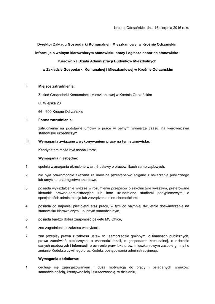 Krosno Odrzańskie, dnia 16 sierpnia 2016 roku Dyrektor Zakładu Gospodarki Komunalnej i Mieszkaniowej w Krośnie Odrzańskim informuje o wolnym kierowniczym stanowisku pracy i ogłasza nabór na stanowisko: Kierownika Działu Administracji Budynków Mieszkalnych w Zakładzie Gospodarki Komunalnej i Mieszkaniowej w Krośnie Odrzańskim I. Miejsce zatrudnienia: Zakład Gospodarki Komunalnej i Mieszkaniowej w Krośnie Odrzańskim ul. Wiejska 23 66 - 600 Krosno Odrzańskie II. Forma zatrudnienia: zatrudnienie na podstawie umowy o pracę w pełnym wymiarze czasu, na kierowniczym stanowisku urzędniczym. III. Wymagania związane z wykonywaniem pracy na tym stanowisku: Kandydatem może być osoba która: Wymagania niezbędne: 1. spełnia wymagania określone w art. 6 ustawy o pracownikach samorządowych, 2. nie była prawomocnie skazana za umyślne przestępstwo ścigane z oskarżenia publicznego lub umyślne przestępstwo skarbowe, 3. posiada wykształcenie wyższe w rozumieniu przepisów o szkolnictwie wyższym, preferowane kierunki: prawno-administracyjne lub inne uzupełnione studiami podyplomowymi o specjalności: administracja lub zarządzanie nieruchomościami, 4. posiada co najmniej pięcioletni staż pracy, w tym co najmniej dwuletnie doświadczenie na stanowisku kierowniczym lub innym samodzielnym, 5. posiada bardzo dobrą znajomość pakietu MS Office, 6. zna zagadnienia z zakresu windykacji, 7. zna przepisy prawa z zakresu ustaw o: samorządzie gminnym, o finansach publicznych, prawo zamówień publicznych, o własności lokali, o gospodarce komunalnej, o ochronie danych osobowych i informacji, o ochronie praw lokatorów, mieszkaniowym zasobie gminy i o zmianie Kodeksu cywilnego oraz Kodeks postępowania administracyjnego. Wymagania dodatkowe: 1. cechuje się zaangażowaniem i dużą motywacją do pracy i osiąganych wyników, samodzielnością, kreatywnością i skutecznością w działaniu, 2. jest dyspozycyjna i obowiązkowa. 3. w bieżącej pracy cechuje się starannością i systematycznością, 4. posiada umiejętności zarządzania zespołem i zdolność planowania pracy w zespole, 5. posiada umiejętność myślenia strategicznego, 6. posiada umiejętność rozwiązywania spraw spornych oraz radzenia sobie w sytuacjach konfliktowych, 7. posiada umiejętność negocjacji, 8. posiada doświadczenie związane z windykacją należności, 9. znajomość zagadnień związanych z prowadzeniem gospodarki finansowej wspólnot mieszkaniowych, 10. znajomość zagadnień księgowych i rozliczeń najemców z tytułu najmu lokali, 11. znajomość i umiejętność obsługi bankowości elektronicznej związanej z obsługą wspólnot mieszkaniowych. IV. Zakres zadań wykonywanych na stanowisku: 1. kierowanie działalnością Działu zgodnie z określonymi dla Działu zadaniami oraz wytycznymi Dyrektora Zakładu, 2. prawidłowe organizowanie pracowników w tym: pracy kierowanego zespołu i podziału pracy 1) ustalanie zakresów czynności dla pracowników, 2) nadzór i kontrola nad wykonywanymi zadaniami, 3) prowadzenie kontroli wewnętrznej w zakresie funkcjonowania Działu, 4) realizowanie zadań wynikających z kontroli zarządczej. pomiędzy 3. koordynowanie, nadzór i kontrola pracy Działu w zakresie właściwej realizacji zadań w obszarze gospodarki mieszkaniowej lokali komunalnych, administrowanych wspólnot mieszkaniowych, a także prowadzonych w tym zakresie rozliczeń i działalności windykacyjnej, 4. kierowanie całością spraw związanych z eksploatacją, remontami budynków oraz przygotowanie zleceń robót remontowo-budowlanych, dokonywanie przetargów, zamówień publicznych i całokształtu spraw związanych z należytym utrzymaniem substancji mieszkalnej, właściwą obsługą lokatorów mieszkań komunalnych, właścicieli w administrowanych wspólnotach mieszkaniowych, 5. prowadzenie negocjacji ze świadczeniodawcami różnego rodzaju usług na rzecz budynków komunalnych i wspólnot mieszkaniowych oraz przygotowaniem umów o świadczenie tych usług i ich rozliczanie finansowe, 6. uczestniczenie w opracowaniu planów techniczno-ekonomicznych i rzeczowo-finansowych oraz czuwanie nad prawidłową ich realizacją do wysokości ustalonych środków finansowych w zatwierdzonym planie, 7. opracowanie okresowych planów remontowych zasobów komunalnych (budynków, mieszkań i lokali użytkowych), 8. opracowanie okresowych planów finansowych w zakresie finansowania gospodarki komunalnymi zasobami mieszkaniowymi i lokalami użytkowymi oraz efektów ekonomicznych działalności windykacyjnej zaległych należności czynszowych, 9. organizowanie i podejmowanie działań mających na celu odzyskiwanie zaległych należności Zakładu z tytułu najmu lokali użytkowych i mieszkalnych, 10. podejmowanie i koordynowanie działań w zakresie windykacji należności Zakładu z tytułu najmu lokali użytkowych i mieszkalnych, 11. podejmowanie i koordynowanie działań związanych z eksmisją najemców, zamianą lokali i przygotowywaniem tych lokali do zamieszkania, 12. zapewnienie i realizacja okresowych przeglądów budynków, mieszkań i lokali komunalnych oraz administrowanych wspólnot mieszkaniowych, 13. nadzorowanie i udział w odbiorach częściowych i końcowych robót realizowanych remontów w administrowanych nieruchomościach, 14. prowadzenie zebrań wspólnot mieszkaniowych, 15. prowadzenie korespondencji zewnętrznej dotyczącej funkcjonowania kierowanego Działu, 16. nadzorowanie przestrzegania przez pracowników Działu - dyscypliny pracy, przepisów o ochronie informacji niejawnych oraz przepisów o ochronie danych osobowych oraz zasad właściwych standardów obsługi petentów, 17. przygotowywanie projektów sprawozdań, ocen, analiz i bieżących informacji o realizacji zadań tematycznie związanych z działalnością Działu, 18. współpraca z pozostałymi komórkami organizacyjnymi Zakładu, wydziałami Urzędu Miasta w Krośnie Odrzańskim oraz innymi instytucja