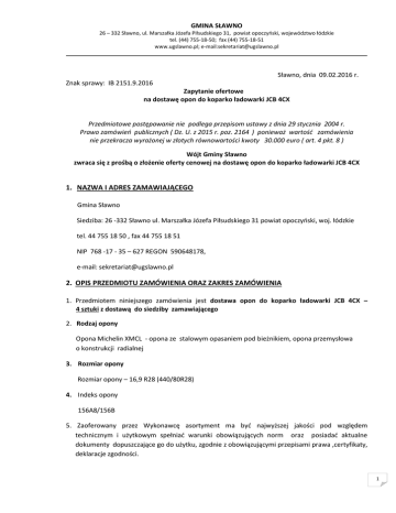 GMINA SŁAWNO 26 – 332 Sławno, ul. Marszałka Józefa Piłsudskiego 31, powiat opoczyński, województwo łódzkie tel. (44) 755-18-50; fax (44) 755-18-51 www.ugslawno.pl; e-mail:[email protected] _____________________________________________________________________________________________________ Sławno, dnia 09.02.2016 r. Znak sprawy: IB 2151.9.2016 Zapytanie ofertowe na dostawę opon do koparko ładowarki JCB 4CX Przedmiotowe postępowanie nie podlega przepisom ustawy z dnia 29 stycznia 2004 r. Prawo zamówień publicznych ( Dz. U. z 2015 r. poz. 2164 ) ponieważ wartość zamówienia nie przekracza wyrażonej w złotych równowartości kwoty 30.000 euro ( art. 4 pkt. 8 ) Wójt Gminy Sławno zwraca się z prośbą o złożenie oferty cenowej na dostawę opon do koparko ładowarki JCB 4CX 1. NAZWA I ADRES ZAMAWIAJĄCEGO Gmina Sławno Siedziba: 26 -332 Sławno ul. Marszałka Józefa Piłsudskiego 31 powiat opoczyński, woj. łódzkie tel. 44 755 18 50 , fax 44 755 18 51 NIP 768 -17 - 35 – 627 REGON 590648178, e-mail: [email protected] 2. OPIS PRZEDMIOTU ZAMÓWIENIA ORAZ ZAKRES ZAMÓWIENIA 1. Przedmiotem niniejszego zamówienia jest dostawa opon do koparko ładowarki JCB 4CX – 4 sztuki z dostawą do siedziby zamawiającego 2. Rodzaj opony Opona Michelin XMCL - opona ze stalowym opasaniem pod bieżnikiem, opona przemysłowa o konstrukcji radialnej 3. Rozmiar opony Rozmiar opony – 16,9 R28 (440/80R28) 4. Indeks opony 156A8/156B 5. Zaoferowany przez Wykonawcę asortyment ma być najwyższej jakości pod względem technicznym i użytkowym spełniać warunki obowiązujących norm oraz posiadać aktualne dokumenty dopuszczające go do użytku, zgodnie z obowiązującymi przepisami prawa ,certyfikaty, deklaracje zgodności. 1 GMINA SŁAWNO 26 – 332 Sławno, ul. Marszałka Józefa Piłsudskiego 31, powiat opoczyński, województwo łódzkie tel. (44) 755-18-50; fax (44) 755-18-51 www.ugslawno.pl; e-mail:[email protected] _____________________________________________________________________________________________________ 6. Jeżeli w opisie przedmiotu zamówienia wskazano jakikolwiek znak towarowy, patent czy pochodzenie - należy przyjąć, że wskazane patenty, znaki towarowe, pochodzenie określają parametry techniczne, eksploatacyjne, użytkowe, co oznacza, że zamawiający dopuszcza złożenie oferty w tej części przedmiotu zamówienia o równoważnych parametrach technicznych, eksploatacyjnych i użytkowych. 3. WARUNKI UDZIAŁU WYKONAWCÓW W POSTĘPOWANIU O wykonanie przedmiotu zamówienia mogą ubiegać się Wykonawcy, którzy: 1. Złożą ofertę zgodną z zakresem zamówienia oraz terminem jej złożenia. 2. Ofertę należy złożyć zgodnie ze wzorem stanowiącym załącznik Nr 1 – Formularz ofertowy – do niniejszego zapytania ofertowego. 3. Posiadają uprawnienia do wykonywania określonej działalności oraz wiedzę i doświadczenie w tego typu przedmiocie zamówienia, dysponują potencjałem technicznym i osobami zdolnymi do profesjonalnego wykonania przedmiotu zamówienia. 4. Znajdują się w sytuacji ekonomicznej i finansowej zapewniającej profesjonalne wykonanie przedmiotu zamówienia. 4. RODZAJE I OPIS KRYTERIÓW, KTÓRYMI ZAMAWIAJĄCY BĘDZIE SIĘ KIEROWAŁ PRZY WYBORZE OFERTY 1. Przy wyborze ofert Zamawiający będzie się kierował jednym kryterium oceny ważnych ofert: - najniższa cena - waga – 100 % Ocena punktowa kryterium dokonana zostanie zgodnie z formułą: Wg kryterium ceny: Po = N : W x Z Po - ilość punktów przyznanych danej ofercie za cenę ( brutto ) N - najniższa cena ( brutto ) z zaoferowanych W - cena ( brutto ) z badanej oferty Z - znaczenie czynnika (100 %) Kryterium oceny oferty jest obowiązująca wykonawcę cena brutto. 2. Proponowana cena brutto winna obejmować wszystkie koszty, jakie poniesie Wykonawca przy kompleksowej realizacji przedmiotu zamówienia. 3. Cena brutto może być tylko jedna, nie dopuszcza się składania ofert wariantowych oraz ofert częściowych. 2 GMINA SŁAWNO 26 – 332 Sławno, ul. Marszałka Józefa Piłsudskiego 31, powiat opoczyński, województwo łódzkie tel. (44) 755-18-50; fax (44) 755-18-51 www.ugslawno.pl; e-mail:[email protected] _____________________________________________________________________________________________________ 5. Rozliczenia między Zamawiającym, a Wykonawcą będą prowadzone w złotych polskich. Nie dopuszcza się rozliczeń w walutach obcych. 6. Wykonawca otrzyma wynagrodzenie tylko za zrealizowanie przedmiotu zamówienia. 5. TERMIN WYKONANIA ZAMÓWIENIA Termin wykonania przedmiotu zamówienia przez Wykonawcę – w ciągu 7 dni od daty podpisania umowy. 6. MIEJSCE, SPOSÓB I TERMIN SKŁADANIA OFERT 1. Ofertę w zamkniętej kopercie w siedzibie zamawiającego: należy złożyć do dnia 18.02.2016 r. do godz. 10.00 Urząd Gminy Sławno ul. Marszałka Józefa Piłsudskiego 31 pokój Nr 13 - sekretariat z dopiskiem: Oferta w postępowaniu o udzielenie zamówienia na: dostawę opon do koparko ładowarki JCB 4CX „Nie otwierać przed dniem 18 .02.2016 r. do godz. 10.30” Oraz nazwą, dokładnym adresem Wykonawcy ( dopuszcza się odcisk pieczęci). 2. Oferta otrzymana przez Zamawiającego po upływie terminu na składanie ofert lub opisana niezgodnie z opisem powyżej zostanie zwrócona bez otwierania Wykonawcy i nie będzie podlegała ocenie. Wykonawca może złożyć tylko jedną ofertę. 3. Otwarcie złożonych w postępowaniu ofert nastąpi dnia 18.02.2016 r. o godz. 10.30 w siedzibie zamawiającego: Urząd Gminy Sławno ul. Marszałka Józefa Piłsudskiego 31 sala konferencyjna 4. Wykonawca ponosi wszystkie koszty związane z przygotowaniem i złożeniem oferty. 3 GMINA SŁAWNO 26 – 332 Sławno, ul. Marszałka Józefa Piłsudskiego 31, powiat opoczyński, województwo łódzkie tel. (44) 755-18-50; fax (44) 755-18-51 www.ugslawno.pl; e-mail:[email protected] _____________________________________________________________________________________________________ 5. Ofert