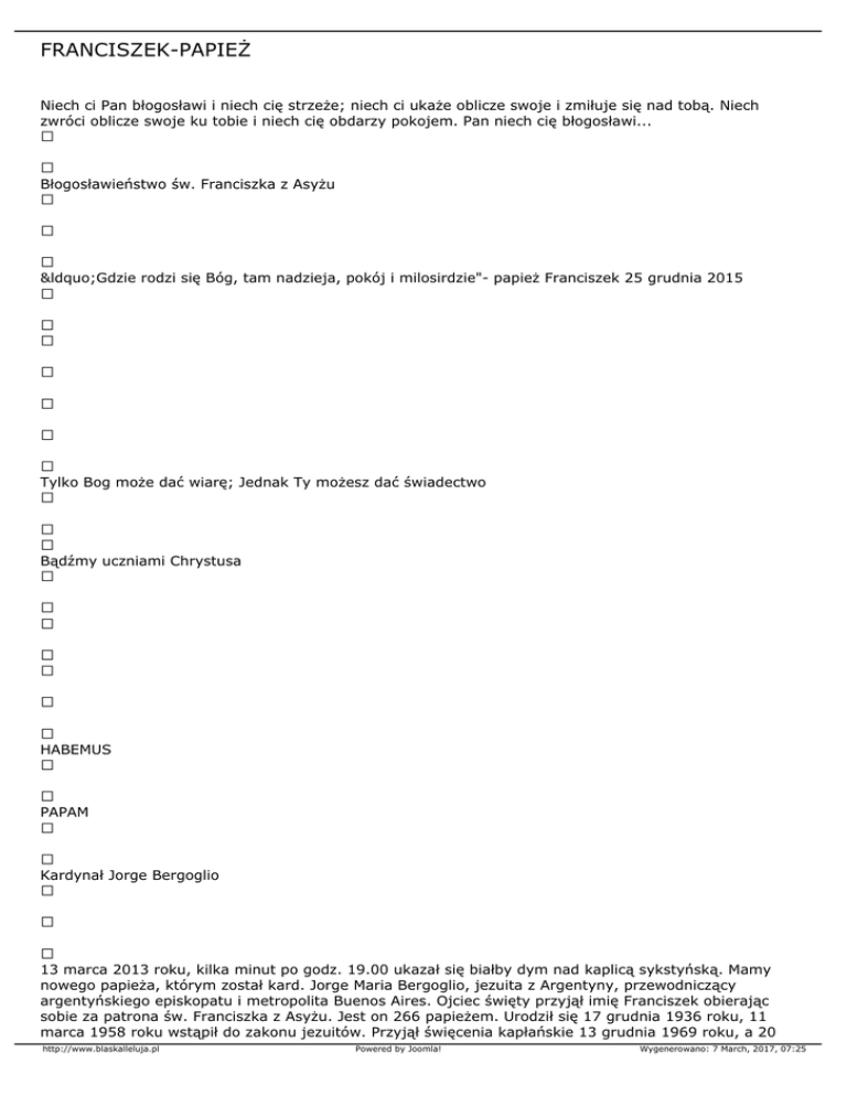 FRANCISZEK-PAPIEŻ Niech ci Pan błogosławi i niech cię strzeże; niech ci ukaże oblicze swoje i zmiłuje się nad tobą. Niech zwróci oblicze swoje ku tobie i niech cię obdarzy pokojem. Pan niech cię błogosławi... Błogosławieństwo św. Franciszka z Asyżu “Gdzie rodzi się Bóg, tam nadzieja, pokój i milosirdzie"- papież Franciszek 25 grudnia 2015 Tylko Bog może dać wiarę; Jednak Ty możesz dać świadectwo Bądźmy uczniami Chrystusa HABEMUS PAPAM Kardynał Jorge Bergoglio 13 marca 2013 roku, kilka minut po godz. 19.00 ukazał się białby dym nad kaplicą sykstyńską. Mamy nowego papieża, którym został kard. Jorge Maria Bergoglio, jezuita z Argentyny, przewodniczący argentyńskiego episkopatu i metropolita Buenos Aires. Ojciec święty przyjął imię Franciszek obierając sobie za patrona św. Franciszka z Asyżu. Jest on 266 papieżem. Urodził się 17 grudnia 1936 roku, 11 marca 1958 roku wstąpił do zakonu jezuitów. Przyjął święcenia kapłańskie 13 grudnia 1969 roku, a 20 http://www.blaskalleluja.pl Powered by Joomla! Wygenerowano: 7 March, 2017, 07:25 maja 1992 roku został mianowany biskupem pomocniczym Buenos Aires. W listopadzie 1998 został jednocześnie ordynariuszem dla wiernych rytów orientalnych, mieszkających w Argentynie (bez własnego ordynariusza. )W lutym 2001 roku Jan Paweł II wyniósł go do godności kardynalskiej, nadając tytuł prezbitera S. Roberto BellarminoW latach 2005-2011 (dwie kadencje po trzy lata) był przewodniczącym Konferencji Episkopatu Argentyny (Conferencia Episcopal Argentina). 1 Homilia di Papa Francesco Msza święta z kardynałami Kaplica Sykstyńska Czwartek, 14 marca 2013 W tych trzech czytaniach widzę, że jest coś wspólnego – to ruch. W pierwszym czytaniu ruch jest obecny w wędrowaniu, w drugim czytaniu ruch ten obecny jest w budowaniu Kościoła; w trzecim, w Ewangelii, w wyznawaniu: wędrowanie, budowanie, wyznawanie. Wędrowanie. „Chodźcie, domu Jakuba, postępujmy w światłości Pańskiej!” (Iz 2, 5). To jest pierwsze co Bóg powiedział do Abrahama: Chodź w mojej obecności i bądź nienaganny. Wędrowanie: nasze życie jest wędrówką i kiedy się zatrzymujemy, coś nie gra. Wędrować nieustannie, w obecności Pana, w światłości Pana, starając się żyć tak nienagannie, jak tego Bóg żądał od Abrahama w Swojej obietnicy. Budowanie. Budować Kościół. Mówi się o kamieniach: kamienie mają swoją trwałość; ale kamienie żywe, kamienie namaszczone Duchem Świętym. Budować Kościół, Oblubienicę Chrystusa, na tym żywym kamieniu węgielnym, którym jest ten sam Pan. Oto kolejny ruch naszego życia: budować. Trzecie - wyznawanie. Możemy chodzić ile chcemy, możemy budować wiele rzeczy, ale jeśli nie wyznajemy Jezusa Chrystusa, nie jest dobrze. Staniemy się użyteczną organizacją pozarządową, ale nie Kościołem, Oblubienicą Chrystusa. Kiedy nie idzie się do przodu, stoi się. Kiedy nie buduje się na kamieniu, co się dzieje? Dzieje się to, co zdarza się dzieciom budującym na plaży zamki z piasku – wszystko się wali, jest pozbawione trwałości. Kiedy nie wyznajemy Jezusa Chrystusa, przychodzi mi na myśl zdanie Leona Bloya: „Kto się nie modli do Pana, modli się do diabła”. Kiedy nie wyznaje Chrystusa, wyznaje światowość diabła, światowość demona. Wędrowanie, budowanie, wyznawanie. Ale sprawa nie jest taka łatwa, ponieważ w wędrowaniu, budowaniu, wyznawaniu, czasami następują wstrząsy, są ruchy, które nie są właściwym ruchem chodzenia: to ruchy, które nas ciągną wstecz. W tej Ewangelii następuje szczególna sytuacja. Ten sam Piotr, który wyznał Jezusa Chrystusa, mówi Mu: Ty jesteś Chrystus, Syn Boga żywego. Pójdę za Tobą, ale nie mówmy o krzyżu. To nie wchodzi w grę. Pójdę za Tobą z innymi możliwościami, bez krzyża. Kiedy wędrujemy bez Krzyża, kiedy budujemy bez Krzyża i kiedy wyznajemy Chrystusa bez Krzyża, nie jesteśmy uczniami Pana: jesteśmy ludźmi tego świata, jesteśmy biskupami, kapłanami, kardynałami, papieżami, ale nie uczniami Pana. Chciałbym, abyśmy wszyscy, po tych dniach łaski, mieli odwagę, właśnie odwagę, chodzić w obecności Pana, z Krzyżem Pana; budować Kościół na Krwi Pana, przelanej na Krzyżu; i wyznawać jedyną chwałę: Chrystusa Ukrzyżowanego. W ten sposób Kościół będzie szedł naprzód. Życzę nam wszystkim, aby Duch Święty, przez wstawiennictwo Maryi, naszej Matki, udzielił nam tej łaski: wędrowania, budowania, wyznawania Jezusa Chrystusa Ukrzyżowanego. Niech się tak stanie. Amen. http://www.blaskalleluja.pl Powered by Joomla! Wygenerowano: 7 March, 2017, 07:25 Moje refleksje: Pragnął aby kościół był ubogi i dla ubogich,,, i wybór padł na Niego. "Pierwszy jezuita papieżem, pierwszy latynoamerykanin, pierwszy Franciszek". Przyjmując imię Franciszek zapewne miał świadomość, nie tylko symboliki ubóstwa związanej z imieniem, ale i słów, jakie św. Franciszek z Asyżu usłyszał od Chrystusa w czasie objawienia: "Franciszku, idź odbuduj mój Kościół, gdyż popada w ruinę" Argentyński kardynał Jorge Mario Bergoglio, dziś - papież Franciszek nigdy nie zabiegał o godności. Żył skromnie. Gdy został metropolitą argentyńskiej stolicy zrezygnował z pałacu arcybiskupiego. Wybrał ubogie mieszkanie. Sam sobie sprzątał, gotował, prał. Często można było go spotkać w autobusie komunikacji publicznej. Gdy w 2001 roku Jan Paweł II kreował go kardynałem poprosił wiernych, by zebrane dla niego pieniądze na podróż do Rzymu oddali ubogim. Wieczorem 13 marca 2013 roku na balkonie Bazyliki św. Piotra poprosił wiwatujący tłum o modlitwę.czytaj więcej Warto też wiedzieć ... ŚW. FRANCISZEK KSAWERY (jezuita) Boże Przedwieczny, Stwórco wszechrzeczy, pomnij, że dusze niewiernych są dziełem rąk Twoich, uczynione na obraz i podobieństwo Twoje. Oto, Panie! ku zelżywości Twojej piekło się tymi duszami napeł