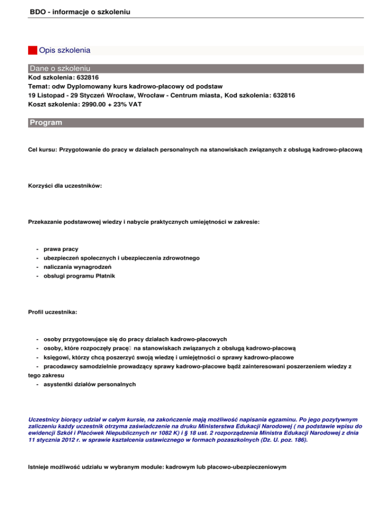 BDO - informacje o szkoleniu Opis szkolenia Dane o szkoleniu Kod szkolenia: 632816 Temat: odw Dyplomowany kurs kadrowo-płacowy od podstaw 19 Listopad - 29 Styczeń Wrocław, Wrocław - Centrum miasta, Kod szkolenia: 632816 Koszt szkolenia: 2990.00 + 23% VAT Program Cel kursu: Przygotowanie do pracy w działach personalnych na stanowiskach związanych z obsługą kadrowo-płacową Korzyści dla uczestników: Przekazanie podstawowej wiedzy i nabycie praktycznych umiejętności w zakresie: - prawa pracy - ubezpieczeń społecznych i ubezpieczenia zdrowotnego - naliczania wynagrodzeń - obsługi programu Płatnik Profil uczestnika: - osoby przygotowujące się do pracy działach kadrowo-płacowych - osoby, które rozpoczęły pracę na stanowiskach związanych z obsługą kadrowo-płacową - księgowi, którzy chcą poszerzyć swoją wiedzę i umiejętności o sprawy kadrowo-płacowe - pracodawcy samodzielnie prowadzący sprawy kadrowo-płacowe bądź zainteresowani poszerzeniem wiedzy z tego zakresu - asystentki działów personalnych Uczestnicy biorący udział w całym kursie, na zakończenie mają możliwość napisania egzaminu. Po jego pozytywnym zaliczeniu każdy uczestnik otrzyma zaświadczenie na druku Ministerstwa Edukacji Narodowej ( na podstawie wpisu do ewidencji Szkół i Placówek Niepublicznych nr 1082 K) i § 18 ust. 2 rozporządzenia Ministra Edukacji Narodowej z dnia 11 stycznia 2012 r. w sprawie kształcenia ustawicznego w formach pozaszkolnych (Dz. U. poz. 186). Istnieje możliwość udziału w wybranym module: kadrowym lub płacowo-ubezpieczeniowym BDO - informacje o szkoleniu Moduł: KADRY 1. Stosunek pracy: - zawieranie umów o pracę - dokumenty o które można prosić kandydata do pracy - cechy stosunku pracy - forma, elementy i konstrukcja umowy o pracę - rodzaje umów o pracę - umowa o pracę na okres próbny - po zmianach Kodeksu Pracy od 22.02.2016r. - umowa o pracę na czas określony ( w tym umowa na zastępstwo) - po zmianach Kodeksu Pracy od 22.02.2016r. - umowa o pracę na czas nieokreślony - wprowadzanie zmian do umowy o pracę - zmiana warunków umowy o pracę - porozumienie zmieniające - wypowiedzenie warunków pracy i płacy - czasowe powierzenie innej pracy uzasadnione potrzebami pracodawcy - rozwiązywanie umów o pracę - pracownicy podlegający ochronie, - tryby rozwiązywania umów o pracę, - rozwiązanie umowy o pracę na mocy porozumienia stron, - wypowiedzenie umowy o pracę z zachowaniem okresu wypowiedzenia - rozwiązywanie umów o pracę bez wypowiedzenia - szczególne zasady rozwiazywania umów o pracę z przyczyn dotyczących pracodawcy (tryb dokonywania zwolnień grupowych, indywidualnych, uprawnienia osób objętych szczególną ochroną) - sposoby obliczania terminu wypowiedzenia - prawidłowe formułowanie przyczyn wypowiedzenia umowy o pracę - zwolnienie z obowiązku świadczenia pracy w okresie wypowiedzenia - roszczenia pracownika wobec pracodawcy w przypadku nieprawidłowego rozwiązania umowy o pracę 2. Dokumentacja pracownicza - umowy o pracę, aneksy, świadectwo pracy, prowadzenie akt osobowych, zaświadczenia i oświadczenia. 3. Badania lekarskie i szkolenia BHP - badania lekarskie i szkolenie BHP dla pracownika przyjmowanego do pracy - badania okresowe i kontrolne - ważność badań lekarskich i szkoleń BHP dla poszczególnych grup pracowników 4. Urlopy i inne nieobecności pracownicze: - urlopy wypoczynkowe: - wymiar urlopu wypoczynkowego - nabywanie prawa do urlopu wypoczynkowego w pierwszym roku pracy - wymiar etatu a wymiar urlopu wypoczynkowego - urlop proporcjonalny i urlop uzupełniający - zasady udzielania i wykorzystywania urlopów wypoczynkowych - tworzenie planu urlopów - urlop zaległy i zasady jego udzielania - zasady wypłacania ekwiwalentu za niewykorzystany urlop wypoczynkowy - prowadzenie dokumentacji związanej z udzielaniem urlopów - urlopy bezpłatne: - zasady udzielania urlopu bezpłatnego i czas jego trwania - wpływ urlopu bezpłatnego na uprawnienia pracownicze - urlopy macierzyńskie i rodzicielskie: - wymiar urlopu macierzyńskiego i rodzicielskiego - zasady udzielania urlopu macierzyńskiego i rodzicielskiego - podział urlopu macierzyńskiego i rodzicielskiego na części - łączenie urlopu rodzicielskiego z pracą - dokumentacja związana z udzielaniem urlopów macierzyńskich i rodzicielskich - wnioski i dokumentacja uzupełniająca BDO - informacje o szkoleniu - urlop ojcowski - wymiar urlopu ojcowskiego i jego podział na części - możliwość przerwania urlopu ojcowskiego - dokumentacja związana z udzielaniem urlopu ojcowskiego - wniosek o udzielenie urlopu i załączniki do wniosku - urlopy wychowawcze - prawo i wymiar urlopu wychowawczego - obniżenie wymiaru czasu pracy osoby uprawionej do urlopu wychowawczego - ochrona przed rozwiązaniem stosunku pracy dla osoby uprawnionej do urlopu wychowawczego - zwolnienie od pracy na podstawie art.188 k.p. - zasady udzielania opieki nad dzieckiem po zmianach Kodeksu Pracy od 2 stycznia 2016r. - inne nieobecności pracownicze: - niezdolność do pracy ( zwolnienia lekarskie) - nieobecności usprawiedliwione i nieusprawiedliwione 5. Czas pracy: - systemy czasu pracy ( ze szczegółowym omówieniem podstawowego i równoważnego czasu pracy) konstruowanie harmonogramów czasu pracy w poszczególnych systemach czasu pracy wprowadzanie zmian do zaplanowanego harmonogramu ustalanie okresu rozliczeniowego praca w soboty, niedziele i święta rekompensowanie pracy w dni wolne od pracy zasady pracy w godzinach nadliczbowych i rekompensowanie pracy w nadgodzinach czasem wolnym prawidłowe ewidencjonowanie czasu pracy 6. Odpowiedzialność prawna w stosunkach pracy: - odpowiedzialność porządkowa pracowników - katalog kar, jakie pracodawca może zastosować wobec pracownika naruszającego zasady obowiązujące w firmie - odpowiedzialność materialna pracowników - umowy o zakazie konkurencji 7. Stosunki cywilnoprawne: - czym różni się sto