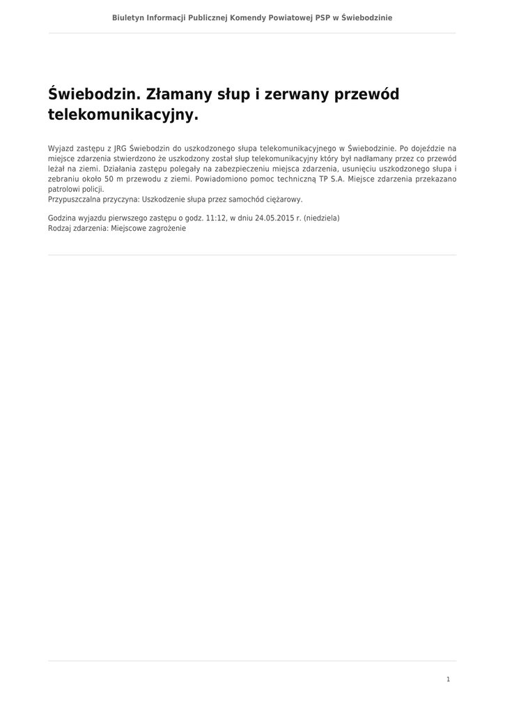 Biuletyn Informacji Publicznej Komendy Powiatowej PSP w Świebodzinie Świebodzin. Złamany słup i zerwany przewód telekomunikacyjny. Wyjazd zastępu z JRG Świebodzin do uszkodzonego słupa telekomunikacyjnego w Świebodzinie. Po dojeździe na miejsce zdarzenia stwierdzono że uszkodzony został słup telekomunikacyjny który był nadłamany przez co przewód leżał na ziemi. Działania zastępu polegały na zabezpieczeniu miejsca zdarzenia, usunięciu uszkodzonego słupa i zebraniu około 50 m przewodu z ziemi. Powiadomiono pomoc techniczną TP S.A. Miejsce zdarzenia przekazano patrolowi policji. Przypuszczalna przyczyna: Uszkodzenie słupa przez samochód ciężarowy. Godzina wyjazdu pierwszego zastępu o godz. 11:12, w dniu 24.05.2015 r. (niedziela) Rodzaj zdarzenia: Miejscowe zagrożenie 1