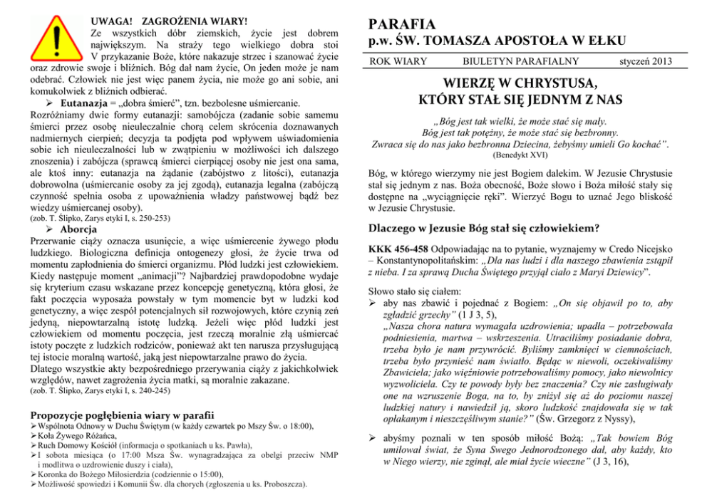 UWAGA! ZAGROŻENIA WIARY! Ze wszystkich dóbr ziemskich, życie jest dobrem największym. Na straży tego wielkiego dobra stoi V przykazanie Boże, które nakazuje strzec i szanować życie oraz zdrowie swoje i bliźnich. Bóg dał nam życie, On jeden może je nam odebrać. Człowiek nie jest więc panem życia, nie może go ani sobie, ani komukolwiek z bliźnich odbierać. Eutanazja = „dobra śmierć”, tzn. bezbolesne uśmiercanie. Rozróżniamy dwie formy eutanazji: samobójcza (zadanie sobie samemu śmierci przez osobę nieuleczalnie chorą celem skrócenia doznawanych nadmiernych cierpień; decyzja ta podjęta pod wpływem uświadomienia sobie ich nieuleczalności lub w zwątpieniu w możliwości ich dalszego znoszenia) i zabójcza (sprawcą śmierci cierpiącej osoby nie jest ona sama, ale ktoś inny: eutanazja na żądanie (zabójstwo z litości), eutanazja dobrowolna (uśmiercanie osoby za jej zgodą), eutanazja legalna (zabójczą czynność spełnia osoba z upoważnienia władzy państwowej bądź bez wiedzy uśmiercanej osoby). (zob. T. Ślipko, Zarys etyki I, s. 250-253) Aborcja Przerwanie ciąży oznacza usunięcie, a więc uśmiercenie żywego płodu ludzkiego. Biologiczna definicja ontogenezy głosi, że życie trwa od momentu zapłodnienia do śmierci organizmu. Płód ludzki jest człowiekiem. Kiedy następuje moment „animacji”? Najbardziej prawdopodobne wydaje się kryterium czasu wskazane przez koncepcję genetyczną, która głosi, że fakt poczęcia wyposaża powstały w tym momencie byt w ludzki kod genetyczny, a więc zespół potencjalnych sił rozwojowych, które czynią zeń jedyną, niepowtarzalną istotę ludzką. Jeżeli więc płód ludzki jest człowiekiem od momentu poczęcia, jest rzeczą moralnie złą uśmiercać istoty poczęte z ludzkich rodziców, ponieważ akt ten narusza przysługującą tej istocie moralną wartość, jaką jest niepowtarzalne prawo do życia. Dlatego wszystkie akty bezpośredniego przerywania ciąży z jakichkolwiek względów, nawet zagrożenia życia matki, są moralnie zakazane. (zob. T. Ślipko, Zarys etyki I, s. 240-245) Propozycje pogłębienia wiary w parafii Wspólnota Odnowy w Duchu Świętym (w każdy czwartek po Mszy Św. o 18:00), Koła Żywego Różańca, Ruch Domowy Kościół (informacja o spotkaniach u ks. Pawła), I sobota miesiąca (o 17:00 Msza Św. wynagradzająca za obelgi przeciw NMP i modlitwa o uzdrowienie duszy i ciała), Koronka do Bożego Miłosierdzia (codziennie o 15:00), Możliwość spowiedzi i Komunii Św. dla chorych (zgłoszenia u ks. Proboszcza). PARAFIA p.w. ŚW. TOMASZA APOSTOŁA W EŁKU ROK WIARY BIULETYN PARAFIALNY styczeń 2013 WIERZĘ W CHRYSTUSA, KTÓRY STAŁ SIĘ JEDNYM Z NAS „Bóg jest tak wielki, że może stać się mały. Bóg jest tak potężny, że może stać się bezbronny. Zwraca się do nas jako bezbronna Dziecina, żebyśmy umieli Go kochać”. (Benedykt XVI) Bóg, w którego wierzymy nie jest Bogiem dalekim. W Jezusie Chrystusie stał się jednym z nas. Boża obecność, Boże słowo i Boża miłość stały się dostępne na „wyciągnięcie ręki”. Wierzyć Bogu to uznać Jego bliskość w Jezusie Chrystusie. Dlaczego w Jezusie Bóg stał się człowiekiem? KKK 456-458 Odpowiadając na to pytanie, wyznajemy w Credo Nicejsko – Konstantynopolitańskim: „Dla nas ludzi i dla naszego zbawienia zstąpił z nieba. I za sprawą Ducha Świętego przyjął ciało z Maryi Dziewicy”. Słowo stało się ciałem: aby nas zbawić i pojednać z Bogiem: „On się objawił po to, aby zgładzić grzechy” (1 J 3, 5), „Nasza chora natura wymagała uzdrowienia; upadła – potrzebowała podniesienia, martwa – wskrzeszenia. Utraciliśmy posiadanie dobra, trzeba było je nam przywrócić. Byliśmy zamknięci w ciemnościach, trzeba było przynieść nam światło. Będąc w niewoli, oczekiwaliśmy Zbawiciela; jako więźniowie potrzebowaliśmy pomocy, jako niewolnicy wyzwoliciela. Czy te powody były bez znaczenia? Czy nie zasługiwały one na wzruszenie Boga, na to, by zniżył się aż do poziomu naszej ludzkiej natury i nawiedził ją, skoro ludzkość znajdowała się w tak opłakanym i nieszczęśliwym stanie?” (Św. Grzegorz z Nyssy), abyśmy poznali w ten sposób miłość Bożą: „Tak bowiem Bóg umiłował świat, że Syna Swego Jednorodzonego dał, aby każdy, kto w Niego wierzy, nie zginął, ale miał życie wieczne” (J 3, 16), by być dla nas wzorem świętości: „To jest moje przykazanie, abyście się wzajemnie miłowali, tak jak Ja was umiłowałem” (J 15, 12), by uczynić nas „uczestnikami Boskiej natury” (2 P 1, 4): „Jednorodzony Syn Boży, chcąc uczynić nas uczestnikami Swego Bóstwa, przyjął naszą naturę, aby stawszy się człowiekiem, uczynić ludzi bogami” (Św. Tomasz z Akwinu). zobacz więcej na ten temat: YouCat 71-76; KKK 456-463 Co to znaczy, że Jezus Chrystus jest prawdziwym Bogiem i prawdziwym człowiekiem? KKK 480 Jezus Chrystus jest prawdziwym Bogiem i prawdziwym człowiekiem w jedności Swojej Osoby Boskiej; z tej racji jest On jedynym Pośrednikiem między Bogiem i ludźmi. KKK 481 Chrystus ma dwie natury, Boską i ludzką, nie pomieszane, ale zjednoczone w jednej Osobie Syna Bożego. KKK 482 Chrystus, będąc prawdziwym Bogiem i prawdziwym człowiekiem, ma ludzki rozum i wolę, doskonale zgodne oraz podporządkowane Jego Boskiemu rozumowi i woli, które posiada wspólnie z Ojcem i Duchem Świętym. zobacz więcej na ten temat: YouCat 77-79; KKK 464-470 Jakie są konsekwencje wiary we Wcielenie Syna Bożego? Bóg ze swej nieskończonej miłości posyła nam Swojego Syna, żebyśmy pomimo naszych grzechów odnajdywali drogę do wiecznej wspólnoty z Bogiem. Gdyby Chrystus nie był prawdziwym Bogiem ludzie prowadzeni przez Niego do Ojca nie osiągaliby tego celu i mimo swych dążeń do jedności ze Stwórcą pozostawaliby w jakimś oddzieleniu od Niego. Gdyby nie był prawdziwym człowiekiem również pozorne i nie