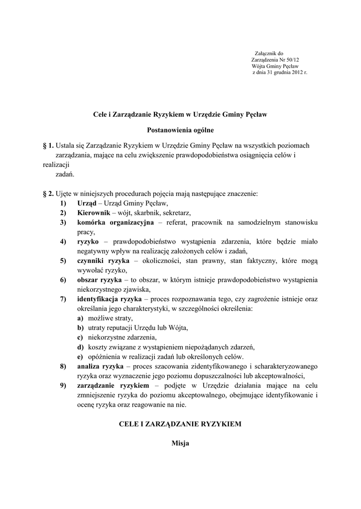 Załącznik do Zarządzenia Nr 50/12 Wójta Gminy Pęcław z dnia 31 grudnia 2012 r. Cele i Zarządzanie Ryzykiem w Urzędzie Gminy Pęcław Postanowienia ogólne § 1. Ustala się Zarządzanie Ryzykiem w Urzędzie Gminy Pęcław na wszystkich poziomach zarządzania, mające na celu zwiększenie prawdopodobieństwa osiągnięcia celów i realizacji zadań. § 2. Ujęte w niniejszych procedurach pojęcia mają następujące znaczenie: 1) Urząd – Urząd Gminy Pęcław, 2) Kierownik – wójt, skarbnik, sekretarz, 3) komórka organizacyjna – referat, pracownik na samodzielnym stanowisku pracy, 4) ryzyko – prawdopodobieństwo wystąpienia zdarzenia, które będzie miało negatywny wpływ na realizację założonych celów i zadań, 5) czynniki ryzyka – okoliczności, stan prawny, stan faktyczny, które mogą wywołać ryzyko, 6) obszar ryzyka – to obszar, w którym istnieje prawdopodobieństwo wystąpienia niekorzystnego zjawiska, 7) identyfikacja ryzyka – proces rozpoznawania tego, czy zagrożenie istnieje oraz określania jego charakterystyki, w szczególności określenia: a) możliwe straty, b) utraty reputacji Urzędu lub Wójta, c) niekorzystne zdarzenia, d) koszty związane z wystąpieniem niepożądanych zdarzeń, e) opóźnienia w realizacji zadań lub określonych celów. 8) analiza ryzyka – proces szacowania zidentyfikowanego i scharakteryzowanego ryzyka oraz wyznaczenie jego poziomu dopuszczalności lub akceptowalności, 9) zarządzanie ryzykiem – podjęte w Urzędzie działania mające na celu zmniejszenie ryzyka do poziomu akceptowalnego, obejmujące identyfikowanie i ocenę ryzyka oraz reagowanie na nie. CELE I ZARZĄDZANIE RYZYKIEM Misja § 3. Misją Urzędu Gminy Pęcław jest realizacja celów i zadań wynikających z ustawy z dnia 8 marca 1990 r. o samorządzie gminnym (Dz. U. z 2001 r. Nr 142, poz. 1591 z późn. zm.) oraz ustaw szczególnych, polegających na zaspokajaniu zbiorowych potrzeb wspólnoty. Określanie celów i zadań, monitorowanie i ocena ich realizacji § 4. 1. Cele i zadania dla poszczególnych stanowisk pracy określać należy jasno, i w co najmniej rocznej perspektywie w Planie Działalności Jednostki, sporządzonym wg wzoru stanowiącego załącznik Nr 1 do Celów i Zarządzania Ryzykiem. 2. Plan uwzględnia zadania Referatu Finansowego oraz samodzielnych stanowisk pracy i powstaje na podstawie planów cząstkowych sporządzanych przez kierownika Referatu Finansowego i pracowników na samodzielnych stanowiskach pracy we współpracy z Sekretarzem Gminy. 3. Ostateczne opracowanie planu powinno nastąpić najpóźniej do końca lutego, każdego roku. 4. Kierownicy jednostek organizacyjnych sporządzają plan działalności na rok następny i przedkładają go Sekretarzowi Gminy najpóźniej do końca lutego, każdego roku. 5. Plan zawiera w szczególności określenie celów w ramach poszczególnych zadań budżetowych oraz mierniki określające stopień realizacji celu, ich planowane wartości, najważniejsze czynności służące osiągnięciu celu i osoby odpowiedzialne za realizację. 6. Plan Urzędu Gminy i pozostałych jednostek organizacyjnych, Sekretarz przedstawia do zatwierdzenia Wójtowi. § 5. 1. Realizacja rocznego Planu Urzędu Gminy podlega monitorowaniu przez kierownika Referatu Finansowego i pracowników na samodzielnych stanowiskach pracy w zakresie zadań im przypisanych. Wyniki monitorowania są przedstawiane Sekretarzowi w formie informacji w okresach półrocznych. 2. Na podstawie tych informacji Sekretarz sporządza i przedkłada Wójtowi do zatwierdzenia w terminie do końca kwietnia każdego roku, sprawozdanie z wykonania Planu Działalności Urzędu. 3. Kierownicy pozostałych jednostek organizacyjnych sporządzają i przedkładają Wójtowi do zatwierdzenia w terminie do końca kwietnia każdego roku sprawozdanie, a po zatwierdzeniu przekazują Sekretarz. 4. Sprawozdanie sporządza się zgodnie ze wzorem określonym w załączniku Nr 2 do Celów i Zarządzania Ryzykiem. § 6. Wykonanie celów i zadań, monitoruje się uwzględniając kryterium oszczędności, efektywności i skuteczności. § 7.1. Zarządzanie ryzykiem stanowi narzędzie zarządzania dla kierowniczej kadry Urzędu oraz wytyczne dla wszystkich pracowników Urzędu. 2. Ograniczenie ryzyka osiągane jest poprzez zaprojektowanie i wdrożenie mechanizmów kontrolnych na podstawie analizy ryzyka i działań podjętych w ramach reakcji na ich wystąpienie. § 8. Celem zarządzania ryzykiem w Urzędzie jest: 1) usprawnienie procesu planowania, 2) zapewnienie kierownictwu Urzędu informacji o zagrożeniach dla realizacji wyznaczonych celów i zadań, 3) zwiększenie prawdopodobieństwa realizacji zadań i osiąganie założonych celów, 4) realizacja działań w ramach kontroli wewnętrznej. § 9. Zarządzanie ryzykiem odbywa się według zasad: 1) powiązania z celami i zadaniami Urzędu, 2) integracji z procesem zarządzania Urzędem, 3) przypisania odpowiedzialności, 4) zestawienia zadań przeciwdziałających ryzyku do jego istotności. § 10.1. Zarządzanie ryzykiem odbywa się na dwóch poziomach – strategicznym i operacyjnym. 2. Zarządzanie ryzykiem na poziomie strategicznym oparte jest na rocznej identyfikacji i analizie ryzyka w odniesieniu do zadań wskazanych w Planie Działalności. 3. Zarządzanie ryzykiem na poziomie operacyjnym stanowi stały element zarządzania; polega on na bieżącej identyfikacji, analizie ryzyka i podejmowaniu działań zaradczych poprzez odpowiedź na ryzyko. § 11. 1. Za zarządzanie ryzykiem na poziomie strategicznym odpowiada Wójt poprzez: 1) kształtowanie i wdrażanie procedury zarządzania ryzykiem, 2) zdefiniowanie działań priorytetowych, 3) identyfikację ryzyka i ocenę ryzyka na poziomie strategicznym, 4) określenie poziomów akceptowalnego ryzyka, 5) monitorowanie skuteczności mechanizmów kontrolnych, 2. W proces identyfikacji i oceny ryzyka na poziomie strategicznym włączani są Sekretarz