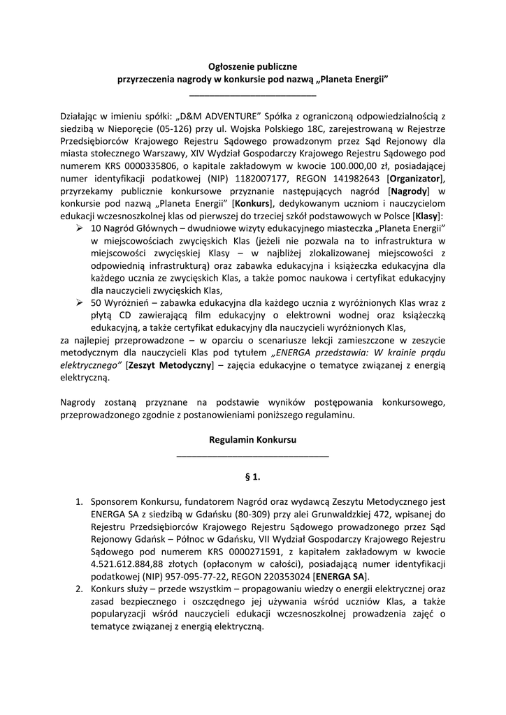 Ogłoszenie publiczne przyrzeczenia nagrody w konkursie pod nazwą „Planeta Energii” _________________________ Działając w imieniu spółki: „D&M ADVENTURE” Spółka z ograniczoną odpowiedzialnością z siedzibą w Nieporęcie (05-‐126) przy ul. Wojska Polskiego 18C, zarejestrowaną w Rejestrze Przedsiębiorców Krajowego Rejestru Sądowego prowadzonym przez Sąd Rejonowy dla miasta stołecznego Warszawy, XIV Wydział Gospodarczy Krajowego Rejestru Sądowego pod numerem KRS 0000335806, o kapitale zakładowym w kwocie 100.000,00 zł, posiadającej numer identyfikacji podatkowej (NIP) 1182007177, REGON 141982643 [Organizator], przyrzekamy publicznie konkursowe przyznanie następujących nagród [Nagrody] w konkursie pod nazwą „Planeta Energii” [Konkurs], dedykowanym uczniom i nauczycielom edukacji wczesnoszkolnej klas od pierwszej do trzeciej szkół podstawowych w Polsce [Klasy]: Ø 10 Nagród Głównych – dwudniowe wizyty edukacyjnego miasteczka „Planeta Energii” w miejscowościach zwycięskich Klas (jeżeli nie pozwala na to infrastruktura w miejscowości zwycięskiej Klasy – w najbliżej zlokalizowanej miejscowości z odpowiednią infrastrukturą) oraz zabawka edukacyjna i książeczka edukacyjna dla każdego ucznia ze zwycięskich Klas, a także pomoc naukowa i certyfikat edukacyjny dla nauczycieli zwycięskich Klas, Ø 50 Wyróżnień – zabawka edukacyjna dla każdego ucznia z wyróżnionych Klas wraz z płytą CD zawierającą film edukacyjny o elektrowni wodnej oraz książeczką edukacyjną, a także certyfikat edukacyjny dla nauczycieli wyróżnionych Klas, za najlepiej przeprowadzone – w oparciu o scenariusze lekcji zamieszczone w zeszycie metodycznym dla nauczycieli Klas pod tytułem „ENERGA przedstawia: W krainie prądu elektrycznego” [Zeszyt Metodyczny] – zajęcia edukacyjne o tematyce związanej z energią elektryczną. Nagrody zostaną przyznane na podstawie wyników postępowania konkursowego, przeprowadzonego zgodnie z postanowieniami poniższego regulaminu. Regulamin Konkursu ______________________________ § 1. 1. Sponsorem Konkursu, fundatorem Nagród oraz wydawcą Zeszytu Metodycznego jest ENERGA SA z siedzibą w Gdańsku (80-‐309) przy alei Grunwaldzkiej 472, wpisanej do Rejestru Przedsiębiorców Krajowego Rejestru Sądowego prowadzonego przez Sąd Rejonowy Gdańsk – Północ w Gdańsku, VII Wydział Gospodarczy Krajowego Rejestru Sądowego pod numerem KRS 0000271591, z kapitałem zakładowym w kwocie 4.521.612.884,88 złotych (opłaconym w całości), posiadającą numer identyfikacji podatkowej (NIP) 957-‐095-‐77-‐22, REGON 220353024 [ENERGA SA]. 2. Konkurs służy – przede wszystkim – propagowaniu wiedzy o energii elektrycznej oraz zasad bezpiecznego i oszczędnego jej używania wśród uczniów Klas, a także popularyzacji wśród nauczycieli edukacji wczesnoszkolnej prowadzenia zajęć o tematyce związanej z energią elektryczną. 1. 2. 3. 4. § 2. W Konkursie mogą wziąć udział Klasy: (1) ze szkoły: (a) która otrzymała od Organizatora – pocztą – Zeszyty Metodyczne, bądź (b) której Organizator – na jej żądanie -‐ przesłał pocztą Zeszyt Metodyczny lub udostępnił ten Zeszyt za pośrednictwem należącego do ENERGA SA internetowego serwisu komunikacji konkursowej pod adresem www.planetaenergii.pl [Internetowa Platforma Konkursu], (2) których nauczyciele: (a) w okresie od dnia 01 września 2014 roku do dnia 31 stycznia 2015 roku: (i) w formie pisemnej (pocztą), faxem lub za pośrednictwem Internetowej Platformy Konkursowej (zakładka – sekcja dla nauczycieli) zgłosili Klasę do udziału w Konkursie; za pośrednictwem Internetowej Platformy Konkursowej możliwe jest również stworzenie na tej Platformie wirtualnego profilu Klasy , (ii) zrealizowali z uczniami co najmniej trzy scenariusze lekcji na podstawie Zeszytu Metodycznego, (iii) wykazali szczególne zaangażowanie w propagowaniu wśród uczniów Klas wiedzy o energii elektrycznej oraz zasad bezpiecznego i oszczędnego jej używania, w szczególności poprzez [Działania Dodatkowe]: Ø konstruowanie prac domowych związanych z tą tematyką, Ø wykorzystywanie tej tematyki w ramach zajęć na godzinach wychowawczych, w świetlicach, na zajęciach fakultatywnych, kołach zainteresowań, podczas szkolnych uroczystości, etc., (b) w terminie do dnia 13 lutego 2015 roku prześlą – pocztą lub za pośrednictwem Internetowej Platformy Konkursowej – wypełnione formularze sprawozdań – których wzory zamieszczone są na Internetowej Platformie Konkursowej – z realizacji scenariuszy lekcji na podstawie Zeszytu Metodycznego oraz z przeprowadzonych Działań Dodatkowych [Sprawozdania] wraz z załączonymi do Sprawozdania materiałami dokumentującymi przeprowadzone scenariusze lekcji oraz Działania Dodatkowe (w szczególności dokumentację zdjęciową lub filmową, zrealizowane prace, itp.) [Materiały Sprawozdawcze], z tym zastrzeżeniem, że Organizator zastrzega sobie prawo dopuszczenia do udziału w Konkursie Klas, których Sprawozdania wpłyną po wyżej wymienionym terminie. Sprawozdania w formie pisemnej wraz z Materiałami Sprawozdawczymi należy przesłać na adres Organizatora: D&M Adventure Sp. z o.o., ul. Górskiego 4/27 , 00-‐ 033 Warszawa, z dopiskiem “Konkurs Planeta Energii”. Zgłoszenie powinno zawierać wskazanie nazwy Klasy, imienia i nazwiska nauczyciela prowadzącego zajęcia oraz ilości uczniów w Klasie. W realizacji scenariuszy lekcji na podstawie Zeszytu Metodycznego może brać udział więcej niż jeden nauczyciel (np. Klasy zintegrowane), przy czym ten sam nauczyciel może zgłosić do udziału w Konkursie tylko jedną Klasę. 5. Konkurs zostanie rozstrzygnięty w terminie do dnia 13 marca 2015 roku. § 3. 1. O wyniku Konkursu rozstrzyga – według własnego uznania – jury Konkursu na podstawie otrzymanych Sprawozdań, przeprowadzając: (1) w pierwszym etapie – ocenę formalną zgłoszeń k