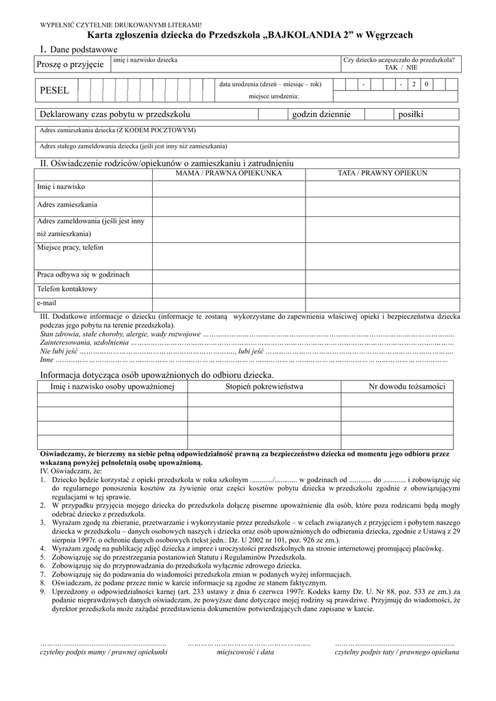 WYPEŁNIĆ CZYTELNIE DRUKOWANYMI LITERAMI! Karta zgłoszenia dziecka do Przedszkola „BAJKOLANDIA 2” w Węgrzcach I. Dane podstawowe Proszę o przyjęcie imię i nazwisko dziecka Czy dziecko uczęszczało do przedszkola? TAK / NIE data urodzenia (dzień – miesiąc – rok) PESEL - - 2 0 miejsce urodzenia: Deklarowany czas pobytu w przedszkolu godzin dziennie posiłki Adres zamieszkania dziecka (Z KODEM POCZTOWYM) Adres stałego zameldowania dziecka (jeśli jest inny niż zamieszkania) II. Oświadczenie rodziców/opiekunów o zamieszkaniu i zatrudnieniu MAMA / PRAWNA OPIEKUNKA TATA / PRAWNY OPIEKUN Imię i nazwisko Adres zamieszkania Adres zameldowania (jeśli jest inny niż zamieszkania) Miejsce pracy, telefon Praca odbywa się w godzinach Telefon kontaktowy e-mail III. Dodatkowe informacje o dziecku (informacje te zostaną wykorzystane do zapewnienia właściwej opieki i bezpieczeństwa dziecka podczas jego pobytu na terenie przedszkola). Stan zdrowia, stałe choroby, alergie, wady rozwojowe ……………………………………………………………………………….………………….. Zainteresowania, uzdolnienia ………………………………………………………………………………………………………………………..……… Nie lubi jeść ……………………………………………………………., lubi jeść …………………………………………………………………………. Inne …………………………………………………………………………………………………………………………………………………………… Informacja dotycząca osób upoważnionych do odbioru dziecka. Imię i nazwisko osoby upoważnionej Stopień pokrewieństwa Nr dowodu tożsamości Oświadczamy, że bierzemy na siebie pełną odpowiedzialność prawną za bezpieczeństwo dziecka od momentu jego odbioru przez wskazaną powyżej pełnoletnią osobę upoważnioną. IV. Oświadczam, że: 1. Dziecko będzie korzystać z opieki przedszkola w roku szkolnym ............/............ w godzinach od ............ do ............ i zobowiązuję się do regularnego ponoszenia kosztów za żywienie oraz części kosztów pobytu dziecka w przedszkolu zgodnie z obowiązującymi regulacjami w tej sprawie. 2. W przypadku przyjęcia mojego dziecka do przedszkola dołączę pisemne upoważnienie dla osób, które poza rodzicami będą mogły odebrać dziecko z przedszkola. 3. Wyrażam zgodę na zbieranie, przetwarzanie i wykorzystanie przez przedszkole – w celach związanych z przyjęciem i pobytem naszego dziecka w przedszkolu – danych osobowych naszych i dziecka oraz osób upoważnionych do odbierania dziecka, zgodnie z Ustawą z 29 sierpnia 1997r. o ochronie danych osobowych (tekst jedn.: Dz. U 2002 nr 101, poz. 926 ze zm.). 4. Wyrażam zgodę na publikację zdjęć dziecka z imprez i uroczystości przedszkolnych na stronie internetowej promującej placówkę. 5. Zobowiązuję się do przestrzegania postanowień Statutu i Regulaminów Przedszkola. 6. Zobowiązuję się do przyprowadzania do przedszkola wyłącznie zdrowego dziecka. 7. Zobowiązuję się do podawania do wiadomości przedszkola zmian w podanych wyżej informacjach. 8. Oświadczam, że podane przeze mnie w karcie informacje są zgodne ze stanem faktycznym. 9. Uprzedzony o odpowiedzialności karnej (art. 233 ustawy z dnia 6 czerwca 1997r. Kodeks karny Dz. U. Nr 88, poz. 533 ze zm.) za podanie nieprawdziwych danych oświadczam, że powyższe dane dotyczące mojej rodziny są prawdziwe. Przyjmuję do wiadomości, że dyrektor przedszkola może zażądać przedstawienia dokumentów potwierdzających dane zapisane w karcie. ………......................................................... czytelny podpis mamy / prawnej opiekunki ……………………………………………….. miejscowość i data ………….................................................. czytelny podpis taty / prawnego opiekuna