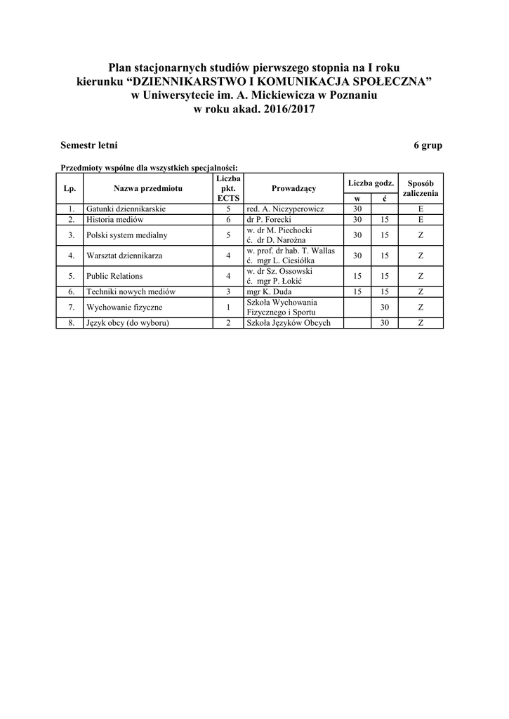Plan stacjonarnych studiów pierwszego stopnia na I roku kierunku “DZIENNIKARSTWO I KOMUNIKACJA SPOŁECZNA” w Uniwersytecie im. A. Mickiewicza w Poznaniu w roku akad. 2016/2017 Semestr letni Przedmioty wspólne dla wszystkich specjalności: Liczba Lp. Nazwa przedmiotu pkt. Prowadzący ECTS 1. Gatunki dziennikarskie 5 red. A. Niczyperowicz 2. Historia mediów 6 dr P. Forecki w. dr M. Piechocki 3. Polski system medialny 5 ć. dr D. Narożna w. prof. dr hab. T. Wallas 4. Warsztat dziennikarza 4 ć. mgr L. Ciesiółka w. dr Sz. Ossowski 5. Public Relations 4 ć. mgr P. Łokić 6. Techniki nowych mediów 3 mgr K. Duda Szkoła Wychowania 7. Wychowanie fizyczne 1 Fizycznego i Sportu 8. Język obcy (do wyboru) 2 Szkoła Języków Obcych 6 grup Liczba godz. ć Sposób zaliczenia w 30 30 15 E E 30 15 Z 30 15 Z 15 15 Z 15 15 Z 30 Z 30 Z Plan stacjonarnych studiów pierwszego stopnia na II roku kierunku “DZIENNIKARSTWO I KOMUNIKACJA SPOŁECZNA” w Uniwersytecie im. A. Mickiewicza w Poznaniu w roku akad. 2016/2017 Semestr letni 4 grupy Przedmioty wspólne dla wszystkich specjalności: Liczba Lp. Nazwa przedmiotu pkt. Prowadzący ECTS 1. Język obcy (do wyboru) 2 Szkoła Języków Obcych w. prof. dr hab. A. 2. System polityczny RP 4 Stelmach ć. mgr J. Kałużna w. dr A. Szymaniak 3. Business skills 3 ć. dr M. Kacperska 4. Prawo mediów 4 prof. dr hab. J. Sobczak 5. Socjologia ogólna 1 prof. dr hab. A. Sakson w. dr P. Stachowiak 6. Historia Polski XX w. 3 ć. dr hab. E. Lesiewicz 7. Dziennikarskie źródła informacji 2 dr hab. W. Adamczyk Specjalność: reklama i promocja 8. Psychologia reklamy 9. Badania marketingowe 10. Tekst reklamowy 11. Reklama telewizyjna i radiowa 12. Fotografia reklamowa 3 3 2 2 1 Liczba godz. w ć 30 15 E 15 15 Z 30 30 30 E Z 15 30 dr B. Pająk-Patkowska dr K. Borowczyk dr B. Hordecki dr M. Chojnacki dr P. Lissewski E Z 30 30 15 15 15 1 grupa Z E Z Z Z 4 grupy 8. Pracownia prasowa 3 9. Pracownia radiowa 4 Pracownia telewizyjna 4 Specjalność: marketing online 8. Prawo internetowe 9. Techniki prezentacji 10. Warsztat Google 11. Copywriting 12. Strategia marki E 30 Specjalność: dziennikarstwo 10. Sposób zaliczenia 3 2 2 2 2 mgr K. Czajka (1 gr.) mgr A. Przybylska (1 gr.) mgr P. Talaga (2 gr.) mgr M. Rybczyńska dr D. Narożna (2 gr.) red, L. Bretes-Dorożała (2 gr.) prof. dr hab. J. Skrzypczak mgr A. Szymczak mgr A. Stępień mgr M. Dobosiewicz mgr J. Kwaczyński 15 30 Z 30 Z 30 Z 15 15 30 15 15 1 grupa E Z Z Z Z Plan stacjonarnych studiów pierwszego stopnia na III roku kierunku “DZIENNIKARSTWO I KOMUNIKACJA SPOŁECZNA” w Uniwersytecie im. A. Mickiewicza w Poznaniu w roku akad. 2016/2017 Semestr letni 4 grupy Przedmioty wspólne dla wszystkich specjalności: Liczba Lp. Nazwa przedmiotu pkt. Prowadzący ECTS 1. Etyka dziennikarska 3 prof. dr hab. W. Cisak Zajęcia do wyboru 6 2. Wg zał. wykazu (3 x 30 godz. x 2 pkt. ECTS) 3x2 3. Seminarium dyplomowe 9 4. Praktyka zawodowa 2 prof. dr hab. A. Stępińska Specjalność: reklama i promocja 5. Prawo reklamy 6. Wizualizacja Komunikacja marketingowa 7. poprzez social media i blogi (Web 2.0) 8. Kampanie reklamowe w 30 ć Liczba godz. Z 90 Z 30 2 tyg. Z Z dr M. Zelek prof. dr hab. K. Molenda 2 dr J. Jakubowski 30 Z 2 30 E 15 Z 15 Z 9. Negocjacje 2 10. Trening interpersonalny 1 3 3 3 1 mgr A. Filipiak dr M. Piechocki mgr R. Koziński mgr M. Wallas 30 2 grupy Z Z 2 1 dr A. Kaniewska-Sęba w. prof. dr hab. R. Fiedler ć. mgr A. Pohl mgr M. Wallas Specjalność: dziennikarstwo 5. Film dokumentalny 6. Marketing i reklama 7. Dziennikarstwo internetowe 8. Trening interpersonalny Liczba godz. 15 15 30 30 30 15 Specjalność: marketing online 3 grupy Z E Z Z 1 grupa 5. Psychologia Internetu 4 6. 7. 8. E-commerce Techniki prezentacji E-mail marketing 2 2 2 w. dr B. Pająk-Patkowska ć. dr J. Jakubowski mgr J. Gorlak mgr A. Szymczak 15 15 E 30 15 15 Z Z Z