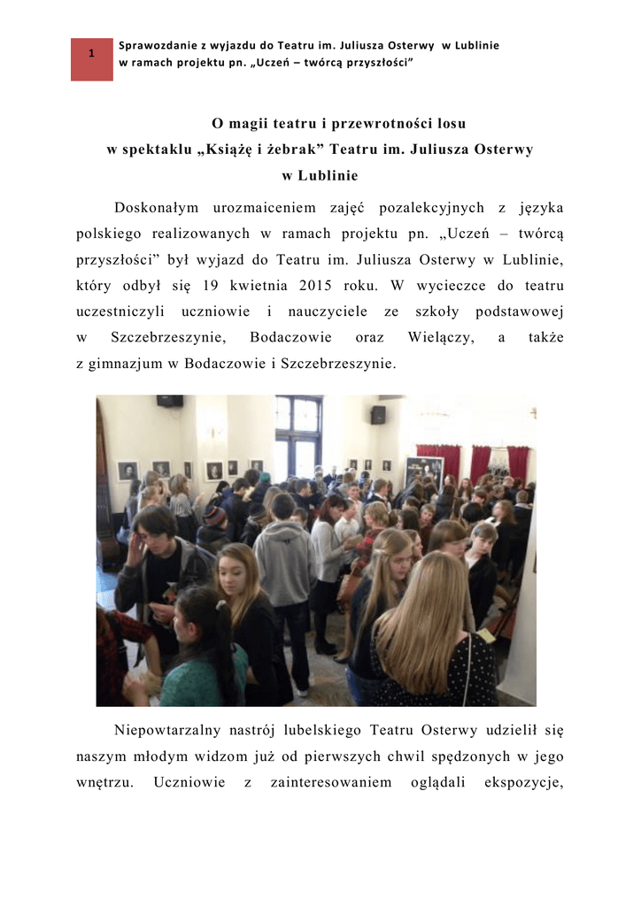 1 Sprawozdanie z wyjazdu do Teatru im. Juliusza Osterwy w Lublinie w ramach projektu pn. „Uczeń – twórcą przyszłości” O magii teatru i przewrotności losu w spektaklu „Książę i żebrak” Teatru im. Juliusza Osterwy w Lublinie Doskonałym urozmaiceniem zajęć pozalekcyjnych z języka polskiego realizowanych w ramach projektu pn. „Uczeń – twórcą przyszłości” był wyjazd do Teatru im. Juliusza Osterwy w Lublinie, który odbył się 19 kwietnia 2015 roku. W wycieczce do teatru uczestniczyli w uczniowie Szczebrzeszynie, i nauczyciele Bodaczowie ze oraz szkoły Wielączy, podstawowej a także z gimnazjum w Bodaczowie i Szczebrzeszynie. Niepowtarzalny nastrój lubelskiego Teatru Osterwy udzielił się naszym młodym widzom już od pierwszych chwil spędzonych w jego wnętrzu. Uczniowie z zainteresowaniem oglądali ekspozycje, 2 Sprawozdanie z wyjazdu do Teatru im. Juliusza Osterwy w Lublinie w ramach projektu pn. „Uczeń – twórcą przyszłości” fotografie i afisze, a wśród dziewcząt znalazły się nawet amatorki kostiumów teatralnych. 3 Sprawozdanie z wyjazdu do Teatru im. Juliusza Osterwy w Lublinie w ramach projektu pn. „Uczeń – twórcą przyszłości” Dodać trzeba, że ekspozycja była jedynie przedsmakiem tego, co czekało uczniów na widowni. Zainteresowanie przedstawieniem było wielkie, bowiem młodzi widzowie zaproszeni zostali na jeden z najlepszych spektakli Teatru Osterwy. Mowa o sztuce „Książę i żebrak”, czyli doskonałej adaptacji powieści Marka Twaina w reżyserii Pawła Aignera. 4 Sprawozdanie z wyjazdu do Teatru im. Juliusza Osterwy w Lublinie w ramach projektu pn. „Uczeń – twórcą przyszłości” Ten widowiskowy spektakl zawierał kwintesencję tego, co najlepsze w przedstawieniach teatralnych – dynamiczną akcję, piękne kostiumy oraz wspaniałą grę aktorską. zarówno zabawne, jak Zachwyceni i widzowie z zapartym tchem śledzili przejmujące epizody tego Fot. Galeria fotografii Teatru im. J. Osterwy w Lublinie przedstawienia. 5 Sprawozdanie z wyjazdu do Teatru im. Juliusza Osterwy w Lublinie w ramach projektu pn. „Uczeń – twórcą przyszłości” Historia żebraka - Tomka Cantego i księcia - Edwarda Toudora od wieków uczy czytelników, że los bywa przewrotny, a lekkomyślnie podjęte decyzje mogą być tragiczne w skutkach. Uniwersalne motywy ukazane w tym przedstawieniu na pewno zainspirują literacko niejednego ucznia, a kontakt z teatrem będzie bodźcem do pogłębiania wiedzy o kulturze i sztuce. Wizytę w Teatrze Osterwy zaliczyć należy do owocnych. Z pewnością organizatorom udało się osiągnąć zamierzone cele – uczniowie doskonalili umiejętność odbioru sztuki teatralnej, a także mieli możliwość kształtowania zasad savoir-vivre'u. Podkreślić trzeba, że niezwykle symboliczny był również termin tego wyjazdu, bowiem rok 2015 ogłoszony został Rokiem Polskiego Teatru Publicznego. Miejmy nadzieję, że dla wielu uczniów wyjazd ten będzie początkiem ich przygody z teatrem. 6 Sprawozdanie z wyjazdu do Teatru im. Juliusza Osterwy w Lublinie w ramach projektu pn. „Uczeń – twórcą przyszłości” Projekt pn. „Uczeń – twórcą przyszłości” jest współfinansowany ze środków Unii Europejskiej w ramach Europejskiego Funduszu Społecznego; Program Operacyjny Kapitał Ludzki; Priorytet IX - „Rozwój wykształcenia i kompetencji w regionach”; działanie 9.1 „Wyrównywanie szans edukacyjnych i zapewnienie wysokiej jakości usług edukacyjnych świadczonych w systemie oświaty”; poddziałanie 9.1.2 „Wyrównywanie szans edukacyjnych uczniów z grup o utrudnionym dostępie do edukacji oraz zmniejszanie różnic w jakości usług edukacyjnych”. Tekst: Aneta Bartoszczyk – Trochimiuk Zdjęcia: Elżbieta Złomańczuk Gimnazjum im. Polskich Olimpijczyków w Szczebrzeszynie
