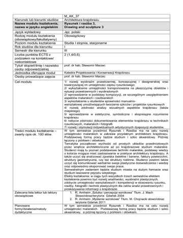 Kierunek lub kierunki studiów Nazwa modułu kształcenia, nazwa w języku angielskim M_AK_37 Architektura krajobrazu Rysunek i rzeźba 3, Drawing and sculpture 3 Język wykładowy Rodzaj modułu kształcenia (obowiązkowy/fakultatywny) Poziom modułu kształcenia Rok studiów dla kierunku Semestr dla kierunku Liczba punktów ECTS z podziałem na kontaktowe/ niekontaktowe Tytuł/ stopień/Imię i nazwisko osoby odpowiedzialnej Jednostka oferująca moduł Osoby prowadzące zajęcia Jęz. polski Obowiązkowy Cel modułu 1/ rozwój wyobraźni przestrzennej, koncepcyjnej i designerskiej oraz towarzyszącej im umiejętności zapisu rysunkowego; 2/ wykształcenie umiejętności transponowania na płaszczyznę obiektów i sytuacji przestrzennych i wyobrażonych 2/ wprowadzenie w podstawy kompozycji, ze szczególnym uwzględnieniem aspektów malarskich i rzeźbiarskich 3/ wykształcenie u studentów sprawności manualnowarsztatowej umożliwiających tworzenie szkiców i projektów rysunkowych 4/ rozwój zdolności analizy wizualnych aspektów krajobrazu (także miejskiego) 5/ wprowadzenie w estetyczne, symboliczne i ekspresyjne rozumienie krajobrazu 6/ nabycie zdolności dokumentowania elementów krajobrazu w technikach rysunkowych, malarskich i fotografii 7/ rozwój i stymulacji indywidualnych artystycznych dyspozycji studentów. W tym semestrze przedmiot Rysunek i Rzeźba ma na celu rozwój umiejętności malarskich w zakresie przydatnym architektom krajobrazu. Podstawową formą pracy będzie studium i szkic akwarelowy. Później łączony z piórkiem i ołówkiem. Tematyka początkowo wychodzi od prostych układów przedmiotowych przez wnętrza architektoniczne aż po krajobrazowe studium malarskie. Studenci mają tu poznać podstawowe techniki malarskie, podstawy wiedzy o kolorze mogące mieć zastosowanie w praktyce architektury krajobrazu. A także uczyć się analizować zjawiska świetlne i barwne, faktury powierzchni, struktury geometryczne, czy też struktury roślinne. Studenci powinni także uczyć się komunikować werbalnie swoje plastyczne doświadczenia i wiedzę oraz odpowiednio eksponować swoje prace. Semestralnym zadaniem będzie studium miasta na dużym formacie oraz studium lawowane pejzażu wiejskiego. Efekty kształcenia: w ciągu tych wszystkich trzech semestrów efektem kształcenia powinno być rozwój wrażliwości, wyobraźni plastycznych, zdobycie umiejętności warsztatowych i kompetencji w stosowaniu rysunku, rzeźby, fotografii i technik plastycznych dla celów analiz przestrzennych i przekazywania informacji o krajobrazie. 1. R. Arnheim „Sztuka i percepcja wzrokowa” Tłum. J. Mach Słowo/obraz/terytoria Gdańsk 2004 2. R. Arnheim „Myślenie wzrokowe” Tłum. M. Chojnacki słowo/obraz terytoria Gdańsk 2011 W tym semestrze przedmiot Rysunek i Rzeźba ma na celu rozwój umiejętności malarskich. Podstawową formą pracy będzie studium i szkic akwarelowy, a później łączony z piórkiem i ołówkiem. Treści modułu kształcenia – zwarty opis ok. 100 słów. Zalecana lista lektur lub lektury obowiązkowe Planowane formy/działania/metody dydaktyczne Studia I stopnia, stacjonarne I III 2 (1,4/0,6) prof. dr hab. Sławomir Marzec Katedra Projektowania i Konserwacji Krajobrazu prof. dr hab. Sławomir Marzec