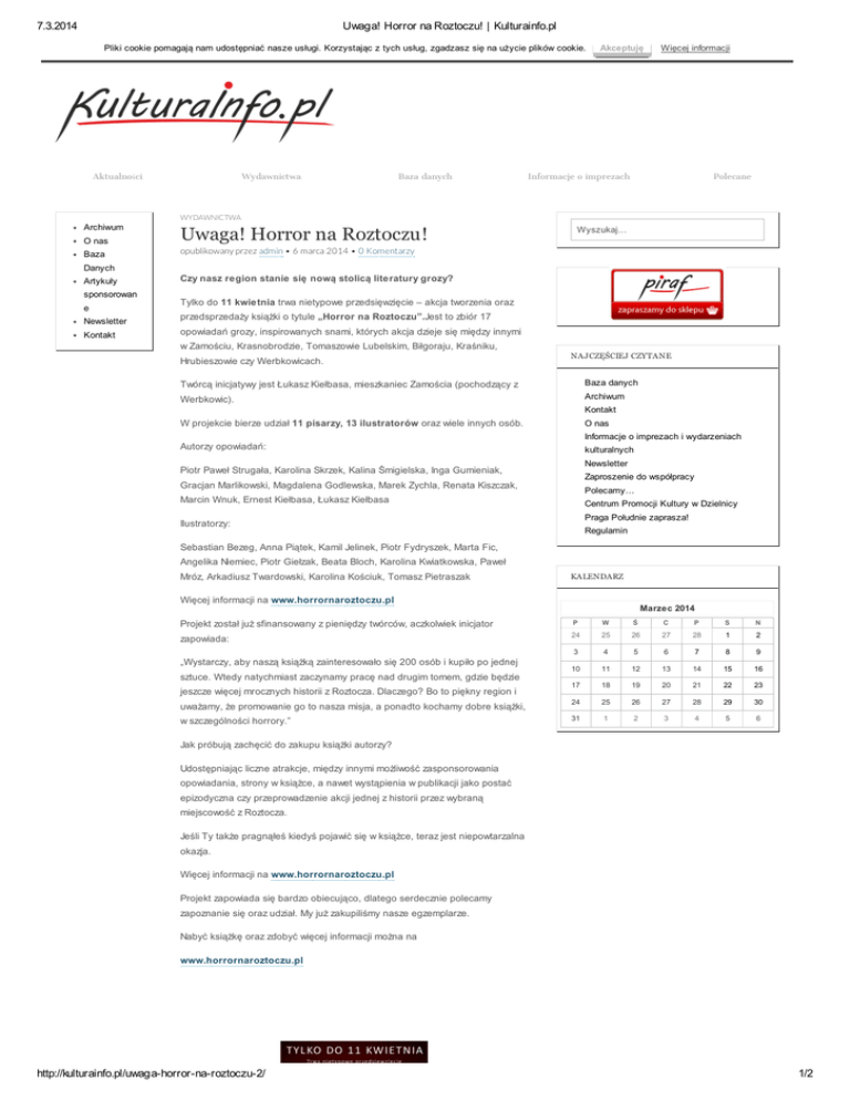 7.3.2014 Uwaga! Horror na Roztoczu! | Kulturainfo.pl Pliki cookie pomagają nam udostępniać nasze usługi. Korzystając z tych usług, zgadzasz się na użycie plików cookie. Aktualności Wydawnictwa Baza danych Akceptuję Więcej informacji Informacje o imprezach Polecane WYDAWNICTWA Archiwum O nas Uwaga! Horror na Roztoczu! Baza opublikowany przez admin • 6 marca 2014 • 0 Komentarzy Wyszukaj… Danych Artykuły sponsorowan e Newsletter Kontakt Czy nasz region stanie się nową stolicą literatury grozy? Tylko do 11 kwietnia trwa nietypowe przedsięwzięcie – akcja tworzenia oraz przedsprzedaży książki o tytule „Horror na Roztoczu”.Jest to zbiór 17 opowiadań grozy, inspirowanych snami, których akcja dzieje się między innymi w Zamościu, Krasnobrodzie, Tomaszowie Lubelskim, Biłgoraju, Kraśniku, Hrubieszowie czy Werbkowicach. NAJCZĘŚCIEJ CZYTANE Twórcą inicjatywy jest Łukasz Kiełbasa, mieszkaniec Zamościa (pochodzący z Baza danych Werbkowic). Archiwum Kontakt W projekcie bierze udział 11 pisarzy, 13 ilustratorów oraz wiele innych osób. O nas Informacje o imprezach i wydarzeniach Autorzy opowiadań: kulturalnych Newsletter Piotr Paweł Strugała, Karolina Skrzek, Kalina Śmigielska, Inga Gumieniak, Zaproszenie do współpracy Gracjan Marlikowski, Magdalena Godlewska, Marek Zychla, Renata Kiszczak, Polecamy… Marcin Wnuk, Ernest Kiełbasa, Łukasz Kiełbasa Centrum Promocji Kultury w Dzielnicy Praga Południe zaprasza! Ilustratorzy: Regulamin Sebastian Bezeg, Anna Piątek, Kamil Jelinek, Piotr Fydryszek, Marta Fic, Angelika Niemiec, Piotr Giełzak, Beata Bloch, Karolina Kwiatkowska, Paweł Mróz, Arkadiusz Twardowski, Karolina Kościuk, Tomasz Pietraszak KALENDARZ Więcej informacji na www.horrornaroztoczu.pl Marzec 2014 Projekt został już sfinansowany z pieniędzy twórców, aczkolwiek inicjator P W Ś C P S N zapowiada: 24 25 26 27 28 1 2 3 4 5 6 7 8 9 10 11 12 13 14 15 16 17 18 19 20 21 22 23 uważamy, że promowanie go to nasza misja, a ponadto kochamy dobre książki, 24 25 26 27 28 29 30 w szczególności horrory.” 31 1 2 3 4 5 6 „Wystarczy, aby naszą książką zainteresowało się 200 osób i kupiło po jednej sztuce. Wtedy natychmiast zaczynamy pracę nad drugim tomem, gdzie będzie jeszcze więcej mrocznych historii z Roztocza. Dlaczego? Bo to piękny region i Jak próbują zachęcić do zakupu książki autorzy? Udostępniając liczne atrakcje, między innymi możliwość zasponsorowania opowiadania, strony w książce, a nawet wystąpienia w publikacji jako postać epizodyczna czy przeprowadzenie akcji jednej z historii przez wybraną miejscowość z Roztocza. Jeśli Ty także pragnąłeś kiedyś pojawić się w książce, teraz jest niepowtarzalna okazja. Więcej informacji na www.horrornaroztoczu.pl Projekt zapowiada się bardzo obiecująco, dlatego serdecznie polecamy zapoznanie się oraz udział. My już zakupiliśmy nasze egzemplarze. Nabyć książkę oraz zdobyć więcej informacji można na www.horrornaroztoczu.pl http://kulturainfo.pl/uwaga-horror-na-roztoczu-2/ 1/2 7.3.2014 Uwaga! Horror na Roztoczu! | Kulturainfo.pl ← Uwaga! Horror na Roztoczu! A RCHIW A Uwaga muzycy legnickich zespołów z lat 80. i 90.! → Archiwum Regulamin Marzec 2014 Polityka bezpieczeństwa Luty 2014 Styczeń 2014 PA NEL UŻY T KOW NIKA Grudzień 2013 Listopad 2013 Zaloguj się Październik 2013 Kanał RSS z wpisami Wrzesień 2013 Kanał RSS z komentarzami Sierpień 2013 WordPress.org Lipiec 2013 Copyright © 2014 Kulturainfo.pl. Wszelkie prawa zastrzeżone. http://kulturainfo.pl/uwaga-horror-na-roztoczu-2/ Projekt i wykonianie Studio Kozłowski. 2/2