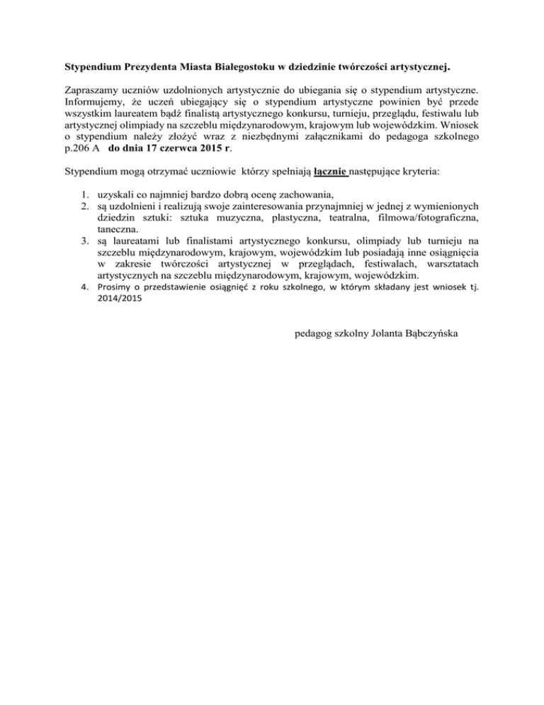 Stypendium Prezydenta Miasta Białegostoku w dziedzinie twórczości artystycznej. Zapraszamy uczniów uzdolnionych artystycznie do ubiegania się o stypendium artystyczne. Informujemy, że uczeń ubiegający się o stypendium artystyczne powinien być przede wszystkim laureatem bądź finalistą artystycznego konkursu, turnieju, przeglądu, festiwalu lub artystycznej olimpiady na szczeblu międzynarodowym, krajowym lub wojewódzkim. Wniosek o stypendium należy złożyć wraz z niezbędnymi załącznikami do pedagoga szkolnego p.206 A do dnia 17 czerwca 2015 r. Stypendium mogą otrzymać uczniowie którzy spełniają łącznie następujące kryteria: 1. uzyskali co najmniej bardzo dobrą ocenę zachowania, 2. są uzdolnieni i realizują swoje zainteresowania przynajmniej w jednej z wymienionych dziedzin sztuki: sztuka muzyczna, plastyczna, teatralna, filmowa/fotograficzna, taneczna. 3. są laureatami lub finalistami artystycznego konkursu, olimpiady lub turnieju na szczeblu międzynarodowym, krajowym, wojewódzkim lub posiadają inne osiągnięcia w zakresie twórczości artystycznej w przeglądach, festiwalach, warsztatach artystycznych na szczeblu międzynarodowym, krajowym, wojewódzkim. 4. Prosimy o przedstawienie osiągnięć z roku szkolnego, w którym składany jest wniosek tj. 2014/2015 pedagog szkolny Jolanta Bąbczyńska