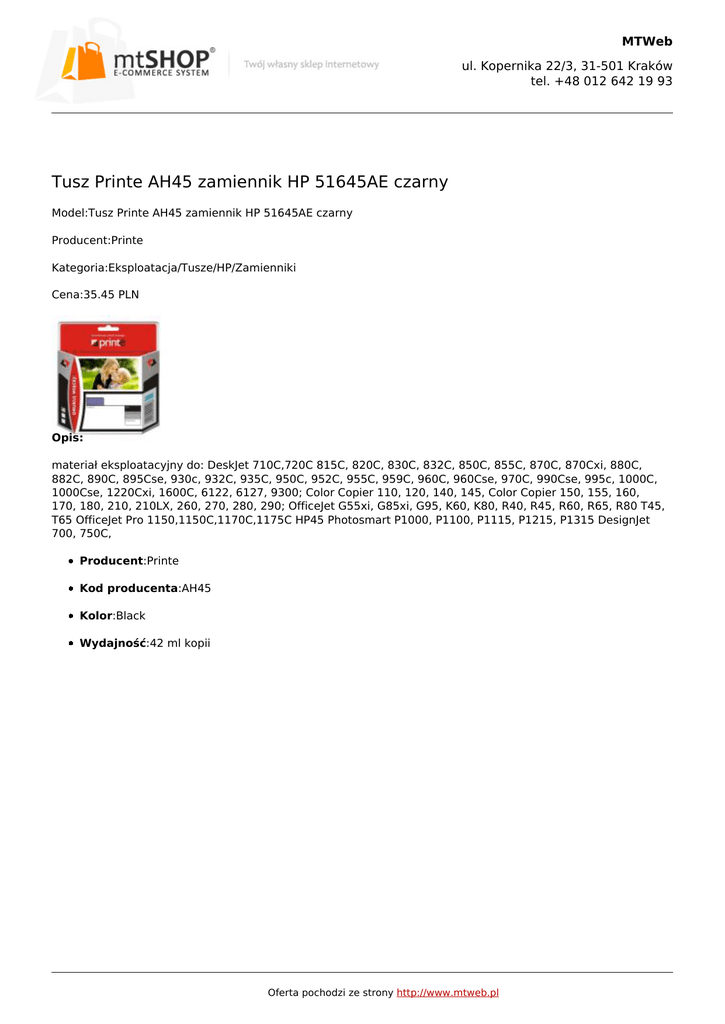 MTWeb ul. Kopernika 22/3, 31-501 Kraków tel. +48 012 642 19 93 Tusz Printe AH45 zamiennik HP 51645AE czarny Model:Tusz Printe AH45 zamiennik HP 51645AE czarny Producent:Printe Kategoria:Eksploatacja/Tusze/HP/Zamienniki Cena:35.45 PLN Opis: materiał eksploatacyjny do: DeskJet 710C,720C 815C, 820C, 830C, 832C, 850C, 855C, 870C, 870Cxi, 880C, 882C, 890C, 895Cse, 930c, 932C, 935C, 950C, 952C, 955C, 959C, 960C, 960Cse, 970C, 990Cse, 995c, 1000C, 1000Cse, 1220Cxi, 1600C, 6122, 6127, 9300; Color Copier 110, 120, 140, 145, Color Copier 150, 155, 160, 170, 180, 210, 210LX, 260, 270, 280, 290; OfficeJet G55xi, G85xi, G95, K60, K80, R40, R45, R60, R65, R80 T45, T65 OfficeJet Pro 1150,1150C,1170C,1175C HP45 Photosmart P1000, P1100, P1115, P1215, P1315 DesignJet 700, 750C, Producent:Printe Kod producenta:AH45 Kolor:Black Wydajność:42 ml kopii Oferta pochodzi ze strony http://www.mtweb.pl