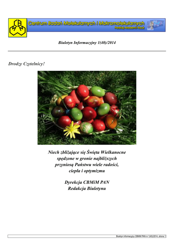 Biuletyn Informacyjny 1(40)/2014 Drodzy Czytelnicy! Niech zbliżające się Święta Wielkanocne spędzone w gronie najbliższych przyniosą Państwu wiele radości, ciepła i optymizmu Dyrekcja CBMiM PAN Redakcja Biuletynu Biuletyn Informacyjny CBMiM PAN nr 1(40)/2014, strona 1 Biuletyn 1 - Posiedzenie Rady Naukowej - Sesja sprawozdawcza 2013 - Nominacja profesorska - Sukces dr M. Kwiatkowskiej - Łódzkie Porozumienie Doktorantów - Zebranie NSZZ „Solidarność” - Obrony prac doktorskich 28 lutego 2014 roku odbyło się 117. posiedzenie Rady Naukowej Centrum Na początku posiedzenia Dyrektor CBMiM, prof. Stanisław Słomkowski, poinformował zebranych o powołaniu nowych członków Rady Naukowej: prof. Grzegorza Bartosza, członka korespondenta PAN z Wydziału Biologii i Ochrony Środowiska Uniwersytetu Łódzkiego oraz przedstawiciela doktorantów Centrum – mgr Ewy Skorupskiej, przewodniczącej Samorządu Doktorantów. Następnie prof. Marek Potrzebowski przedstawił sprawozdanie z działalności naukowo-badawczej Centrum w roku 2013 i plany na rok 2014. Po odbytej dyskusji Rada Naukowa pozytywnie oceniła uzyskane wyniki naukowe pracowników Centrum oraz potwierdziła wysoki poziom i liczbę publikacji w minionym roku. Profesor Stanisław Słomkowski po omówieniu sytuacji finansowej Centrum, przeszedł do prezentacji planów finansowych na bieżący rok. Sprawę oceny pracowników naukowych CBMiM przedstawił prof. Przemysław Kubisa. Protokół oceny działalności naukowej profesorów i specjalistów za lata 2007-2012 został przyjęty przez Radę, a działalność ich oceniona jako dobra. Sprawozdanie Komisji ds. postępowania habilitacyjnego dr. Grzegorza Salamończyka przedstawił prof. M. Potrzebowski. Rada Naukowa po zapoznaniu się z opinią Komisji, opartą na przedstawionych recenzjach, jednogłośnie zaakceptowała wniosek o nadanie dr. Grzegorzowi Salamończykowi stopnia doktora habilitowanego. Natomiast prof. Piotr Kiełbasiński przedstawił sprawozdanie Komisji ds. postępowania habilitacyjnego dr. Wojciecha Dąbkowskiego. W tajnym głosowaniu Rada Naukowa CBMiM poparła większością głosów wniosek o nadanie dr. Wojciechowi Dąbkowskiemu stopnia doktora habilitowanego. Sprawę wniosku Centralnej Komisji do Spraw Stopni i Tytułów o przeprowadzenie postępowania habilitacyjnego dr. Arkadiusza Chworosia przedstawił prof. S. Słomkowski. Rada CBMiM jednomyślnie zgodziła się na przeprowadzenie postępowania habilitacyjnego oraz wyznaczyła trzech członków Komisji: prof. Marka Potrzebowskiego (sekretarz), prof. dr. Ryszarda W. Adamiaka (recenzent), prof. Piotra Kiełbasińskiego (członek Komisji). Rada pozytywnie zaopiniowania wnioski o przyznanie stypendium Ministra dla wybitnych młodych naukowców: dr. Artura Różańskiego i mgr. Piotra Palucha. Kolejnym punktem obrad była dyskusja na temat nowego regulaminu i programu Studium Doktoranckiego CBMiM. Przedstawione przez prof. W. Stańczyka powyższe dokumenty zostały przyjęte przez Radę Naukową w głosowaniu jawnym. Prof. W. Stańczyk przedstawił również sprawy przewodów doktorskich. Jako pierwsze zostały zaprezentowane wnioski dotyczące nadania stopni doktora nauk chemicznych: mgr Katarzynie Sylwii Kulik, mgr. inż. Piotrowi Pospiechowi i mgr Ewelinie Wielgus. Zasadność wniosków członkowie Rady Naukowej zaakceptowali jednogłośnie. Następnie Rada Naukowa wszczęła przewody doktorskie: - mgr inż. Małgorzacie Wojtczak temat pracy doktorskiej: „The influence of chemical composition and nucleation on aliphatic-aromatic copolyesters” promotor: prof. dr hab. Andrzej Gałęski, - mgr. inż. Piotrowi Paluchowi temat pracy doktorskiej: „Badania strukturalne wybranych układów heteromakrocyklicznych z wykorzystaniem spektroskopii magnetycznego rezonansu jądrowego” promotor: prof. dr hab. Marek Potrzebowski, - mgr Ewie Skorupskiej temat pracy doktorskiej: „Zastosowania spektroskopii magnetycznego rezonansu jądrowego w badaniach enkapsulacji leków w mezoporowatych nanokrzemionkach” promotor: prof. dr hab. Marek Potrzebowski. Biuletyn Informacyjny CBMiM PAN nr 1(40)/2014, strona 2 Ostatnią sprawą poruszoną na posiedzeniu RN było zamknięcie przewodu doktorskiego mgr. inż. Marcina Zaród. Obrady zakończyła uroczysta chwila - Przewodniczący Rady i Dyrektor Centrum wręczyli dyplom habilitacyjny Marii Zabłockiej oraz dyplomy doktorskie: Katarzynie Sylwii Kulik, Piotrowi Pospiechowi i Ewelinie Wielgus. faktem pozostaje, że zaistniała sytuacja wymaga szybkich działań naprawczych. O taką aktywną postawę, zarówno liderów grup badawczych jak i wszystkich pracowników Centrum, Dyrektor gorąco apelował. Miłym akcentem wystąpienia było wręczenie kwiatów i dyplomów autorom prac oryginalnych i przeglądowych najlepiej cytowanych w latach 2010 – 2013, które otrzymali: prof. dr hab. Józef Drabowicz - za pracę przeglądową „Aminophosphonic Acids - Phosphorus Analogues of Natural Amino Acids. Part 1: Syntheses of α-Aminophosphonic Acids” (Current Org. Chem. 15, 2015-2071 (2011)), oraz prof. dr hab. Andrzej Gałęski i dr Andrzej Pawlak za pracę oryginalną „Cavitation and Morphological Changes in Polypropylene Deformed at Elevated Temperatures” (J. Polym. Sci. Part B-Polym. Phys, 48, 271-1280 (2010). Dr hab. Maria Zabłocka W części poświęconej planom badawczym poszczególnych Zespołów prezentacje wygłosili prof. prof. Józef Drabowicz, Piotr Kiełbasiński, Wanda Midura i Barbara Nawrot. Była to uczta intelektualna dla chemików organików i bioorganików, natomiast trudniej było „polimerowcom” i fizykom, ale to już efekt istnienia kilkuwątkowego rdzenia naukowego naszego instytutu, wprowadzonego w chwili powoływania Centrum do życia. Kolejne sesje poświęcone były omówieniu realizacji projektów grantowych. Godnym odnotowania jest fakt, iż wyniki często prezentowali młodzi wykonawcy, przy czym pomimo oczywistej tremy dawali sobie 