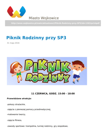 Miasto Wojkowice http://www.wojkowice.pl/main/aktualnosci/Piknik-Rodzinny-przy-SP3/idn:1363/printpdf Piknik Rodzinny przy SP3 31 maja 2016 kategoria: Wojkowice 11 CZERWCA, GODZ. 15:00 - 18:00 Przewidziane atrakcje: -pokazy strażackie, -zajęcia z pierwszej pomocy przedmedycznej, -malowanie twarzy, -zajęcia fitness, -zawody sportowe: trampolina, turniej rodzinny, gry zespołowe, -atrakcje kulinarne, -muzyka i tańce czyli pokaz umiejętności dzieci z kółka tanecznego, -strzelanie z łuku, -mała i duża loteria. Kawiarenka: -grill, -lody, -ciasta, -wata cukrowa, -kawa, herbata, napoje…. Przewidziane nagrody: Turniej Rodzin – nagroda główna: rower, oraz inne nagrody Duża loteria- tablet, bransoletki, książki, piłki, vouchery: pizza Maximus, zapiekanki Smaki Miasta, zabiegi kosmetyczne, fryzjerskie, masaże, usługi dentystyczne i wiele innych ciekawych nagród..