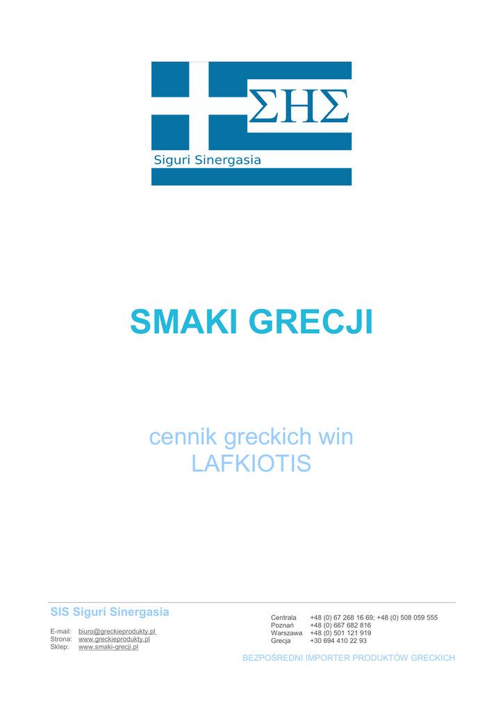 SMAKI GRECJI cennik greckich win LAFKIOTIS SIS Siguri Sinergasia E-mail: [email protected] Strona: www.greckieprodukty.pl Sklep: www.smaki-grecji.pl Centrala Poznań Warszawa Grecja +48 (0) 67 268 16 69; +48 (0) 508 059 555 +48 (0) 667 682 816 +48 (0) 501 121 919 +30 694 410 22 93 BEZPOŚREDNI IMPORTER PRODUKTÓW GRECKICH SYRAH (czerwone) edycja limitowana 3600 szt Szczepy: Agiorgitiko i Syrah Powstało z wyselekcjonowanej winorośli z wysoko położonych plantacji, okolic Nemei. Dojrzewa 12 miesięcy w beczkach z dębu francuskiego i 6 miesięcy w butelkach. Kolor: bardzo ciemny – bordo. Arystokratyczny wygląd Zapach: dzikiej czereśni, czarnej czekolady, pieprzu i eukaliptusa. Na długo pozostawia przyjemny posmak. Sugestie łączenia z jedzeniem: doskonale pasuje do dziczyzny, czerwonych mięs, pikantnych czerwonych sosów i wędlin. Zawartość alkoholu: 13% Serwować w temperaturze 16-18stopni Cena brutto: 99,00 PLN Agionimo (czerwone) - 2-krotnie złoty medal na międzynarodowych targach wina w Salonikach Szczepy: 100% Agiorgitiko Kolor: Niezwykle aromatyczne, o bardzo ciemnym kolorze bordo, arystokratycznym wyglądzie. Dojrzewa 12 miesięcy w nowych beczkach z francuskiego dębu. Zapach: świeżych czereśni i morwy, z nutą wanilii i cynamonu. Smak: Przyjemny garbnik zrównoważony jest aromatem słodkich przypraw. Sugestie łączenia z jedzeniem: Doskonale pasuje do dziczyzny, czerwonych mięs, pikantnych czerwonych sosów i wędlin. Zawartość alkoholu: 12,5% Cena brutto: 65,00 PLN SIS Siguri Sinergasia E-mail: [email protected] Strona: www.greckieprodukty.pl Sklep: www.smaki-grecji.pl Centrala Poznań Warszawa Grecja +48 (0) 67 268 16 69; +48 (0) 508 059 555 +48 (0) 667 682 816 +48 (0) 501 121 919 +30 694 410 22 93 BEZPOŚREDNI IMPORTER PRODUKTÓW GRECKICH Agiorgitiko (czerwone) - złoty medal na międzynarodowych targach wina w Salonikach Szczepy: Agiorgitiko Kolor: ciemny czerwony. Smak: bogaty, owocowy smak, pozostawia jedwabny posmak. Zapach: wanilii i przypraw. Podawać w temperaturze 16 – 18'C Sugestie łączenia z jedzeniem: doskonale pasuje do pikantnych potraw, dziczyzny, pieczonych mięs, wędlin i serów. Zawartość alkoholu: 12% Cena brutto: 45,00 PLN Ninemos (białe) - 2-krotnie srebrny medal na międzynarodowych targach wina w Salonikach Szczepy: Roditis i Chardonnay Zapach: świeżych letnich owoców, jakimi są melony i brzoskwinie. Smak: bogate w smaku, orzeźwiające, ma długi złożony posmak. Podawać w temperaturze 10 – 12'C Sugestie łączenia z jedzeniem: doskonale pasuje do owoców morza, ryb, białego mięsa, sałatek i owoców. Zawartość alkoholu: 12% Cena brutto: 43,00 PLN Moschofilero (białe) Kolor: żółto-zielony. Smak: delikatny, wino orzeźwiające. Zapach: owoców cytrusowych i kwiatów Sugestie łączenia z jedzeniem: doskonale pasuje do owoców morza, ryb, sałatek, delikatnych potraw i owoców. Zawartość alkoholu: 11,5% Cena brutto: 43,00 PLN SIS Siguri Sinergasia E-mail: [email protected] Strona: www.greckieprodukty.pl Sklep: www.smaki-grecji.pl Centrala Poznań Warszawa Grecja +48 (0) 67 268 16 69; +48 (0) 508 059 555 +48 (0) 667 682 816 +48 (0) 501 121 919 +30 694 410 22 93 BEZPOŚREDNI IMPORTER PRODUKTÓW GRECKICH Rodamo czerwone Miejscowe peloponeskie czerwone Szczepy: Agiorgitiko i Cabernet Wyjątkowe w swojej jakości wino, zachęcające bogactwem i mocą odmian winogron, z których zostało wytworzone. Sugestie łączenia z jedzeniem: doskonale pasuje do pikantnych potraw, dziczyzny, pieczonych mięs, wędlin i serów. Zawartość alkoholu: 12,3 – 12,6% Cena brutto: 28,00 PLN Rodamo białe Miejscowe peloponeskie białe Szczepy: Roditis, Moschofilero Wyjątkowe w swojej jakości wino, zachęcające bogactwem i mocą odmian winogron, z których zostało wytworzone. Podawać schłodzone. Sugestie łączenia z jedzeniem: doskonale pasuje do owoców morza, ryb, sałatek, delikatnych potraw i owoców. Zawartość alkoholu: 11,3 - 11,7% Cena brutto: 26,00 PLN Kleoni czerwone Szczepy: Agiorgitiko, Roditis Kolor: odcienie róż. Smak: jednolity smak. Zapach: czerwonych owoców. Sugestie łączenia z jedzeniem: doskonale pasuje do potraw w pomidorowym sosie, pieczonych mięs, makaronów i serów. Zawartość alkoholu: 12% Cena brutto: 21,00 PLN SIS Siguri Sinergasia E-mail: [email protected] Strona: www.greckieprodukty.pl Sklep: www.smaki-grecji.pl Centrala Poznań Warszawa Grecja +48 (0) 67 268 16 69; +48 (0) 508 059 555 +48 (0) 667 682 816 +48 (0) 501 121 919 +30 694 410 22 93 BEZPOŚREDNI IMPORTER PRODUKTÓW GRECKICH Kleoni różowe Szczepy: Agiorgitiko, Roditis Kolor różowy, świetlisty. Smak: Wino mocno orzeźwiające, o jednolitym smaku. Pozostawia na języku przyjemny posmak. Sugestie łączenia z jedzeniem: Możemy podawać z większością codziennie spożywanych posiłków. Zawartość alkoholu: 11,5% Cena brutto: 19,00 PLN Kleoni białe Szczepy: Agiorgitiko, Roditis Kolor świetlisty Smak: Bardzo lubiane, orzeźwiające, o dyskretnym, łagodnym smaku cytrusów. Sugestie łączenia z jedzeniem: doskonałe do owoców morza, białych serów i sałatek. Zawartość alkoholu: 11% Cena brutto: 19,00 PLN RETSINA Szczepy: Roditis Grona winogron po uzyskaniu pełnej dojrzałości podlegają natychmiastowemu przetworzeniu. Restina wymaga na etapie fermentacji dodawania odpowiedniej ilości miąższu w celu otrzymania aromatu winnej latorośli, z której pochodzi. Najlepiej podawać w temp. 8°C. Sugestie łączenia z jedzeniem: tradycyjnie Grecy serwują Retsinę z owocami morza Cena brutto: 19,50 PLN SIS Siguri Sinergasia E-mail: [email protected] Strona: www.greckieprodukty.pl Sklep: www.smaki-grecji.pl Centrala Poznań Warszawa Grecja +48 (0) 67 268 16 69; +48 (0) 508 059 555 +48 (0) 667 682 816 +48 (0) 501 121 919 +30 694 410 22 93 BEZPOŚREDNI IMPORTER PRODUKTÓW GRECKICH