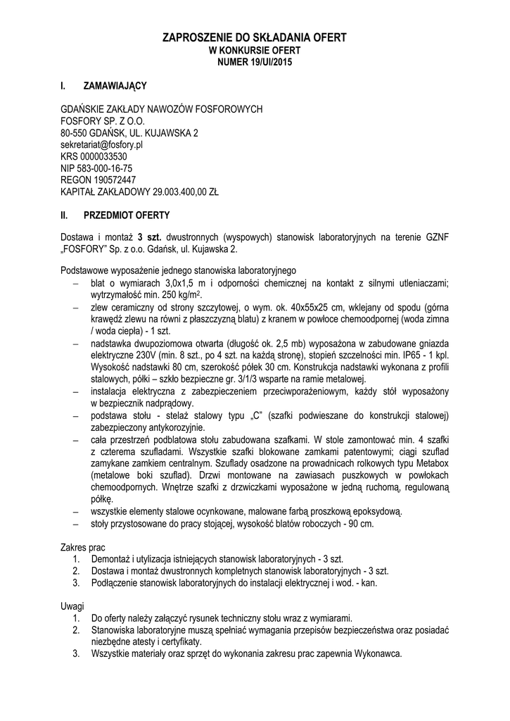 ZAPROSZENIE DO SKŁADANIA OFERT W KONKURSIE OFERT NUMER 19/UI/2015 I. ZAMAWIAJĄCY GDAŃSKIE ZAKŁADY NAWOZÓW FOSFOROWYCH FOSFORY SP. Z O.O. 80-550 GDAŃSK, UL. KUJAWSKA 2 [email protected] KRS 0000033530 NIP 583-000-16-75 REGON 190572447 KAPITAŁ ZAKŁADOWY 29.003.400,00 ZŁ II. PRZEDMIOT OFERTY Dostawa i montaż 3 szt. dwustronnych (wyspowych) stanowisk laboratoryjnych na terenie GZNF „FOSFORY” Sp. z o.o. Gdańsk, ul. Kujawska 2. Podstawowe wyposażenie jednego stanowiska laboratoryjnego blat o wymiarach 3,0x1,5 m i odporności chemicznej na kontakt z silnymi utleniaczami; wytrzymałość min. 250 kg/m2. zlew ceramiczny od strony szczytowej, o wym. ok. 40x55x25 cm, wklejany od spodu (górna krawędź zlewu na równi z płaszczyzną blatu) z kranem w powłoce chemoodpornej (woda zimna / woda ciepła) - 1 szt. nadstawka dwupoziomowa otwarta (długość ok. 2,5 mb) wyposażona w zabudowane gniazda elektryczne 230V (min. 8 szt., po 4 szt. na każdą stronę), stopień szczelności min. IP65 - 1 kpl. Wysokość nadstawki 80 cm, szerokość półek 30 cm. Konstrukcja nadstawki wykonana z profili stalowych, półki – szkło bezpieczne gr. 3/1/3 wsparte na ramie metalowej. instalacja elektryczna z zabezpieczeniem przeciwporażeniowym, każdy stół wyposażony w bezpiecznik nadprądowy. podstawa stołu - stelaż stalowy typu „C” (szafki podwieszane do konstrukcji stalowej) zabezpieczony antykorozyjnie. cała przestrzeń podblatowa stołu zabudowana szafkami. W stole zamontować min. 4 szafki z czterema szufladami. Wszystkie szafki blokowane zamkami patentowymi; ciągi szuflad zamykane zamkiem centralnym. Szuflady osadzone na prowadnicach rolkowych typu Metabox (metalowe boki szuflad). Drzwi montowane na zawiasach puszkowych w powłokach chemoodpornych. Wnętrze szafki z drzwiczkami wyposażone w jedną ruchomą, regulowaną półkę. wszystkie elementy stalowe ocynkowane, malowane farbą proszkową epoksydową. stoły przystosowane do pracy stojącej, wysokość blatów roboczych - 90 cm. Zakres prac 1. Demontaż i utylizacja istniejących stanowisk laboratoryjnych - 3 szt. 2. Dostawa i montaż dwustronnych kompletnych stanowisk laboratoryjnych - 3 szt. 3. Podłączenie stanowisk laboratoryjnych do instalacji elektrycznej i wod. - kan. Uwagi 1. Do oferty należy załączyć rysunek techniczny stołu wraz z wymiarami. 2. Stanowiska laboratoryjne muszą spełniać wymagania przepisów bezpieczeństwa oraz posiadać niezbędne atesty i certyfikaty. 3. Wszystkie materiały oraz sprzęt do wykonania zakresu prac zapewnia Wykonawca. 4. 5. III. Wszystkie odpady powstałe w wyniku prowadzenia prac należy wywieźć i zutylizować. Oczekiwany termin realizacji lipiec 2015 r. INFORMACJE DOTYCZĄCE TERMINU I MIEJSCA SKŁADANIA OFERT Ofertę należy złożyć w zamkniętej kopercie w Kancelarii GZNF FOSFORY Sp. z o.o. 80-550 Gdańsk ul. Kujawska 2, budynek biurowca II piętro z dopiskiem „Oferta na dostawę i montaż 3 szt. dwustronnych stanowisk laboratoryjnych. Konkurs ofert nr 19/UI//2015”. Obiekt w którym mają zostać zamontowane stanowiska laboratoryjne można obejrzeć po uprzednim umówieniu się. Osobą uprawnioną do kontaktów z oferentami jest Pan Waldemar Kolanowski tel. /58/ 343 83 98 lub kom. 669 600 372 Termin składania ofert upływa w dniu 15.06.2015 roku. Za datę terminowego doręczenia oferty uważa się datę zarejestrowania oferty w Kancelarii GZNF FOSFORY. Oferty, które wpłyną po tym terminie nie będą rozpatrywane. IV. KRYTERIA OCENY SPEŁNIENIA DOSTAWCÓW/WYKONAWCÓW L.p. 1. 2. 3. 4. V. WARUNKÓW Kryteria Cena Czas realizacji Referencje Wiarygodność w ocenie członków Komisji WYMAGANYCH OD Znaczenie 70% 10% 10% 10% OFERTA POWINNA ZAWIERAĆ Wykaz głównego wyposażenia i zastosowanych rozwiązań Szczegółowy zakres prac. Termin realizacji. Cenę ofertową. Warunki płatności. Warunki gwarancyjne. Informację o kwalifikacjach posiadanej kadry technicznej. Referencje lub informacje o wykonanych pracach podobnego typu. VI. WYMAGANE ZAŁĄCZNIKI Kserokopia dokumentu rejestrowego oferenta. Kserokopia numeru NIP, REGON. Dokumenty pozwalające ocenić wiarygodność techniczną i ekonomiczną oferenta (np. kadra techniczna, sprzęt itp.) Oświadczenie o sytuacji finansowej zapewniającej wykonanie zamówienia. Oświadczenie o braku wszczęcia w stosunku do oferenta postępowania upadłościowego lub układowego. Oświadczenie o nie zaleganiu z uiszczaniem podatków, opłat lub składek na ubezpieczenia społeczne. VII. UWAGI KOŃCOWE Wszystkie dokumenty ofertowe muszą być podpisane przez osoby uprawnione do reprezentowania firmy. W przypadku zawarcia umowy deklarowane parametry rozliczeń nie będą podlegały zmianie przez cały jej okres działania. W przypadku wątpliwości lub koniecznych uzupełnień po otwarciu ofert zastrzega się prawo do przeprowadzenia rozmów uzupełniających i ewentualnych negocjacji lub do zamknięcia konkursu ofert bez dokonania wyboru którejkolwiek z ofert bez podania przyczyn.