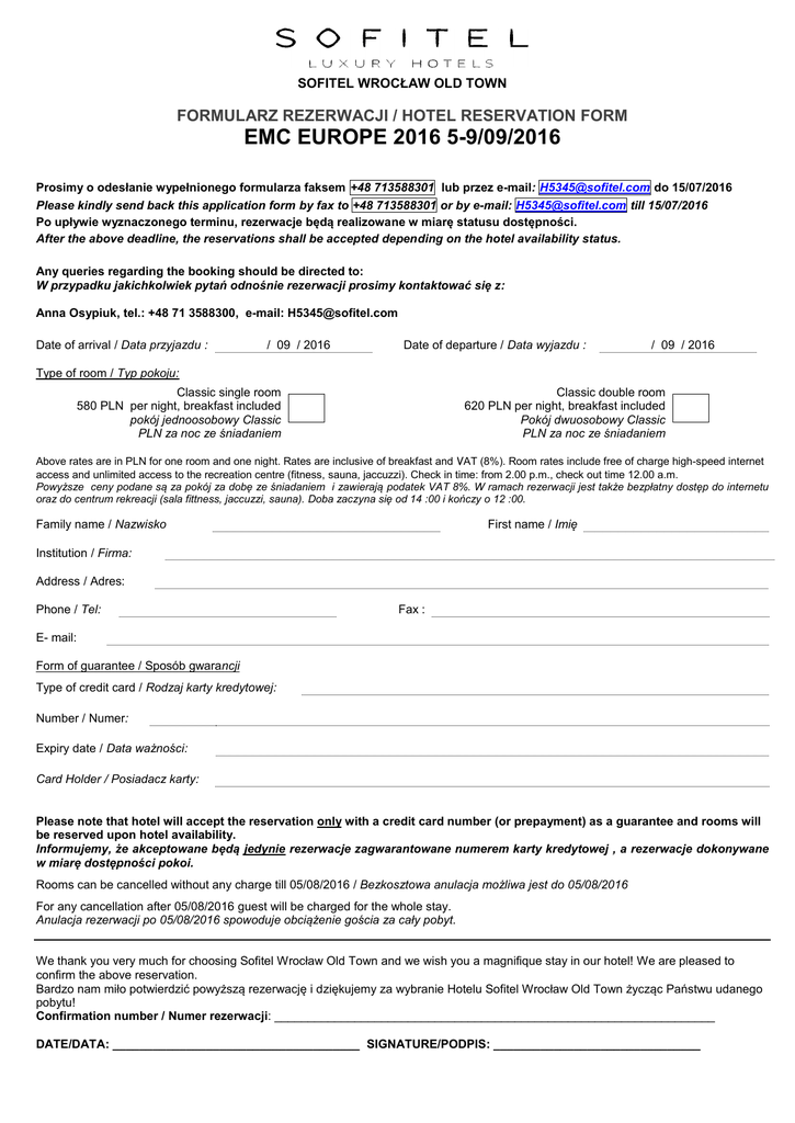 SOFITEL WROCŁAW OLD TOWN FORMULARZ REZERWACJI / HOTEL RESERVATION FORM EMC EUROPE 2016 5-9/09/2016 Prosimy o odesłanie wypełnionego formularza faksem +48 713588301 lub przez e-mail: [email protected] do 15/07/2016 Please kindly send back this application form by fax to +48 713588301 or by e-mail: [email protected] till 15/07/2016 Po upływie wyznaczonego terminu, rezerwacje będą realizowane w miarę statusu dostępności. After the above deadline, the reservations shall be accepted depending on the hotel availability status. Any queries regarding the booking should be directed to: W przypadku jakichkolwiek pytań odnośnie rezerwacji prosimy kontaktować się z: Anna Osypiuk, tel.: +48 71 3588300, e-mail: [email protected] Date of arrival / Data przyjazdu : / 09 / 2016 Date of departure / Data wyjazdu : / 09 / 2016 Type of room / Typ pokoju: Classic single room 580 PLN per night, breakfast included pokój jednoosobowy Classic PLN za noc ze śniadaniem Classic double room 620 PLN per night, breakfast included Pokój dwuosobowy Classic PLN za noc ze śniadaniem Above rates are in PLN for one room and one night. Rates are inclusive of breakfast and VAT (8%). Room rates include free of charge high-speed internet access and unlimited access to the recreation centre (fitness, sauna, jaccuzzi). Check in time: from 2.00 p.m., check out time 12.00 a.m. Powyższe ceny podane są za pokój za dobę ze śniadaniem i zawierają podatek VAT 8%. W ramach rezerwacji jest także bezpłatny dostęp do internetu oraz do centrum rekreacji (sala fittness, jaccuzzi, sauna). Doba zaczyna się od 14 :00 i kończy o 12 :00. First name / Imię Family name / Nazwisko Institution / Firma: Address / Adres: Phone / Tel: Fax : E- mail: Form of guarantee / Sposób gwarancji Type of credit card / Rodzaj karty kredytowej: Number / Numer: Expiry date / Data ważności: Card Holder / Posiadacz karty: Please note that hotel will accept the reservation only with a credit card number (or prepayment) as a guarantee and rooms will be reserved upon hotel availability. Informujemy, że akceptowane będą jedynie rezerwacje zagwarantowane numerem karty kredytowej , a rezerwacje dokonywane w miarę dostępności pokoi. Rooms can be cancelled without any charge till 05/08/2016 / Bezkosztowa anulacja możliwa jest do 05/08/2016 For any cancellation after 05/08/2016 guest will be charged for the whole stay. Anulacja rezerwacji po 05/08/2016 spowoduje obciążenie gościa za cały pobyt. We thank you very much for choosing Sofitel Wrocław Old Town and we wish you a magnifique stay in our hotel! We are pleased to confirm the above reservation. Bardzo nam miło potwierdzić powyższą rezerwację i dziękujemy za wybranie Hotelu Sofitel Wrocław Old Town życząc Państwu udanego pobytu! Confirmation number / Numer rezerwacji: __________________________________________________________________ DATE/DATA: _____________________________________ SIGNATURE/PODPIS: _______________________________