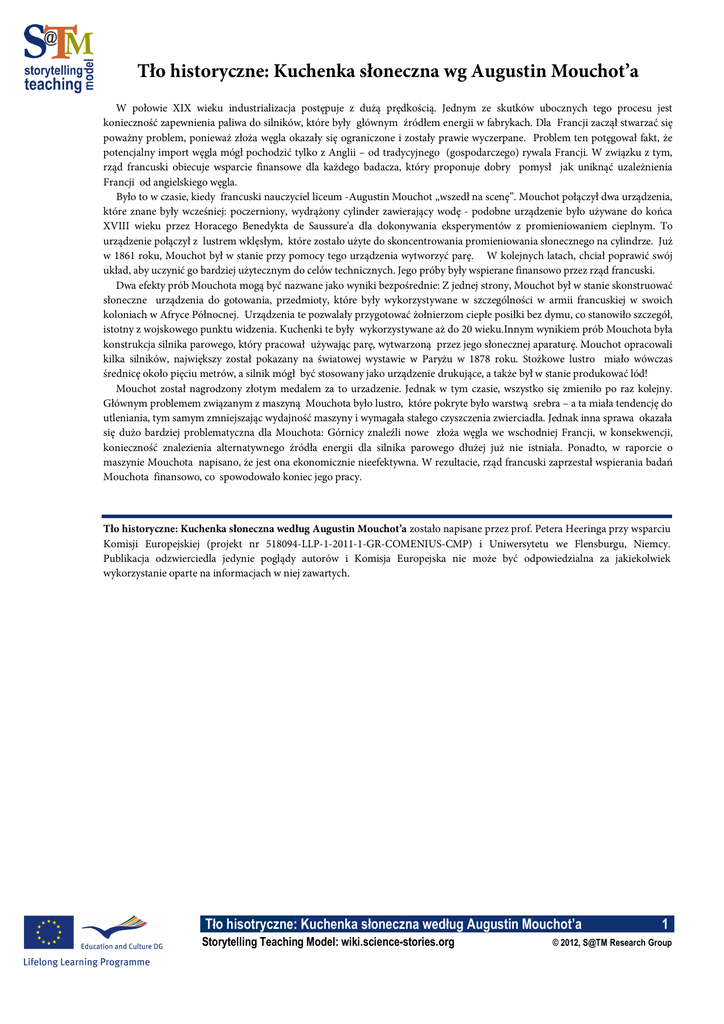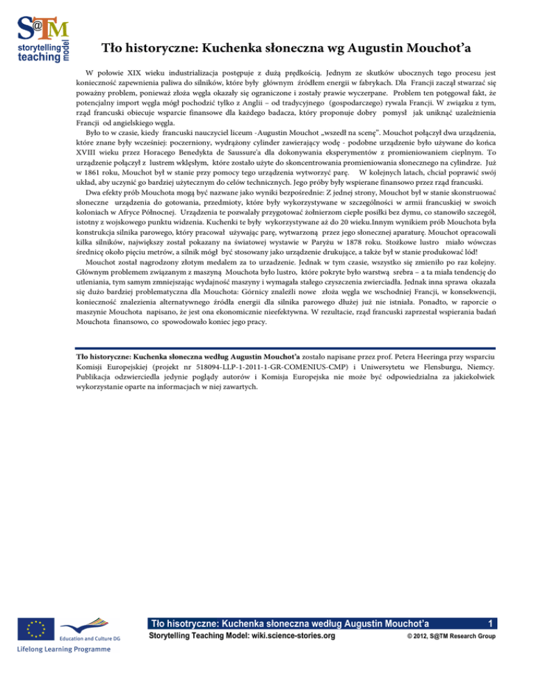 Tło historyczne: Kuchenka słoneczna wg Augustin Mouchot’a W połowie XIX wieku industrializacja postępuje z dużą prędkością. Jednym ze skutków ubocznych tego procesu jest konieczność zapewnienia paliwa do silników, które były głównym źródłem energii w fabrykach. Dla Francji zaczął stwarzać się poważny problem, ponieważ złoża węgla okazały się ograniczone i zostały prawie wyczerpane. Problem ten potęgował fakt, że potencjalny import węgla mógł pochodzić tylko z Anglii – od tradycyjnego (gospodarczego) rywala Francji. W związku z tym, rząd francuski obiecuje wsparcie finansowe dla każdego badacza, który proponuje dobry pomysł jak uniknąć uzależnienia Francji od angielskiego węgla. Było to w czasie, kiedy francuski nauczyciel liceum -Augustin Mouchot „wszedł na scenę”. Mouchot połączył dwa urządzenia, które znane były wcześniej: poczerniony, wydrążony cylinder zawierający wodę - podobne urządzenie było używane do końca XVIII wieku przez Horacego Benedykta de Saussure'a dla dokonywania eksperymentów z promieniowaniem cieplnym. To urządzenie połączył z lustrem wklęsłym, które zostało użyte do skoncentrowania promieniowania słonecznego na cylindrze. Już w 1861 roku, Mouchot był w stanie przy pomocy tego urządzenia wytworzyć parę. W kolejnych latach, chciał poprawić swój układ, aby uczynić go bardziej użytecznym do celów technicznych. Jego próby były wspierane finansowo przez rząd francuski. Dwa efekty prób Mouchota mogą być nazwane jako wyniki bezpośrednie: Z jednej strony, Mouchot był w stanie skonstruować słoneczne urządzenia do gotowania, przedmioty, które były wykorzystywane w szczególności w armii francuskiej w swoich koloniach w Afryce Północnej. Urządzenia te pozwalały przygotować żołnierzom ciepłe posiłki bez dymu, co stanowiło szczegół, istotny z wojskowego punktu widzenia. Kuchenki te były wykorzystywane aż do 20 wieku.Innym wynikiem prób Mouchota była konstrukcja silnika parowego, który pracował używając parę, wytwarzoną przez jego słonecznej aparaturę. Mouchot opracowali kilka silników, największy został pokazany na światowej wystawie w Paryżu w 1878 roku. Stożkowe lustro miało wówczas średnicę około pięciu metrów, a silnik mógł być stosowany jako urządzenie drukujące, a także był w stanie produkować lód! Mouchot został nagrodzony złotym medalem za to urzadzenie. Jednak w tym czasie, wszystko się zmieniło po raz kolejny. Głównym problemem związanym z maszyną Mouchota było lustro, które pokryte było warstwą srebra – a ta miała tendencję do utleniania, tym samym zmniejszając wydajność maszyny i wymagała stałego czyszczenia zwierciadła. Jednak inna sprawa okazała się dużo bardziej problematyczna dla Mouchota: Górnicy znaleźli nowe złoża węgla we wschodniej Francji, w konsekwencji, konieczność znalezienia alternatywnego źródła energii dla silnika parowego dłużej już nie istniała. Ponadto, w raporcie o maszynie Mouchota napisano, że jest ona ekonomicznie nieefektywna. W rezultacie, rząd francuski zaprzestał wspierania badań Mouchota finansowo, co spowodowało koniec jego pracy. Tło historyczne: Kuchenka słoneczna według Augustin Mouchot’a zostało napisane przez prof. Petera Heeringa przy wsparciu Komisji Europejskiej (projekt nr 518094-LLP-1-2011-1-GR-COMENIUS-CMP) i Uniwersytetu we Flensburgu, Niemcy. Publikacja odzwierciedla jedynie poglądy autorów i Komisja Europejska nie może być odpowiedzialna za jakiekolwiek wykorzystanie oparte na informacjach w niej zawartych. Tło hisotryczne: Kuchenka słoneczna według Augustin Mouchot’a Storytelling Teaching Model: wiki.science-stories.org 1 © 2012, S@TM Research Group