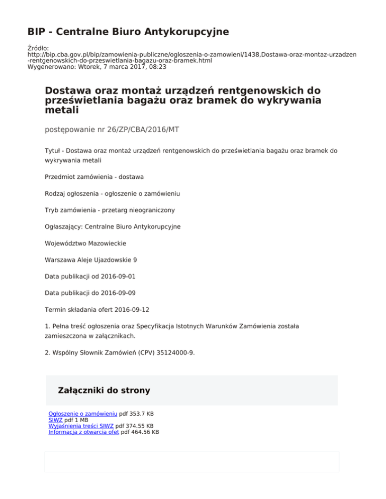 BIP - Centralne Biuro Antykorupcyjne Źródło: http://bip.cba.gov.pl/bip/zamowienia-publiczne/ogloszenia-o-zamowieni/1438,Dostawa-oraz-montaz-urzadzen -rentgenowskich-do-przeswietlania-bagazu-oraz-bramek.html Wygenerowano: Wtorek, 7 marca 2017, 08:23 Dostawa oraz montaż urządzeń rentgenowskich do prześwietlania bagażu oraz bramek do wykrywania metali postępowanie nr 26/ZP/CBA/2016/MT Tytuł - Dostawa oraz montaż urządzeń rentgenowskich do prześwietlania bagażu oraz bramek do wykrywania metali Przedmiot zamówienia - dostawa Rodzaj ogłoszenia - ogłoszenie o zamówieniu Tryb zamówienia - przetarg nieograniczony Ogłaszający: Centralne Biuro Antykorupcyjne Województwo Mazowieckie Warszawa Aleje Ujazdowskie 9 Data publikacji od 2016-09-01 Data publikacji do 2016-09-09 Termin składania ofert 2016-09-12 1. Pełna treść ogłoszenia oraz Specyfikacja Istotnych Warunków Zamówienia została zamieszczona w załącznikach. 2. Wspólny Słownik Zamówień (CPV) 35124000-9. Załączniki do strony Ogłoszenie o zamówieniu pdf 353.7 KB SIWZ pdf 1 MB Wyjaśnienia treści SIWZ pdf 374.55 KB Informacja z otwarcia ofet pdf 464.56 KB Metryczka Data publikacji 01.09.2016 Data modyfikacji 08.09.2016 Rejestr zmian Podmiot udostępniający informację: BIP - Centralne Biuro Antykorupcyjne Osoba wytwarzająca/odpowiadająca za informację: Osoba udostępniająca informację: Katarzyna Kruczek Osoba modyfikująca informację: Edyta Miros