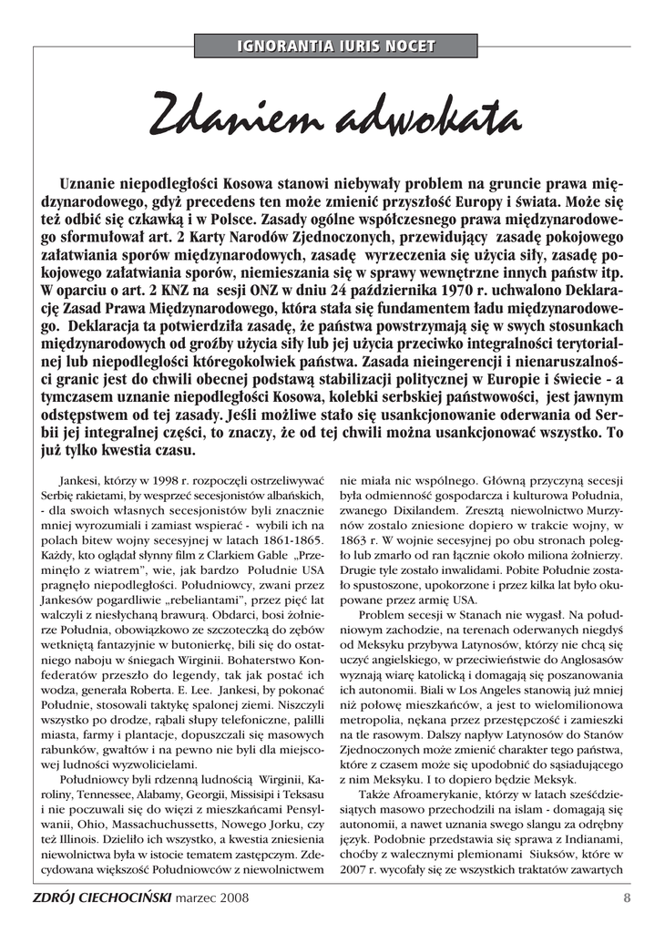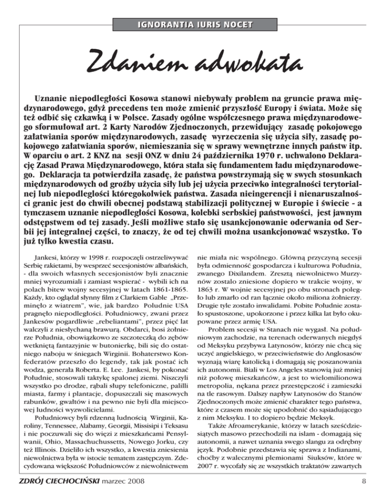 Uznanie niepodleg∏oÊci Kosowa stanowi niebywa∏y problem na gruncie prawa mi´dzynarodowego, gdy˝ precedens ten mo˝e zmieniç przysz∏oÊç Europy i Êwiata. Mo˝e si´ te˝ odbiç si´ czkawkà i w Polsce. Zasady ogólne wspó∏czesnego prawa mi´dzynarodowego sformu∏owa∏ art. 2 Karty Narodów Zjednoczonych, przewidujàcy zasad´ pokojowego za∏atwiania sporów mi´dzynarodowych, zasad´ wyrzeczenia si´ u˝ycia si∏y, zasad´ pokojowego za∏atwiania sporów, niemieszania si´ w sprawy wewn´trzne innych paƒstw itp. W oparciu o art. 2 KNZ na sesji ONZ w dniu 24 paêdziernika 1970 r. uchwalono Deklaracj´ Zasad Prawa Mi´dzynarodowego, która sta∏a si´ fundamentem ∏adu mi´dzynarodowego. Deklaracja ta potwierdzi∏a zasad´, ˝e paƒstwa powstrzymajà si´ w swych stosunkach mi´dzynarodowych od groêby u˝ycia si∏y lub jej u˝ycia przeciwko integralnoÊci terytorialnej lub niepodlegloÊci któregokolwiek paƒstwa. Zasada nieingerencji i nienaruszalnoÊci granic jest do chwili obecnej podstawà stabilizacji politycznej w Europie i Êwiecie - a tymczasem uznanie niepodleg∏oÊci Kosowa, kolebki serbskiej paƒstwowoÊci, jest jawnym odst´pstwem od tej zasady. JeÊli mo˝liwe sta∏o si´ usankcjonowanie oderwania od Serbii jej integralnej cz´Êci, to znaczy, ˝e od tej chwili mo˝na usankcjonowaç wszystko. To ju˝ tylko kwestia czasu. Jankesi, którzy w 1998 r. rozpocz´li ostrzeliwywaç Serbi´ rakietami, by wesprzeç secesjonistów albaƒskich, - dla swoich w∏asnych secesjonistów byli znacznie mniej wyrozumiali i zamiast wspieraç - wybili ich na polach bitew wojny secesyjnej w latach 1861-1865. Ka˝dy, kto oglàda∏ s∏ynny film z Clarkiem Gable „Przemin´∏o z wiatrem”, wie, jak bardzo Poludnie USA pragn´∏o niepodleg∏oÊci. Po∏udniowcy, zwani przez Jankesów pogardliwie „rebeliantami”, przez pi´ç lat walczyli z nies∏ychanà brawurà. Obdarci, bosi ˝o∏nierze Po∏udnia, obowiàzkowo ze szczoteczkà do z´bów wetkni´tà fantazyjnie w butonierk´, bili si´ do ostatniego naboju w Êniegach Wirginii. Bohaterstwo Konfederatów przesz∏o do legendy, tak jak postaç ich wodza, genera∏a Roberta. E. Lee. Jankesi, by pokonaç Po∏udnie, stosowali taktyk´ spalonej ziemi. Niszczyli wszystko po drodze, ràbali s∏upy telefoniczne, palilli miasta, farmy i plantacje, dopuszczali si´ masowych rabunków, gwa∏tów i na pewno nie byli dla miejscowej ludnoÊci wyzwolicielami. Po∏udniowcy byli rdzennà ludnoÊcià Wirginii, Karoliny, Tennessee, Alabamy, Georgii, Missisipi i Teksasu i nie poczuwali si´ do wi´zi z mieszkaƒcami Pensylwanii, Ohio, Massachuchussetts, Nowego Jorku, czy te˝ Illinois. Dzieli∏o ich wszystko, a kwestia zniesienia niewolnictwa by∏a w istocie tematem zast´pczym. Zdecydowana wi´kszoÊç Po∏udniowców z niewolnictwem ZDRÓJ CIECHOCI¡SKI marzec 2008 nie mia∏a nic wspólnego. G∏ównà przyczynà secesji by∏a odmiennoÊç gospodarcza i kulturowa Po∏udnia, zwanego Dixilandem. Zresztà niewolnictwo Murzynów zostalo zniesione dopiero w trakcie wojny, w 1863 r. W wojnie secesyjnej po obu stronach poleg∏o lub zmar∏o od ran ∏àcznie oko∏o miliona ˝o∏nierzy. Drugie tyle zosta∏o inwalidami. Pobite Po∏udnie zosta∏o spustoszone, upokorzone i przez kilka lat by∏o okupowane przez armi´ USA. Problem secesji w Stanach nie wygas∏. Na po∏udniowym zachodzie, na terenach oderwanych niegdyÊ od Meksyku przybywa Latynosów, którzy nie chcà si´ uczyç angielskiego, w przeciwieƒstwie do Anglosasów wyznajà wiar´ katolickà i domagajà si´ poszanowania ich autonomii. Biali w Los Angeles stanowià ju˝ mniej ni˝ po∏ow´ mieszkaƒców, a jest to wielomilionowa metropolia, n´kana przez przest´pczoÊç i zamieszki na tle rasowym. Dalszy nap∏yw Latynosów do Stanów Zjednoczonych mo˝e zmieniç charakter tego paƒstwa, które z czasem mo˝e si´ upodobniç do sàsiadujàcego z nim Meksyku. I to dopiero b´dzie Meksyk. Tak˝e Afroamerykanie, którzy w latach szeÊçdziesiàtych masowo przechodzili na islam - domagajà si´ autonomii, a nawet uznania swego slangu za odr´bny j´zyk. Podobnie przedstawia si´ sprawa z Indianami, choçby z walecznymi plemionami Siuksów, które w 2007 r. wycofa∏y si´ ze wszystkich traktatów zawartych 8 w minionych wiekach z rzàdem USA. Siuksowie to nie ˝arty, zamieszkujà rozleg∏e pó∏nocno-zachodnie tereny Stanów, demograficznie uroÊli w si∏´ po masowych rzeziach dokonywanych na nich w XIX wieku, a w przesz∏oÊci przysporzyli US Army mnóstwo k∏opotów. To w∏aÊnie Siuksowie z plemianie Dakota, dowodzeni przez wielkiego wodza Sitting Bulla, pobili w 1876 r. kawaleri´ amerykaƒskà pod Little Big Horn. W bitwie tej poleg∏ s∏ynny genera∏ George Custer wraz ze swymi 255 kawalerzystami. Tak wi´c tradycji i tendencji separatystycznych w USA nie brakuje, tyle, ˝e przyszli separatyÊci muszà sobie najpierw poszukaç odpowiedniego sponsora, najlepiej takiego z rakietami i g∏owicami jàdrowymi. SeperatyÊci bez sponsorów majà bowiem s∏abà si∏´ przebicia, choçby Baskowie w Hiszpanii, Bretoƒczycy we Francji czy Walijczycy w Wielkiej Brytanii. Znacznie lepiej majà si´ separatyÊci w krajach by∏ego ZSRR. Weêmy choçby taki Krym. Do 1954 r. nale˝a∏ do Rosji. Potem Chruszczow sprezentowa∏ go Ukrainie. Ukraina ma zatem do Krymu wszelkie prawa, tyle ˝e Ukraiƒcy stanowià tam zdecydowanà mniejszoÊç, podobnie jak Serbowie w Kosowie, ale Kosowo by∏o zawsze serbskie, a Krym do Ukrainy nale˝y raptem pó∏ wieku. Je˝eli wi´c ludnoÊç Krymu za˝àda niepodleg∏oÊci, a nast´pnie przy∏àczenia do Rosji - to przecie˝ nie mo˝na jej b´dzie tego zabroniç, przecie˝ mieszkaƒcy Krymu nie sà gorsi od Kosowarów. Podobnie przedstawia si´ sprawa ca∏ej po∏udniowo - wschodniej Ukrainy z Donbasem w∏àcznie. Sà to tereny niemal w ca∏oÊci zamieszkane przez ludnoÊç rosyjskoj´zycznà. Rosja jest bogata, bo ma suro