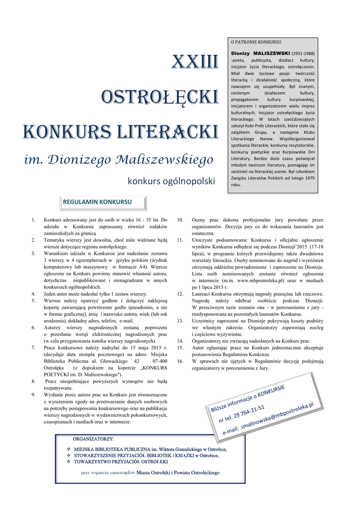 O PATRONIE KONKURSU XXIIi OstroŁĘcki KONKURS LITERACKI im. Dionizego Maliszewskiego konkurs ogólnopolski Dionizy MALISZEWSKI (1931-1988) -poeta, publicysta, działacz kultury, inicjator życia literackiego, ostrołęczanin. Miał dwie życiowe pasje: twórczość literacką i działalność społeczną, które nawzajem się uzupełniały. Był znanym, cenionym działaczem kultury, propagatorem kultury kurpiowskiej, inicjatorem i organizatorem wielu imprez kulturalnych. Inicjator ostrołęckiego życia literackiego. W latach sześćdziesiątych założył Koło Prób Literackich, które stało się zalążkiem Grupy, a następnie Klubu Literackiego Narew. Współorganizował spotkania literackie, konkursy recytatorskie, konkursy poetyckie oraz Kurpiowskie Dni Literatury. Bardzo dużo czasu poświęcał młodym twórcom literatury, pomagając im zaistnieć na literackiej scenie. Był członkiem Związku Literatów Polskich od lutego 1979 roku. REGULAMIN KONKURSU 1. 2. 3. 4. 5. 6. 7. 8. 9. Konkurs adresowany jest do osób w wieku 16 - 35 lat. Do udziału w Konkursie zapraszamy również rodaków zamieszkałych za granicą Tematyka wierszy jest dowolna, choć mile widziane będą wiersze dotyczące regionu ostrołęckiego. Warunkiem udziału w Konkursie jest nadesłanie zestawu 3 wierszy w 4 egzemplarzach w języku polskim (wydruk komputerowy lub maszynowy w formacie A4). Wiersze zgłoszone na Konkurs powinny stanowić własność autora, dotychczas niepublikowane i nienagradzane w innych konkursach ogólnopolskich. Jeden autor może nadesłać tylko 1 zestaw wierszy. Wiersze należy opatrzyć godłem i dołączyć zaklejoną kopertę zawierającą powtórzone godło (pseudonim, a nie w formie graficznej), imię i nazwisko autora, wiek (lub rok urodzenia), dokładny adres, telefon, e-mail. Autorzy wierszy nagrodzonych zostaną poproszeni o przesłanie wersji elektronicznej nagrodzonych prac (w celu przygotowania tomiku wierszy nagrodzonych). Prace konkursowe należy nadsyłać do 15 maja 2015 r. (decyduje data stempla pocztowego) na adres: Miejska Biblioteka Publiczna ul. Głowackiego 42 07-400 Ostrołęka (z dopiskiem na kopercie „KONKURS POETYCKI im. D. Maliszewskiego"). Prace niespełniające powyższych wymogów nie będą rozpatrywane. Wysłanie przez autora prac na Konkurs jest równoznaczne z wyrażeniem zgody na przetwarzanie danych osobowych na potrzeby postępowania konkursowego oraz na publikacje wierszy nagrodzonych w wydawnictwach pokonkursowych, czasopismach i mediach oraz w internecie. 10. 11. 12. 13. 14. 15. 16. Oceny prac dokona profesjonalne jury powołane przez organizatorów. Decyzja jury co do wskazania laureatów jest ostateczna. Uroczyste podsumowanie Konkursu i oficjalne ogłoszenie wyników Konkursu odbędzie się podczas Dionizji’2015 (17-18 lipca), w programie których przewidujemy także dwudniowe warsztaty literackie. Osoby nominowane do nagród i wyróżnień otrzymają oddzielne powiadomienie i zaproszenie na Dionizje. Lista osób nominowanych zostanie również ogłoszona w internecie (m.in. www.mbpostroleka.pl) oraz w mediach po 1 lipca 2015 r. Laureaci Konkursu otrzymują nagrody pieniężne lub rzeczowe. Nagrodę należy odebrać osobiście podczas Dionizji. W przeciwnym razie zostanie ona - w porozumieniu z jury rozdysponowana na pozostałych laureatów Konkursu. Uczestnicy zaproszeni na Dionizje pokrywają koszty podróży we własnym zakresie. Organizatorzy zapewniają nocleg i częściowe wyżywienie. Organizatorzy nie zwracają nadesłanych na Konkurs prac. Autor zgłaszając prace na Konkurs jednoznacznie akceptuje postanowienia Regulaminu Konkursu. W sprawach nie ujętych w Regulaminie decyzję podejmują organizatorzy w porozumieniu z Jury. ORGANIZATORZY: MIEJSKA BIBLIOTEKA PUBLICZNA im. Wiktora Gomulickiego w Ostrołęce, STOWARZYSZENIE PRZYJACIÓŁ BIBLIOTEK i KSIĄŻKI w Ostrołęce, TOWARZYSTWO PRZYJACIÓŁ OSTROŁĘKI przy wsparciu samorządów Miasta Ostrołęki i Powiatu Ostrołęckiego