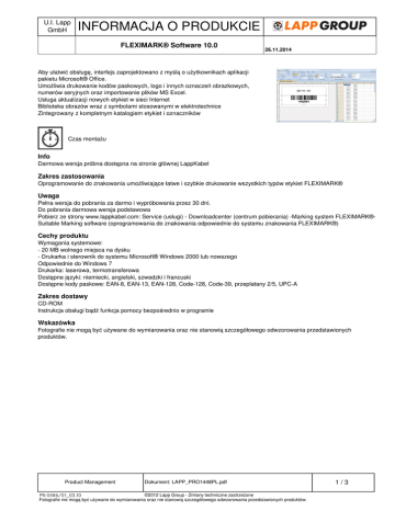 U.I. Lapp GmbH INFORMACJA O PRODUKCIE FLEXIMARK® Software 10.0 26.11.2014 Aby ułatwić obsługę, interfejs zaprojektowano z myślą o użytkownikach aplikacji pakietu Microsoft® Office. Umożliwia drukowanie kodów paskowych, logo i innych oznaczeń obrazkowych, numerów seryjnych oraz importowanie plików MS Excel. Usługa aktualizacji nowych etykiet w sieci Internet Biblioteka obrazów wraz z symbolami stosowanymi w elektrotechnice Zintegrowany z kompletnym katalogiem etykiet i oznaczników Czas montażu Info Darmowa wersja próbna dostępna na stronie głównej LappKabel Zakres zastosowania Oprogramowanie do znakowania umożliwiające łatwe i szybkie drukowanie wszystkich typów etykiet FLEXIMARK® Uwaga Pełna wersja do pobrania za darmo i wypróbowania przez 30 dni. Do pobrania darmowa wersja podstawowa Pobierz ze strony www.lappkabel.com: Service (usługi) - Downloadcenter (centrum pobierania) -Marking system FLEXIMARK®Suitable Marking software (oprogramowania do znakowania odpowiednie do systemu znakowania FLEXIMARK®) Cechy produktu Wymagania systemowe: - 20 MB wolnego miejsca na dysku - Drukarka i sterownik do systemu Microsoft® Windows 2000 lub nowszego Odpowiednie do Windows 7 Drukarka: laserowa, termotransferowa Dostępne języki: niemiecki, angielski, szwedzki i francuski Dostępne kody paskowe: EAN-8, EAN-13, EAN-128, Code-128, Code-39, przeplatany 2/5, UPC-A Zakres dostawy CD-ROM Instrukcja obsługi bądź funkcja pomocy bezpośrednio w programie Wskazówka Fotografie nie mogą być używane do wymiarowania oraz nie stanowią szczegółowego odwzorowania przedstawionych produktów. Product Management Dokument: LAPP_PRO1448PL.pdf ©2012 Lapp Group - Zmiany techniczne zastrzeżone PN 0486/01_03.10 Fotografie nie mogą być używane do wymiarowania oraz nie stanowią szczegółowego odwzorowania przedstawionych produktów. 1/3 Powered by TCPDF (www.tcpdf.org) Język Jednostka dostawy (PU) 83251080 FLEXIMARK® Software 10.0 DE / EN / SE / FR 1 Dokument: LAPP_PRO1448PL.pdf FLEXIMARK® Software 10.0 INFORMACJA O PRODUKCIE Product Management U.I. Lapp GmbH Oznaczenie wyrobu 26.11.2014 ©2012 Lapp Group - Zmiany techniczne zastrzeżone PN 0486/01_03.10 Fotografie nie mogą być używane do wymiarowania oraz nie stanowią szczegółowego odwzorowania przedstawionych produktów. Numer artykułu 2/3 Powered by TCPDF (www.tcpdf.org) U.I. Lapp GmbH INFORMACJA O PRODUKCIE FLEXIMARK® Software 10.0 Product Management 26.11.2014 Dokument: LAPP_PRO1448PL.pdf ©2012 Lapp Group - Zmiany techniczne zastrzeżone PN 0486/01_03.10 Fotografie nie mogą być używane do wymiarowania oraz nie stanowią szczegółowego odwzorowania przedstawionych produktów. 3/3