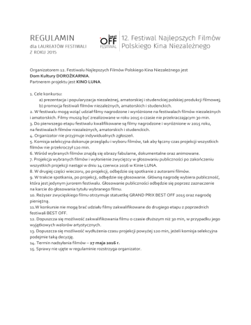 Organizatorem 12. Festiwalu Najlepszych Filmów Polskiego Kina Niezależnego jest Dom Kultury DOROŻKARNIA. Partnerem projektu jest KINO LUNA. 1. Cele konkursu: a) prezentacja i popularyzacja niezależnej, amatorskiej i studenckiej polskiej produkcji filmowej; b) promocja festiwali filmów niezależnych, amatorskich i studenckich. 2. W festiwalu mogą wziąć udział filmy nagrodzone i wyróżnione na festiwalach filmów niezależnych i amatorskich. Filmy muszą być zrealizowane w roku 2015 o czasie nie przekraczającym 30 min. 3. Do pierwszego etapu festiwalu kwalifikowane są filmy nagrodzone i wyróżnione w 2015 roku, na festiwalach filmów niezależnych, amatorskich i studenckich. 4. Organizator nie przyjmuje indywidualnych zgłoszeń. 5. Komisja selekcyjna dokonuje przeglądu i wyboru filmów, tak aby łączny czas projekcji wszystkich filmów nie przekroczył 120 min. 6. Wśród wybranych filmów znajdą się obrazy fabularne, dokumentalne oraz animowane. 7. Projekcja wybranych filmów i wyłonienie zwycięzcy w głosowaniu publiczności po zakończeniu wszystkich projekcji nastąpi w dniu 14 czerwca 2016 w Kinie LUNA. 8. W drugiej części wieczoru, po projekcji, odbędzie się spotkanie z autorami filmów. 9. W trakcie spotkania, po projekcji, odbędzie się głosowanie. Główną nagrodę wybiera publiczność, która jest jedynym jurorem festiwalu. Głosowanie publiczności odbędzie się poprzez zaznaczenie na karcie do głosowania tytułu wybranego filmu. 10. Reżyser zwycięskiego filmu otrzymuje statuetkę GRAND PRIX BEST OFF 2015 oraz nagrodę pieniężną. 11.W konkursie nie mogą brać udziału filmy zakwalifikowane do drugiego etapu z poprzednich festiwali BEST OFF. 12. Dopuszcza się możliwość zakwalifikowania filmu o czasie dłuższym niż 30 min, w przypadku jego wyjątkowych walorów artystycznych. 13. Dopuszcza się możliwość wydłużenia czasu projekcji powyżej 120 min, jeżeli komisja selekcyjna podejmie taką decyzję. 14. Termin nadsyłania filmów – 27 maja 2016 r. 15. Sprawy nie ujęte w regulaminie rozstrzyga organizator.