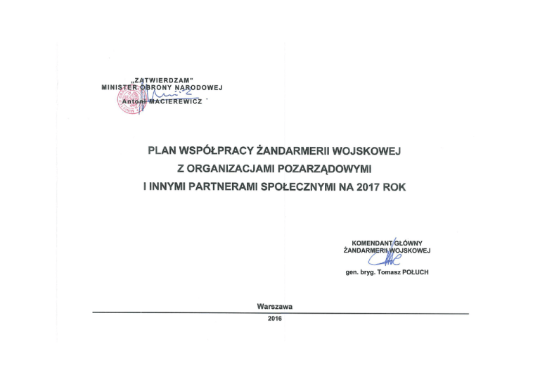 Lp. Nazwa przedsięwzięcia Data i miejsce realizacji Szczegółowy zakres oczekiwanej pomocy ze szczególnym wskazaniem podmiotu ponoszącego z tego tytułu koszty 1 2 3 4 styczeń 1. Szkolenie z technik interwencji. Kalisz Pomorski styczeń luty marzec 2. Zajęcia sprawnościowo -szkoleniowe. Mińsk Mazowiecki 3. Przeprowadzenie zajęć z zakresu taktyki i technik interwencji, służby patrolowej i konwojowej, uprawnień patrolu do legitymowania i zatrzymywania, ochrony VIP, zasad taktycznej korespondencji radiowej oraz zasad kierowania ruchem drogowym. Wydzielenie instruktorów i niezbędnego SpW do zabezpieczenia szkolenia. Pomoc organizacyjna w przeprowadzeniu zajęć. Wyznaczenie instruktorów wraz z niezbędnym SpW do merytorycznego wsparcia przeprowadzenia zajęć według odrębnego programu. Pokaz bazy szkoleniowej. Użyczenie terenu, obiektów sportowych i szkoleniowych do przeprowadzenia zajęć oraz SpW na podstawie oddzielnej umowy cywilnoprawnej. Nazwy innych jednostek wojskowych, które będą wspierały przedsięwzięcie 5 Jednostka wojskowa planowana do udzielenia pomocy 6 Bemowo Piskie, Orzysz 7 Wydział ŻW w Olesznie Zespół Szkół Ponadgimnazjalnych w Kaliszu Pomorskim - Centrum Szkolenia ŻW Zespół Szkół EkonomicznoGastronomicznych im. Stanisława Staszica w Otwocku - Wydział ŻW w Bemowie Piskim Fundacja „Instytut Informacji” Polski System Walki Wręcz Haller - styczeń sierpień Nieodpłatne przeprowadzenie zajęć, wydzielenie instruktorów i niezbędnego SpW do zabezpieczenia szkolenia. Wnioskodawca 2 Lp. Nazwa przedsięwzięcia Data i miejsce realizacji Szczegółowy zakres oczekiwanej pomocy ze szczególnym wskazaniem podmiotu ponoszącego z tego tytułu koszty 1 2 3 4 4. Zajęcia z przysposobienia obronnego dla uczniów klas wojskowych. 20 styczeń Wyznaczenie instruktorów 3 luty do merytorycznego wsparcia prowadzenia 10 i 24 zajęć. marzec 19 maj Bezpłatne udostępnienie sprzętu wojskowego: 29 wrzesień - tablice poglądowe, przekroje broni i 16 grantów, październik - tarcze do walki wręcz 18 szt., 24 listopad - ochraniacze krocza 18szt., 15 grudzień - ochraniacze podudzia 18 szt., - ochraniacze głowy 18 szt., - atrapa broni długiej 18 szt., - atrapa broni krótkiej 18 szt., - zestaw do wspinaczki 19 kpl., - pistolet pneumatyczny 10 szt., - tablice strzeleckie 10 szt., - tarcze strzeleckie 40 szt., Mińsk - odzież filtracyjna FOO 18 szt., Mazowiecki - rękawice bokserskie 18 kpl., - radiostacje plecakowe 2 szt., - mapa w systemie UTM 1 szt., Nazwy innych jednostek wojskowych, które będą wspierały przedsięwzięcie 5 Jednostka wojskowa planowana do udzielenia pomocy 6 - Oddział Specjalny ŻW w Mińsku Mazowieckim Wnioskodawca 7 Liceum Ogólnokształcące im. Bitwy Warszawskiej 1920 roku w Urlach Użytkowanie obiektów sportowych i szkoleniowych na podstawie oddzielnej umowy cywilno-prawnej. 3 Lp. Nazwa przedsięwzięcia Data i miejsce realizacji Szczegółowy zakres oczekiwanej pomocy ze szczególnym wskazaniem podmiotu ponoszącego z tego tytułu koszty 1 2 3 4 5. Przeprowadzenie zajęć z zakresu taktyki i technik interwencji, służby patrolowej i konwojowej, uprawnień patrolu do legitymowania i zatrzymywania, ochrony VIP, zasad taktycznej korespondencji radiowej oraz zasad kierowania ruchem drogowym. 6. Zajęcia z przysposobienia obronnego dla uczniów II klas wojskowych. Nazwy innych jednostek wojskowych, które będą wspierały przedsięwzięcie 5 Jednostka wojskowa planowana do udzielenia pomocy 6 styczeń lipiec Bemowo Piskie, Orzysz Nieodpłatne przeprowadzenie zajęć, wydzielenie instruktorów i niezbędnego SpW do zabezpieczenia szkolenia. 13 i 27 styczeń Wyznaczenie instruktorów 10 luty do merytorycznego wsparcia prowadzenia 11 i 24 zajęć. marzec Bezpłatne udostępnienie sprzętu wojskowego: 7 i 28 - tablice poglądowe, przekroje broni kwiecień i grantów, 6 październik - tarcze do walki wręcz 18 szt., 10, 17, 24 - ochraniacze krocza 18 szt., listopad - ochraniacze podudzia 18 szt., 8, 15 zestaw do wspinaczki 19 kpl., grudzień w godz. 8 – Użytkowanie obiektów sportowych 13.30 i szkoleniowych na podstawie oddzielnej umowy cywilno-prawnej. Mińsk Mazowiecki Wnioskodawca 7 - Wydział ŻW w Bemowie Piskim Fundacja na Rzecz Obronności i Bezpieczeństwa Kraju „Combat Alert” - Oddział Specjalny ŻW w Mińsku Mazowieckim ZS Nr 1 im. Kazimierza Wielkiego w Mińsku Mazowieckim 4 Lp. Nazwa przedsięwzięcia Data i miejsce realizacji Szczegółowy zakres oczekiwanej pomocy ze szczególnym wskazaniem podmiotu ponoszącego z tego tytułu koszty 1 2 3 4 7. Zajęcia z przysposobienia obronnego dla uczniów klasy o profilu ratowniczo-obronnym. styczeń grudzień Udział wyznaczonych instruktorów z ŻW do merytorycznego wsparcia prowadzenia zajęć w ramach przysposobienia obronnego według odrębnego planu. 8. Zajęcia z przysposobienia obronnego dla uczniów II klas wojskowych. Szczecinie 20 styczeń 3 luty Wyznaczenie instruktorów do 3,17, 31 merytorycznego wsparcia prowadzenia zajęć. marzec 19 maj Bezpłatne udostępnienie sprzętu wojskowego: 22 i 29 - atrapa noża - 15 szt., wrzesień - atrapa broni palnej - 5 szt., 20, 27 - pałka służbowa - 31 szt., październik - kamizelka kuloodporna - 5 szt., 3, 24 listopad - atrapa paralizatora - 1 szt., 1, 15 - kajdanki - 15 szt., grudzień broń pneumatyczna - 3 szt., w tracze strzeleckie papierowe - 94 szt., LO w - granat treningowy - 4 szt., Mrozach - pojazd Land Rover – 2 szt. 12 maj w OSŻW Mińsk Mazowiecki Mrozy Nazwy innych jednostek wojskowych, które będą wspierały przedsięwzięcie 5 Jednostka wojskowa planowana do udzielenia pomocy 6 Wnioskodawca 7 - Oddział ŻW w Szczecinie Gimnazjum nr 18 im. Noblistów Polskich w Szczecinie - Oddział Specjalny ŻW w Mińsku Mazowieckim Zespół Szkół Publicznych im. Adam Mickiewicza w Mrozach Użytkowanie obiektów sportowych i szkoleniowych na podstawie oddzielnej umowy cywilno-prawnej. - 5000 szt. 4,5 nb D