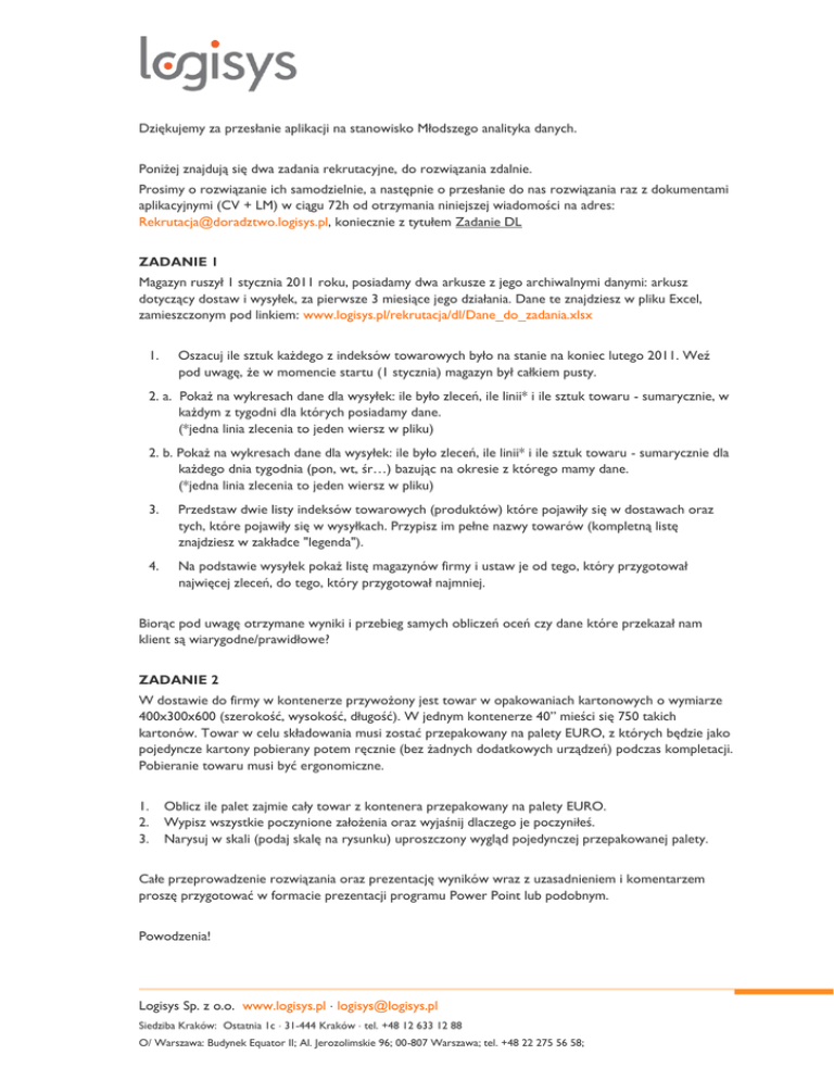 Dziękujemy za przesłanie aplikacji na stanowisko Młodszego analityka danych. Poniżej znajdują się dwa zadania rekrutacyjne, do rozwiązania zdalnie. Prosimy o rozwiązanie ich samodzielnie, a następnie o przesłanie do nas rozwiązania raz z dokumentami aplikacyjnymi (CV + LM) w ciągu 72h od otrzymania niniejszej wiadomości na adres: [email protected], koniecznie z tytułem Zadanie DL ZADANIE 1 Magazyn ruszył 1 stycznia 2011 roku, posiadamy dwa arkusze z jego archiwalnymi danymi: arkusz dotyczący dostaw i wysyłek, za pierwsze 3 miesiące jego działania. Dane te znajdziesz w pliku Excel, zamieszczonym pod linkiem: www.logisys.pl/rekrutacja/dl/Dane_do_zadania.xlsx 1. Oszacuj ile sztuk każdego z indeksów towarowych było na stanie na koniec lutego 2011. Weź pod uwagę, że w momencie startu (1 stycznia) magazyn był całkiem pusty. 2. a. Pokaż na wykresach dane dla wysyłek: ile było zleceń, ile linii* i ile sztuk towaru - sumarycznie, w każdym z tygodni dla których posiadamy dane. (*jedna linia zlecenia to jeden wiersz w pliku) 2. b. Pokaż na wykresach dane dla wysyłek: ile było zleceń, ile linii* i ile sztuk towaru - sumarycznie dla każdego dnia tygodnia (pon, wt, śr…) bazując na okresie z którego mamy dane. (*jedna linia zlecenia to jeden wiersz w pliku) 3. Przedstaw dwie listy indeksów towarowych (produktów) które pojawiły się w dostawach oraz tych, które pojawiły się w wysyłkach. Przypisz im pełne nazwy towarów (kompletną listę znajdziesz w zakładce "legenda"). 4. Na podstawie wysyłek pokaż listę magazynów firmy i ustaw je od tego, który przygotował najwięcej zleceń, do tego, który przygotował najmniej. Biorąc pod uwagę otrzymane wyniki i przebieg samych obliczeń oceń czy dane które przekazał nam klient są wiarygodne/prawidłowe? ZADANIE 2 W dostawie do firmy w kontenerze przywożony jest towar w opakowaniach kartonowych o wymiarze 400x300x600 (szerokość, wysokość, długość). W jednym kontenerze 40” mieści się 750 takich kartonów. Towar w celu składowania musi zostać przepakowany na palety EURO, z których będzie jako pojedyncze kartony pobierany potem ręcznie (bez żadnych dodatkowych urządzeń) podczas kompletacji. Pobieranie towaru musi być ergonomiczne. 1. 2. 3. Oblicz ile palet zajmie cały towar z kontenera przepakowany na palety EURO. Wypisz wszystkie poczynione założenia oraz wyjaśnij dlaczego je poczyniłeś. Narysuj w skali (podaj skalę na rysunku) uproszczony wygląd pojedynczej przepakowanej palety. Całe przeprowadzenie rozwiązania oraz prezentację wyników wraz z uzasadnieniem i komentarzem proszę przygotować w formacie prezentacji programu Power Point lub podobnym. Powodzenia! Logisys Sp. z o.o. www.logisys.pl [email protected] Siedziba Kraków: Ostatnia 1c 31-444 Kraków tel. +48 12 633 12 88 O/ Warszawa: Budynek Equator II; Al. Jerozolimskie 96; 00-807 Warszawa; tel. +48 22 275 56 58;
