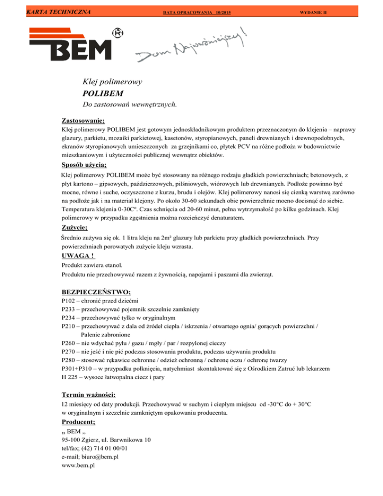 KARTA TECHNICZNA DATA OPRACOWANIA 10/2015 WYDANIE II Klej polimerowy POLIBEM Do zastosowań wewnętrznych. Zastosowanie; Klej polimerowy POLIBEM jest gotowym jednoskładnikowym produktem przeznaczonym do klejenia – naprawy glazury, parkietu, mozaiki parkietowej, kasetonów, styropianowych, paneli drewnianych i drewnopodobnych, ekranów styropianowych umieszczonych za grzejnikami co, płytek PCV na różne podłoża w budownictwie mieszkaniowym i użyteczności publicznej wewnątrz obiektów. Sposób użycia; Klej polimerowy POLIBEM może być stosowany na różnego rodzaju gładkich powierzchniach; betonowych, z płyt kartono – gipsowych, paździerzowych, pilśniowych, wiórowych lub drewnianych. Podłoże powinno być mocne, równe i suche, oczyszczone z kurzu, brudu i olejów. Klej polimerowy nanosi się cienką warstwą zarówno na podłoże jak i na materiał klejony. Po około 30-60 sekundach obie powierzchnie mocno docisnąć do siebie. Temperatura klejenia 0-30Cº. Czas schnięcia od 20-60 minut, pełna wytrzymałość po kilku godzinach. Klej polimerowy w przypadku zgęstnienia można rozcieńczyć denaturatem. Zużycie; Średnio zużywa się ok. 1 litra kleju na 2m² glazury lub parkietu przy gładkich powierzchniach. Przy powierzchniach porowatych zużycie kleju wzrasta. UWAGA ! Produkt zawiera etanol. Produktu nie przechowywać razem z żywnością, napojami i paszami dla zwierząt. BEZPIECZEŃSTWO; P102 – chronić przed dziećmi P233 – przechowywać pojemnik szczelnie zamknięty P234 – przechowywać tylko w oryginalnym P210 – przechowywać z dala od źródeł ciepła / iskrzenia / otwartego ognia/ gorących powierzchni / Palenie zabronione P260 – nie wdychać pyłu / gazu / mgły / par / rozpylonej cieczy P270 – nie jeść i nie pić podczas stosowania produktu, podczas używania produktu P280 – stosować rękawice ochronne / odzież ochronną / ochronę oczu / ochronę twarzy P301+P310 – w przypadku połknięcia, natychmiast skontaktować się z Ośrodkiem Zatruć lub lekarzem H 225 – wysoce łatwopalna ciecz i pary Termin ważności: 12 miesięcy od daty produkcji. Przechowywać w suchym i ciepłym miejscu od -30°C do + 30°C w oryginalnym i szczelnie zamkniętym opakowaniu producenta. Producent; ,, BEM ,, 95-100 Zgierz, ul. Barwnikowa 10 tel/fax; (42) 714 01 00/01 e-mail; [email protected] www.bem.pl