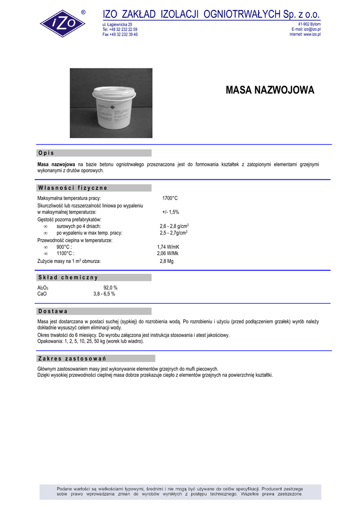 MASA NAZWOJOWA Opis Masa nazwojowa na bazie betonu ogniotrwałego przeznaczona jest do formowania kształtek z zatopionymi elementami grzejnymi wykonanymi z drutów oporowych. Własności fizyczne Maksymalna temperatura pracy: Skurczliwość lub rozszerzalność liniowa po wypaleniu w maksymalnej temperaturze: Gęstość pozorna prefabrykatów: • surowych po 4 dniach: • po wypaleniu w max temp. pracy: Przewodność cieplna w temperaturze: • 900°C : • 1100°C : ZuŜycie masy na 1 m3 obmurza: 1700°C +/- 1,5% 2,6 - 2,8 g/cm3 2,5 - 2,7g/cm3 1,74 W/mK 2,06 W/Mk 2,8 Mg Skład chemiczny Al2O3 CaO 92,0 % 3,8 - 6,5 % Dostawa Masa jest dostarczana w postaci suchej (sypkiej) do rozrobienia wodą. Po rozrobieniu i uŜyciu (przed podłączeniem grzałek) wyrób naleŜy dokładnie wysuszyć celem eliminacji wody. Okres trwałości do 6 miesięcy. Do wyrobu załączona jest instrukcja stosowania i atest jakościowy. Opakowania: 1, 2, 5, 10, 25, 50 kg (worek lub wiadro). Zakres zastosowań Głównym zastosowaniem masy jest wykonywanie elementów grzejnych do mufli piecowych. Dzięki wysokiej przewodności cieplnej masa dobrze przekazuje ciepło z elementów grzejnych na powierzchnię kształtki.