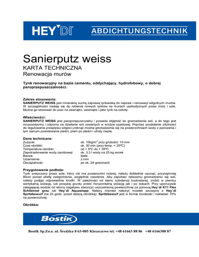 Sanierputz weiss KARTA TECHNICZNA Renowacja murów Tynk renowacyjny na bazie cementu, oddychający, hydrofobowy, o dobrej paroprzepuszczalności. Zakres stosowania: SANIERPUTZ WEISS jest mineralną suchą zaprawą tynkarską do napraw i renowacji wilgotnych murów. W szczególności nadaje się do robienia nowych tynków na murach uszkodzonych przez mróz i sole. Można go stosować do prac na zewnątrz, wewnątrz i jako tynk na cokoły. . Właściwości: SANIERPUTZ WEISS jest paroprzepuszczalny i posiada objętość do gromadzenia soli, a do tego jest mrozoodporny i odporny na działanie soli zawartych w wodzie opadowej. Poprzez posiadanie zdolności do regulowania przepływu wilgoci uniknąć można gromadzenia się na powierzchniach wody z parowania i tym samym powstawania pleśni, plam po pleśni i utraty ciepła. Dane techniczne: Zużycie: Czas obróbki: Temperatura obróbki: Zapotrzebowanie wody zarobowej: Barwa: Uziarnienie: Obciążalność: 2 ok. 10kg/m przy grubości: 10 mm ok. 30 min (przy temp. + 20ºC) od + 5ºC do + 35ºC ok. 3,3 l wody na 25 kg worek biała 2 mm po ok. 24 godzinach Przygotowanie podłoża: Tynk zniszczony przez sole, który nie ma powierzchni nośnej, należy dokładnie usunąć, przynajmniej 80cm ponad strefę zwilgotnienia, względnie zasolenia. Aby zapobiec dalszemu gromadzeniu się soli, należy podjąć odpowiednie środki. W zależności od stanu substancji budowlanej, zrobić w piwnicy wertykalną izolację, lub powyżej gruntu zrobić horyzontalną izolację jak i po bokach. Przy uporczywie zalegającej wodzie od strony negatywu stworzyć uszczelnioną powierzchnię za pomocą Hey`di K11 Flex Schlämme grau lub Hey`di Aquastopp. Należy również nałożyć mostek szczepny z Hey`di Spritzbewurf (na 24 godz. przed dalszą obróbką). Spritzbewurf jest w formie brodawki i nakładać 70% na powierzchnię. Obróbka: Bostik Sp.Zo.o. ul. Średzka 8 63-005 Kleszczewo tel. +48 61663 88 86 +48 6166388 87 Wlać wodę do czystego wiadra i dodać SANIERPUTZ WEISS. Mieszać dokładnie na bieżąco ręcznie lub urządzeniem elektrycznym. Po ok. 3 minutach jeszcze raz wymieszać, aż osiągnie się odpowiednią konsystencję. Podłoża silnie chłonne lekko zmoczyć. Wymieszaną zaprawę narzucać lub nanosić maszyną tynkarską warstwami o grubości idealnie 20 do 25 mm. Świeży tynk ściągać pionowo w prawo do lica muru, kontrolować czy tynk nałożony jest w warstwie co najmniej 20 mm a potem równo zacierać. Pielęgnacja tynku: Świeżo nałożony tynk chronić przed zbyt szybką utratą wody, szczególnie przy silnym napromieniowaniu słonecznym i wietrze, wewnątrz budynków chronić przed przeciągiem i obciążeniami termicznymi oraz przed mrozem. Dodatkowe prace: Mineralne paroprzepuszczalny farby można nanosić najwcześniej po ok. 24 godzinach. Czyszczenie narzędzi: Narzędzia i zabrudzone miejsca natychmiast przemyć wodą. Gdy tynk przeschnie można go usunąć tylko mechanicznie, względnie za pomocą Hey`di Kalklöser. Przechowywanie: W chłodnym i suchym miejscu. W oryginalnym opakowaniu przez ok. 12 miesięcy. Opakowanie: Worek 25 kg BHP: Zawiera cement portlandzki. Z wodą reaguje alkalicznie. Możliwe podrażnienia skóry i oczu. Proszę przestrzegać zaleceń co do bezpieczeństwa pracy oraz informacji na opakowaniu. Wskazówki: Giscode ZP 1 Bostik Sp.Zo.o. ul. Średzka 8 63-005 Kleszczewo tel. +48 61663 88 86 +48 6166388 87
