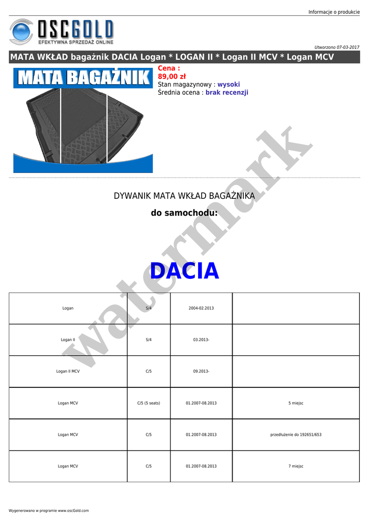 Informacje o produkcie Utworzono 07-03-2017 MATA WKŁAD bagażnik DACIA Logan * LOGAN II * Logan II MCV * Logan MCV Cena : 89,00 zł er m ar k Stan magazynowy : wysoki Średnia ocena : brak recenzji DYWANIK MATA WKŁAD BAGAŻNIKA do samochodu: at DACIA S/4 2004-02.2013 Logan II S/4 03.2013- Logan II MCV C/5 09.2013- Logan MCV C/5 (5 seats) 01.2007-08.2013 5 miejsc Logan MCV C/5 01.2007-08.2013 przedłużenie do 192651/653 Logan MCV C/5 01.2007-08.2013 7 miejsc w Logan Wygenerowano w programie www.oscGold.com ● Dywaniki bagażnikowe do samochodów wszystkich popularnych marek. Są wykonane z tworzyw sztucznych, idealnie dopasowane, doskonale zabezpieczą bagażnik samochodu przed zabrudzeniami i uszkodzeniami podczas przewożenia różnego rodzaju ładunków. Mają oryginalny kształt, który idealnie dopasowuje się do wnętrza i kształtu podłogi. Od spodu posiadają spód antypoślizgowy zapobiegający przemieszczaniu się dywanika. Guma z której wykonano dywaniki jest twarda i odporna na szybkie zniszczenie. Dywaniki posiadają wysoki rant, który zabezpiecza przed przelewaniem się wody na tapicerkę. Łatwe w utrzymaniu czystości. ● ● ● ● ● er m ar k ❍ Jest to produkt produkt polski spełniający wymagające normy partnerów zachodnich certyfikaty CERT TÜV Rheinland ISO 9001. w at Dokładne odwzorowanie bagażnika, elastyczne tworzywo wysokiej jakości odporne na działanie środków chemicznych i olejów, wysoki kołnierz ochronny (5,5 cm - 6 cm), żebrowana powierzchnia, wkład antypoślizgowy. w at er m ar k Informacje o produkcie Wygenerowano w programie www.oscGold.com er m ar k at w Informacje o produkcie w at er m ar k Wszystkie dywaniki samochodowe do bagażnika objęte są gwarancją dopasowania. Oznacza to, że zakupiona mata do bagażnika dedykowana dla danego samochodu będzie dokładnie odwzorowywać kształt typowego bagażnika bez przeróbek czy zmian konstrukcyjnych. Szczegółowe warunki gwarancji dopasowania dla wykładziny do bagażnika w zakładce gwarancja dopasowania u dołu strony. Wygenerowano w programie www.oscGold.com er m ar k at w w at er m ar k Informacje o produkcie Wygenerowano w programie www.oscGold.com w at er m ar k Dywaniki są trwałe i wytrzymałe, wodoodporne, wyposażone w centralnej części w mate antypoślizgową mają estetyczne i wyraźnie zaznaczone miejsca na wycięcie otworów na pasy ładunkowe.