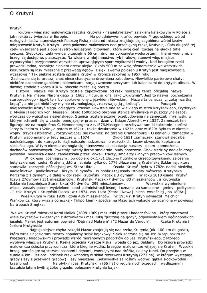 O Krutyni Krutyń Krutyń - wieś nad malowniczą rzeczką Krutynia - najpiękniejszym szlakiem kajakowym w Polsce a jak niektórzy twierdza w Europie. Na południowym krańcu powiatu Mrągowskiego wśród rozległych lasów stanowiących Puszczę Piską z dala od miasta znajduje się zagubiona wśród lasów miejscowość Krutyń. Krutyń - wieś położona malowniczo nad przepiękną rzeką Krutynią . Cała długość tej rzeki wysadzana jest z obu jej stron liściastymi drzewami, które swój cień rzucają na gładką tafle rzeczną. Głębokość rzeki wynosi przeciętnie 65 cm, dno ma porośnięte wodorostami i liliami wodnymi, a brzegi są dostępne, piaszczyste. Na wiosnę w niej mnóstwo ryb i raków, stanowi więc miejsce wypoczynku i przyjemności wszystkich uprawiających sport wędkarski i wodny. Nad brzegiem rzeki prowadzi ładna, osłonięta cieniem drzew alejka. Około 500 m za wsią równomiernie we wszystkich kierunkach są lasy mieszane z przewagą dębów. Dzięki swemu położeniu Krutyń jest miejscowością wczasową." Tak pięknie została opisana Krutyń w Kronice szkolnej w 1957 roku. Zachowała się tu urocza, choć nieco chaotyczna drewniana zabudowa. Niewielkie parterowe chaty, niektóre ozdobione gankiem i okiennicami, stoją zwrócone szczytami lub kalenicami do krętych uliczek. W dawnej stodole z końca XIX w. obecnie mieści się poczta Historia Nazwa wsi Krutyń została zapożyczona od rzeki noszącej teraz oficjalną nazwę Krutynia. Na mapie Narońskiego z 1663r. Figuruje ona jako ,,Krutynia''. Jest to nazwa pochodzenia staropruskiego - język ten był spokrewniony z językiem litewskim. Nazwa ta oznacza ,,rzekę wartką i krętą'' , a nie jak niektórzy mylnie etymologizują , nazywając ją ,,krótką''. Początek miejscowości Krutyń sięga odległych czasów. Powstała ona za wielkiego mistrza krzyżackiego, Fryderyka z Myśnii [Friedrich von Meissen], około 1500r.joko obronna stanica myśliwska w puszczy ,należącej wówczas do wujostwa siesieńskiego. Stanica została później przebudowana na zameczek myśliwski, w którym schronił się w czasie panującej w prusiech dżumy, Książe Albrecht w r.1527. Zameczek ten figuruje też na mapie Prus C. Hennenbergera z r.1576.Następnie przebywał tam kilkakrotnie kurfirst Jerzy Wilhelm w 1620r., a potem w 1621r., także dwukrotnie w 1627r. oraz w1629r.Było to w okresie wojny trzydziestoletniej , rozgrywającej się również na terenie Brandenburgii. O istnieniu zameczka w Krutyni wspomniano w tedy jeszcze w r.1674. Około 1651r.zameczek stanowił siedzibę nadleśniczego , do którego funkcji należało nadzorowanie wszystkich lasów obwodzie kapitanatu siesieńskiego. W tym okresie wzmogła się intensywna eksploatacja puszczy celem pomnożenia dochodów państwowych. Powstały wtedy liczne smolarnie ,budy potażowe. Obok siedziby nadleśniczego powstała niewielka osada, zamieszkała przez drwali, traczy, smolarzy i innych pracowników leśnych. W okresie późniejszym , bo dopiero ok.1751 zlecono hutnikowi Grzegorzewskiemu założenie huty szkła nad rzeką Krutynią ,która istniała tylko do 1776r.Nazwano ją Krutyńską Szklarnią , która stanowiła zaczątek późniejszej wsi Stara Ukta . Osada Krutyń była w 1782r. nadal siedzibą nadleśnictwa i podleśnictwa , liczyła 16 dymów . W pobliżu tej osady istniała wówczas Krutyńska Karczma z 1 dymem , a dalej w dół rzeki Krutyński Piecek z 3 dymami. W roku 1818 osada Krutyń liczyła 27dymów i 151 mieszkańców , Krutyński Piecek -7 dymów i33 mieszkańców , a Krutyńska Szklarnia [późniejsza Stara Ukta]-30 dymów 299 mieszkańców . Wszystkie wymienione wioski zostały potem wydzielone spod administracji leśnej i uznane za samoistne gminy polityczne . I tak Krutyń i Krutyński Piecek w r.1874, zaś Ukta [Stara i Nowa] nieco wcześniej , bo 1806r.] Wieś Krutyń w roku 1939 liczyła 436 mieszkańców. W 1934 r. Krutyń odwiedził Melchior Wańkowicz, który wraz z córeczką - Tirliporkiem - spędzał na Mazurach wakacje uwiecznione w powieści Na tropach Smętka. We wsi Krutyń mieszkał Karol Małłek (1898-1969) mazurski pisarz i badacz folkloru, który zanotował wiele zwyczajów związanych z dożynkami i mazurską "jutrznią na gody", odpowiednikiem ogólnopolskich jasełek. Małłek jest autorem powieści "Dąb nad Mukrem" i "2 Mazur do Verdun". Rzeka Krutynia i Jezioro Krutyńskie Najpiękniejsze chyba zakątki Mazur znajdują się nad rzeką Krutynią (ok. 100 km długości), która wraz 17 jeziorami tworzy popularny szlak kajakowy. Szlak zaczyna się na Jeż. Warpuńskim na Pojezierzu Mrągowskim i prowadzi wśród morenowych pagórków do Jeż. Krutyńskiego, z którego wypływa właściwa Krutynią. Rzeka przecina Puszczę Piska i wpada do jeż. Bełdany. Do jeziora prowadzi malownicza ścieżka przyrodnicza, która biegnie wzdłuż brzegów malowniczo wijącej się Krutyni. Wysokie brzegi porośnięte są starymi sosnami i dębami, tworzącymi nad dróżką zielony tunel. Do przejścia w sumie 4 km. Jezioro i odcinek rzeki wchodzą w skład rezerwatu Krutynią (273 ha), w którym występują grądy (lasy z przewagą grabów) i lasy mieszane. Ciekawostką są rośliny wodne: gąbka słodkowodna i krasnorost. Na płytkim Jeż. Krutyńskim (55 ha) o regularnych brzegach i wydłużonym kształcie latem kwitną żółte grążele. polecamy krutynia kajaki http://www.krutynia.com.pl Kreator PDF Utworzono 7 March, 2017, 07:26