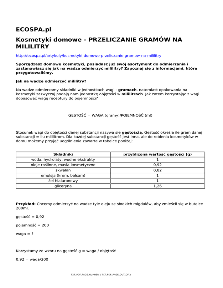 ECOSPA.pl Kosmetyki domowe - PRZELICZANIE GRAMÓW NA